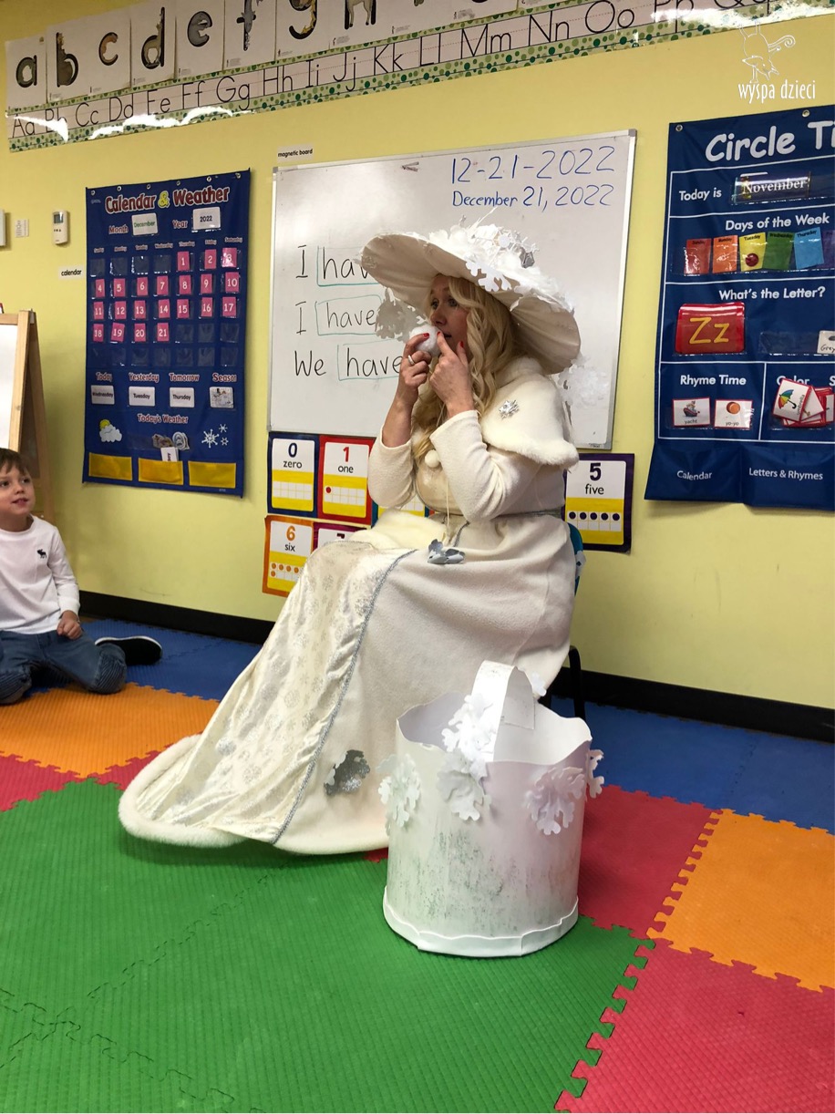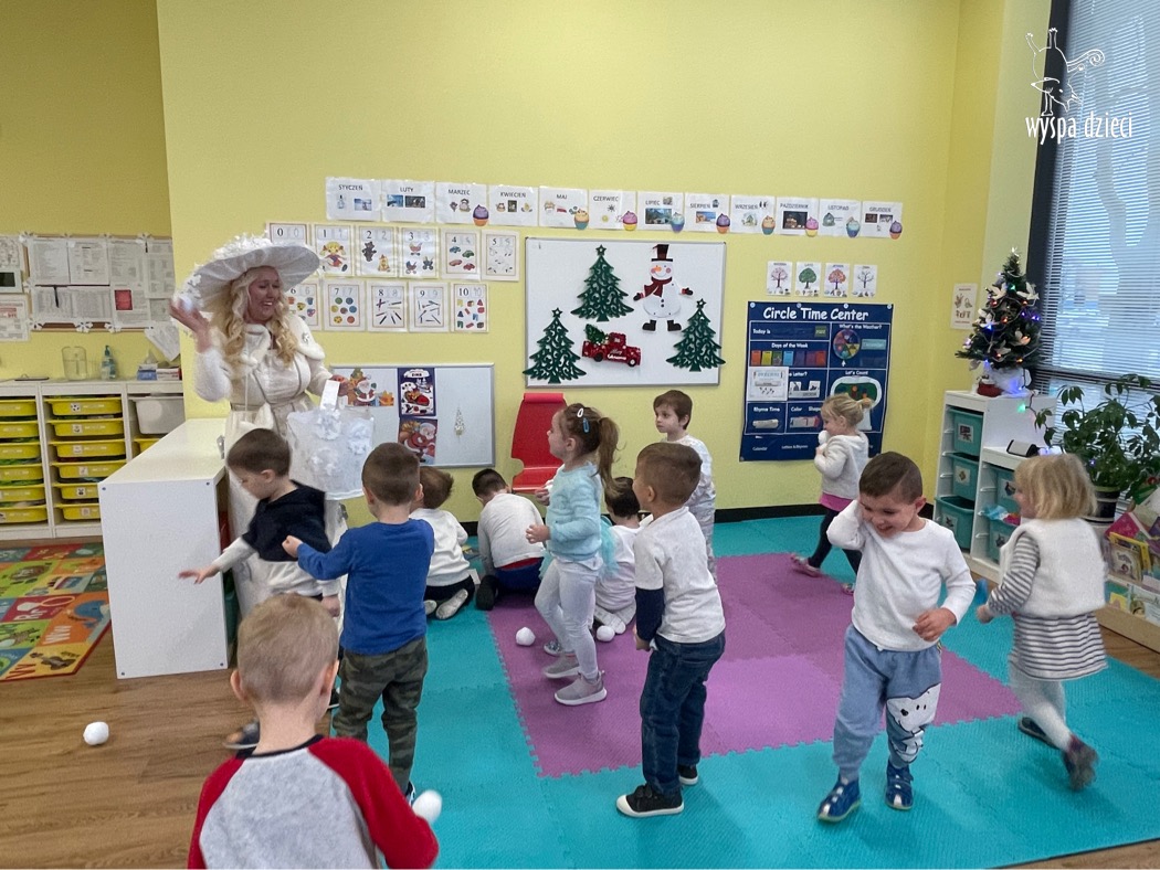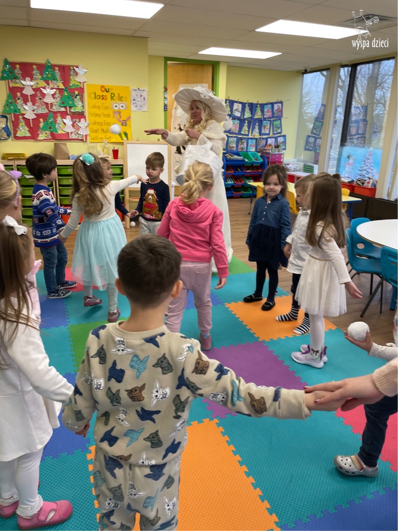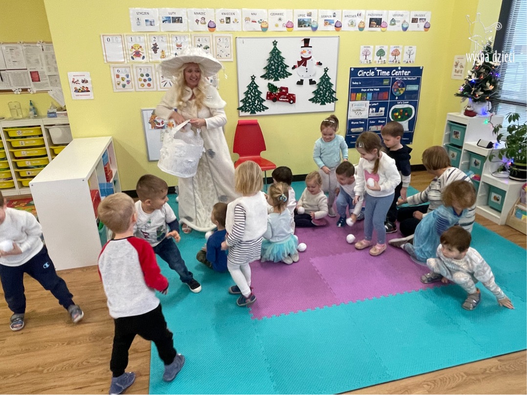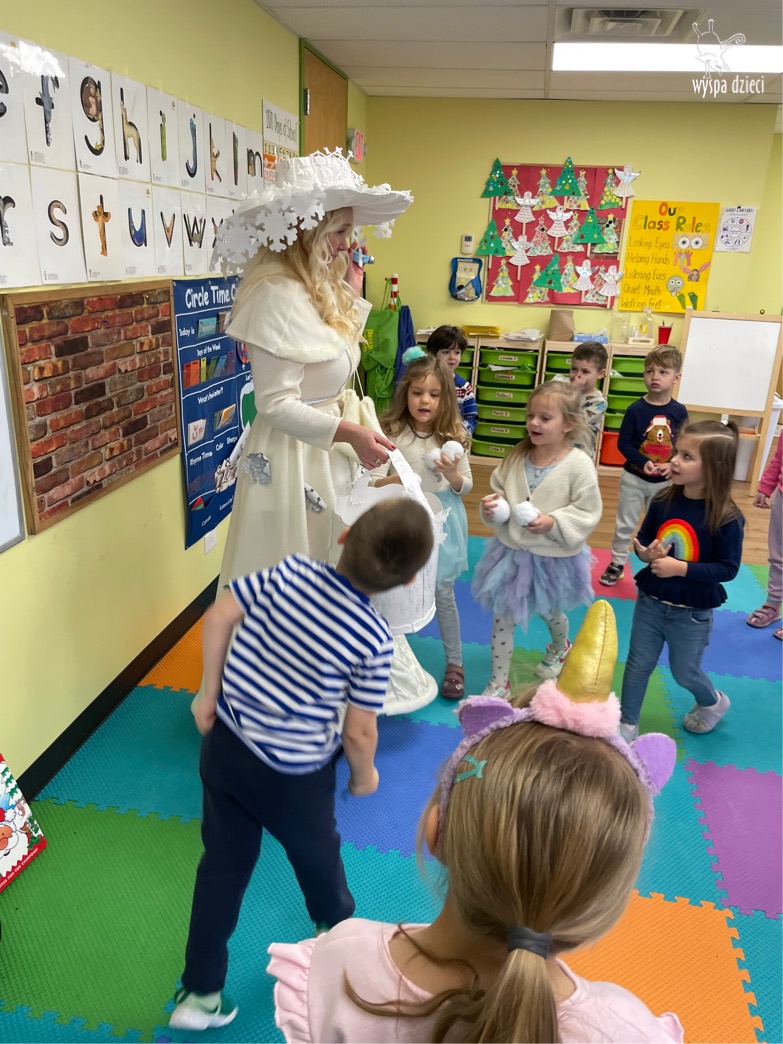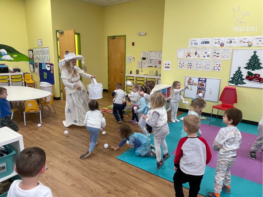 Dnia 21 grudnia 2022 roku, naszą Wyspę Dzieci w River Grove odwiedziła Pani Zima. Wizyta odbyła się pod hasłem: „My się zimy nie boimy i wesoło się bawimy”. Pani Zima odwiedziła każdą grupę. Wchodząc do naszych klas śpiewała piosenkę „Zima , zima, zima pada, pada śnieg”. Od najmłodszej grupy – Misie po najstarsze grupy kindergarten, wszyscy od razu przyłączyli się do wspólnego śpiewania tej piosenki. Pani Zima urządziła nam również zawody w rzucaniu śnieżkami. Ale było wesoło !!!!! Następnie omówiła z dziećmi zasady bezpiecznych zabaw, sposoby ubierania się i dbania o zdrowie, gdy na dworze jest zimno, a także jak ważne jest dokarmianie zwierząt. Przeczytała nam bardzo mądry tekst o dokarmianiu ptaszków i zachęciła nas do przygotowania dla nich karmników. Przygotowała dla naszych przedszkolaków zimowe rymowanki oraz zagadki. Wszyscy bardzo wesoło spędzili czas i obiecali, że wkrótce na naszym placu zabaw staną duże, piękne bałwany. Dziękujemy Pani Zimo za wspaniałą zabawę. Teraz czekamy tylko na Święta i śnieg 🙂 A podobno już jutro ma być go bardzo dużo !!!!