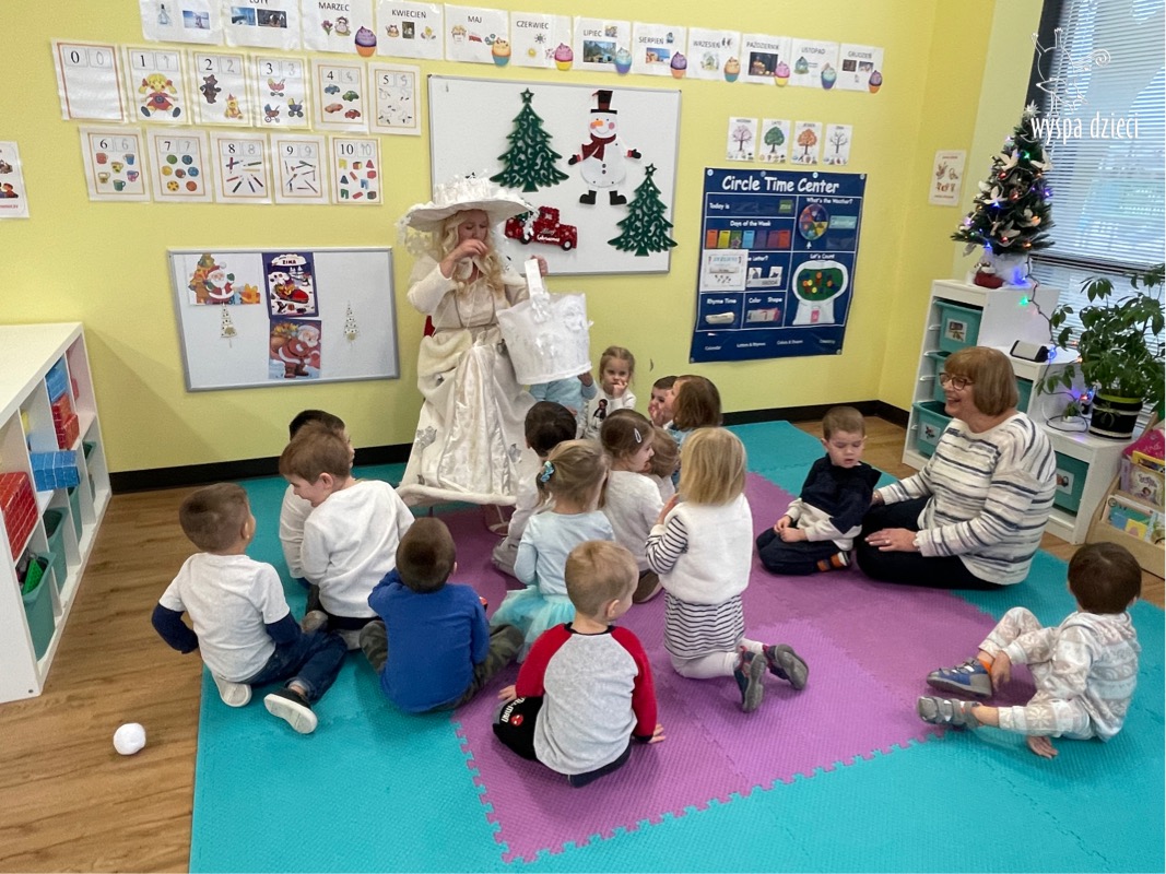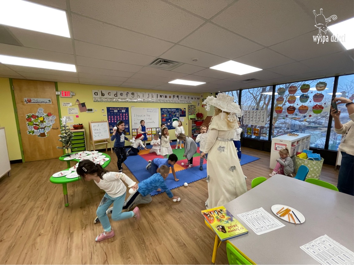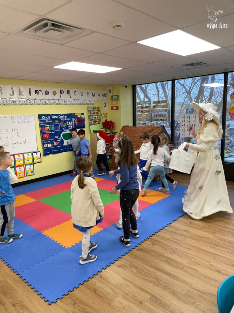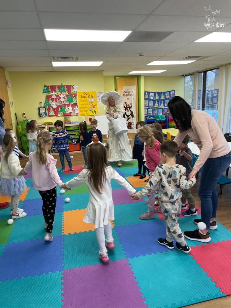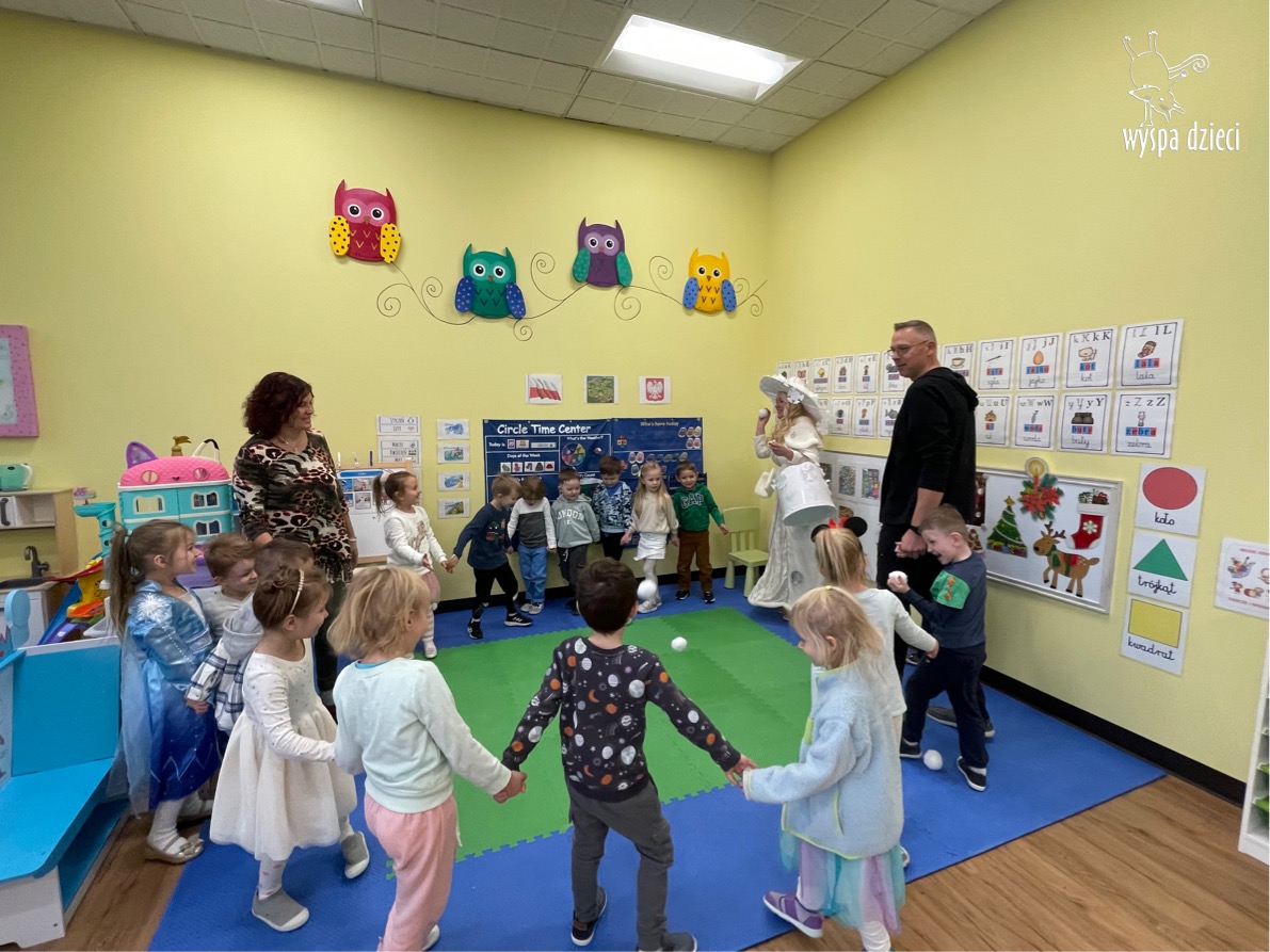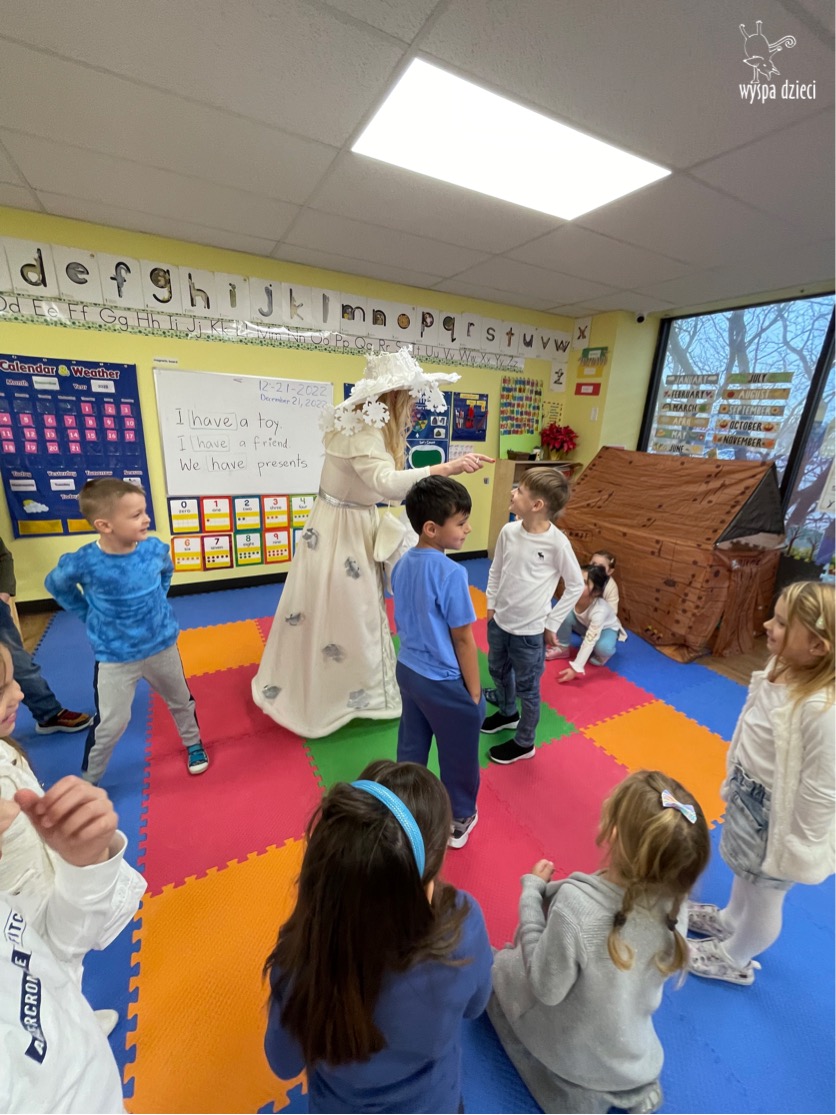 Dnia 21 grudnia 2022 roku, naszą Wyspę Dzieci w River Grove odwiedziła Pani Zima. Wizyta odbyła się pod hasłem: „My się zimy nie boimy i wesoło się bawimy”. Pani Zima odwiedziła każdą grupę. Wchodząc do naszych klas śpiewała piosenkę „Zima , zima, zima pada, pada śnieg”. Od najmłodszej grupy – Misie po najstarsze grupy kindergarten, wszyscy od razu przyłączyli się do wspólnego śpiewania tej piosenki. Pani Zima urządziła nam również zawody w rzucaniu śnieżkami. Ale było wesoło !!!!! Następnie omówiła z dziećmi zasady bezpiecznych zabaw, sposoby ubierania się i dbania o zdrowie, gdy na dworze jest zimno, a także jak ważne jest dokarmianie zwierząt. Przeczytała nam bardzo mądry tekst o dokarmianiu ptaszków i zachęciła nas do przygotowania dla nich karmników. Przygotowała dla naszych przedszkolaków zimowe rymowanki oraz zagadki. Wszyscy bardzo wesoło spędzili czas i obiecali, że wkrótce na naszym placu zabaw staną duże, piękne bałwany. Dziękujemy Pani Zimo za wspaniałą zabawę. Teraz czekamy tylko na Święta i śnieg 🙂 A podobno już jutro ma być go bardzo dużo !!!!