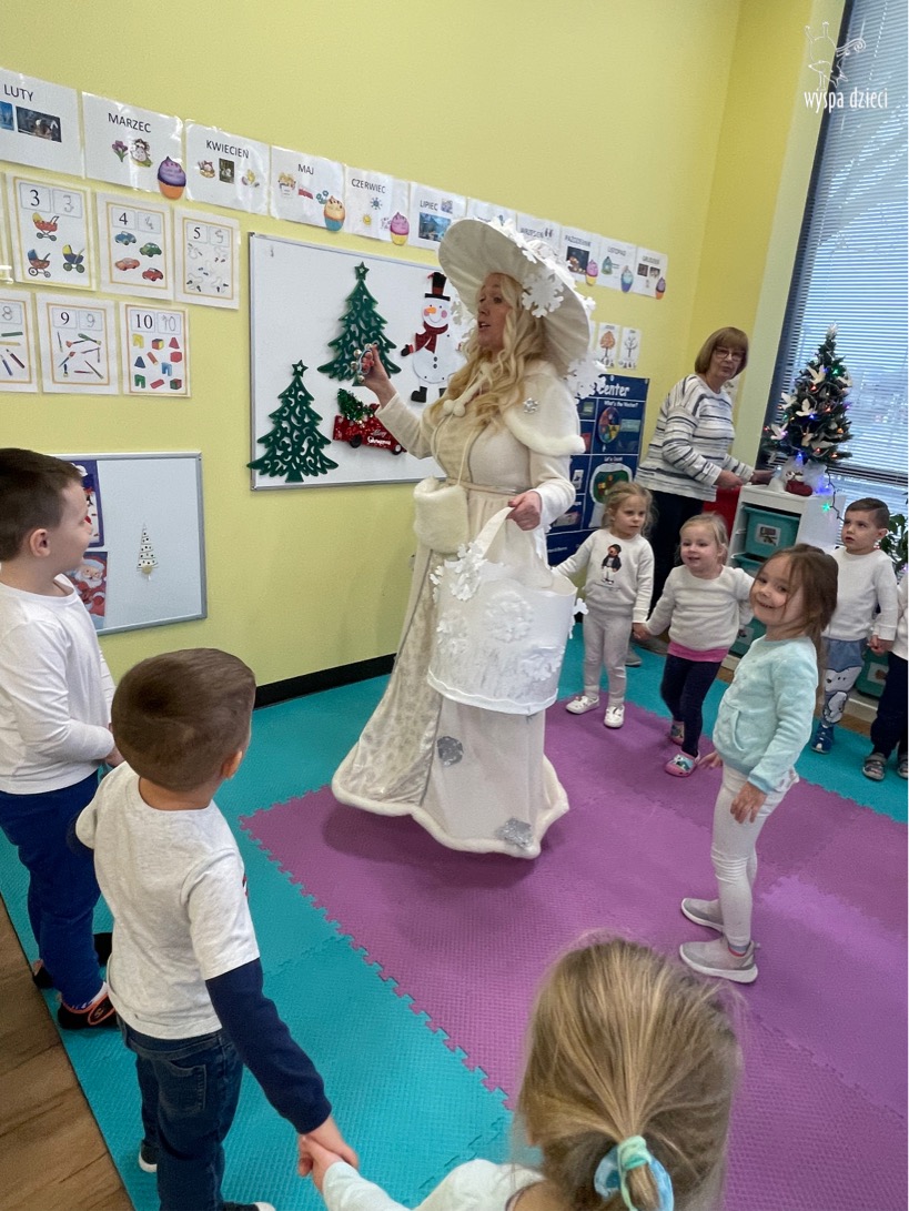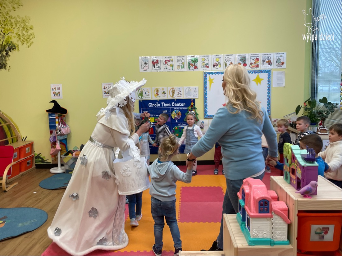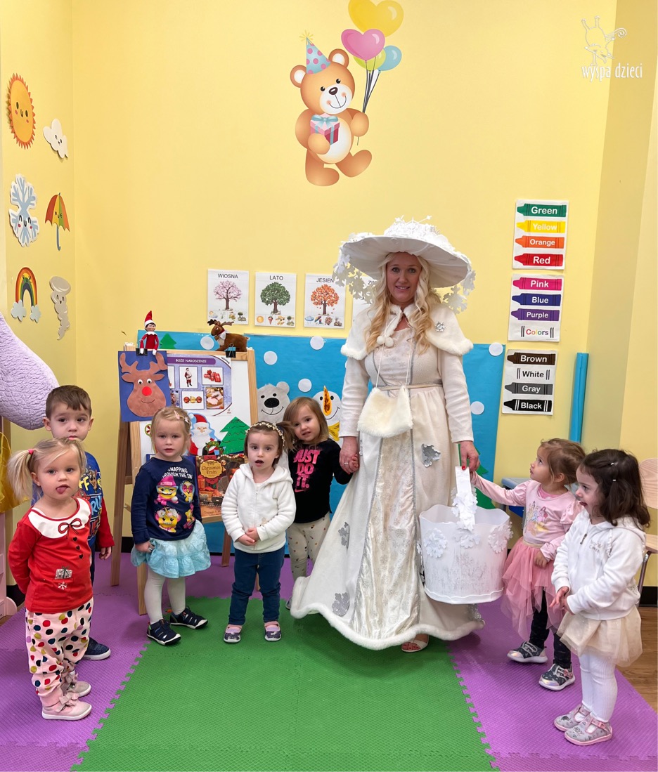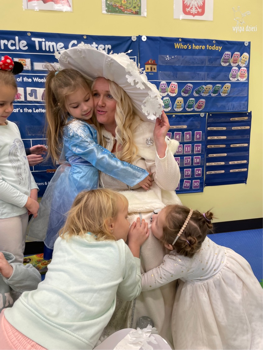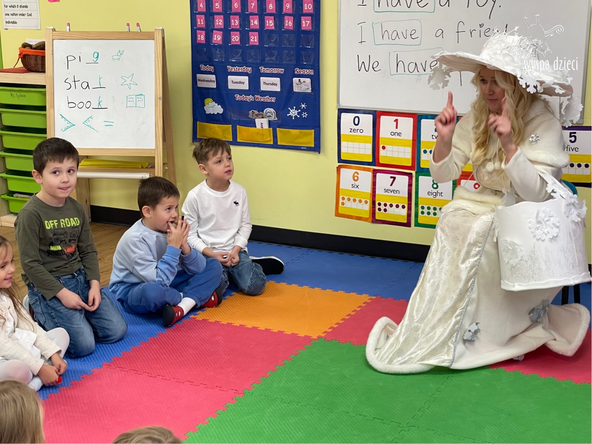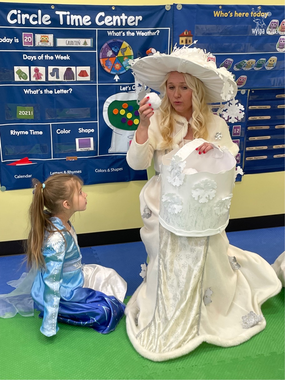 Dnia 21 grudnia 2022 roku, naszą Wyspę Dzieci w River Grove odwiedziła Pani Zima. Wizyta odbyła się pod hasłem: „My się zimy nie boimy i wesoło się bawimy”. Pani Zima odwiedziła każdą grupę. Wchodząc do naszych klas śpiewała piosenkę „Zima , zima, zima pada, pada śnieg”. Od najmłodszej grupy – Misie po najstarsze grupy kindergarten, wszyscy od razu przyłączyli się do wspólnego śpiewania tej piosenki. Pani Zima urządziła nam również zawody w rzucaniu śnieżkami. Ale było wesoło !!!!! Następnie omówiła z dziećmi zasady bezpiecznych zabaw, sposoby ubierania się i dbania o zdrowie, gdy na dworze jest zimno, a także jak ważne jest dokarmianie zwierząt. Przeczytała nam bardzo mądry tekst o dokarmianiu ptaszków i zachęciła nas do przygotowania dla nich karmników. Przygotowała dla naszych przedszkolaków zimowe rymowanki oraz zagadki. Wszyscy bardzo wesoło spędzili czas i obiecali, że wkrótce na naszym placu zabaw staną duże, piękne bałwany. Dziękujemy Pani Zimo za wspaniałą zabawę. Teraz czekamy tylko na Święta i śnieg 🙂 A podobno już jutro ma być go bardzo dużo !!!!