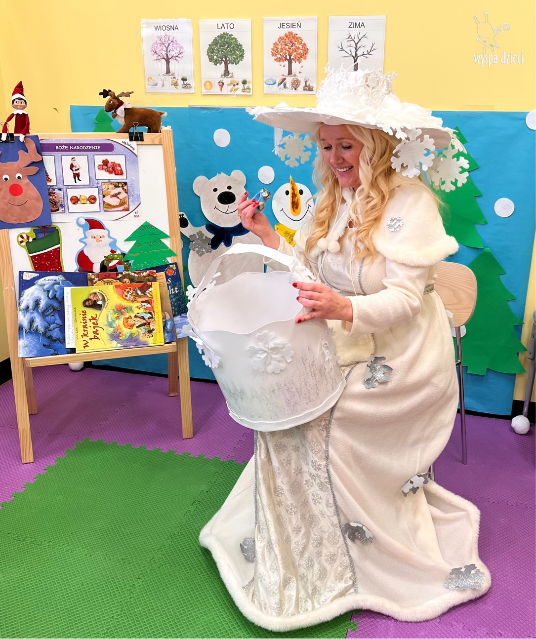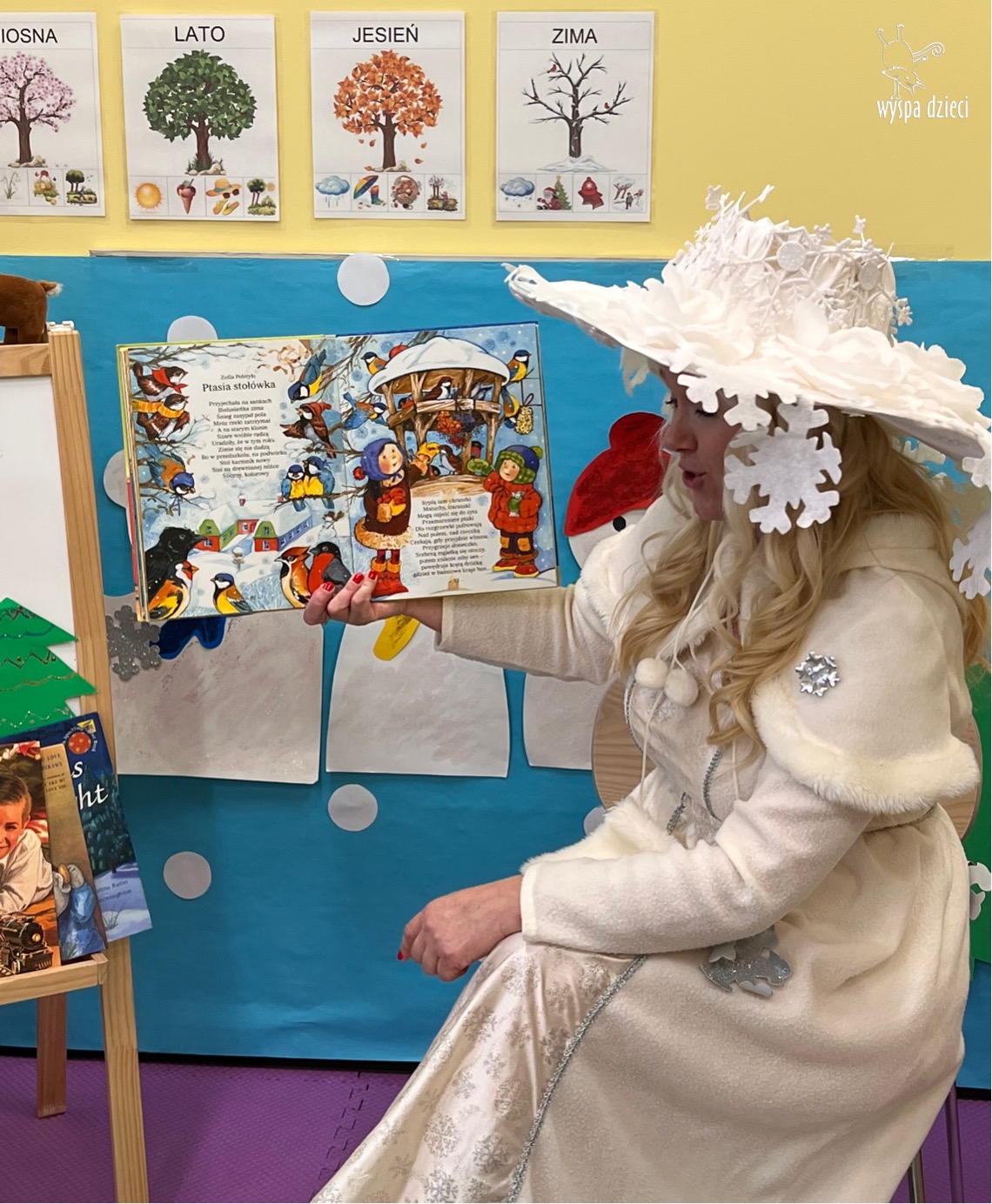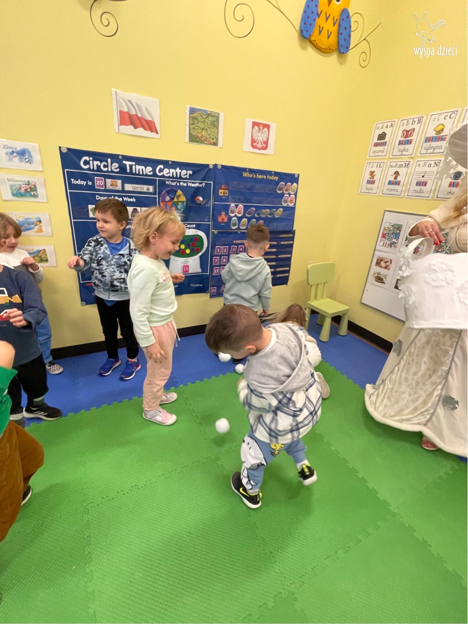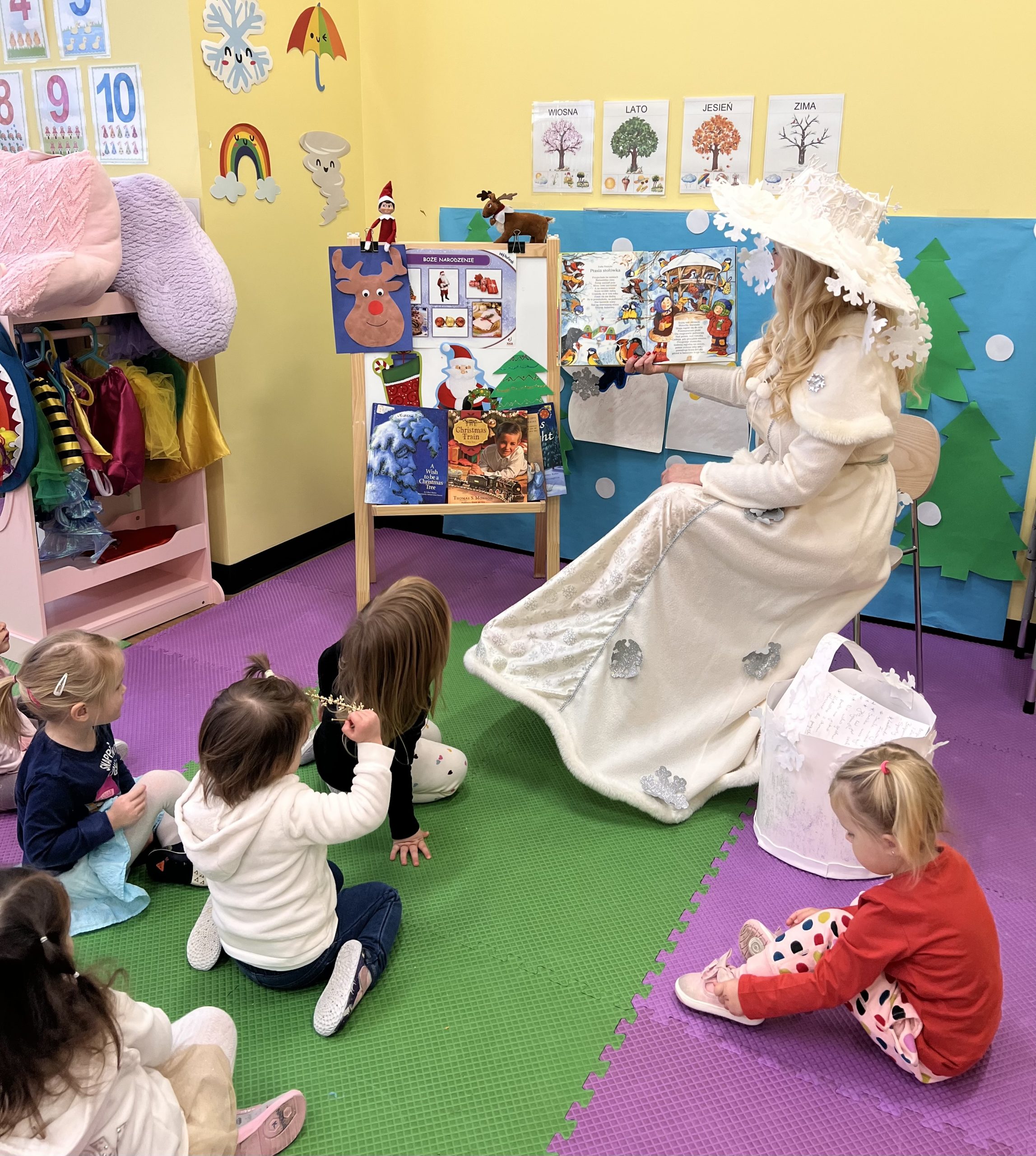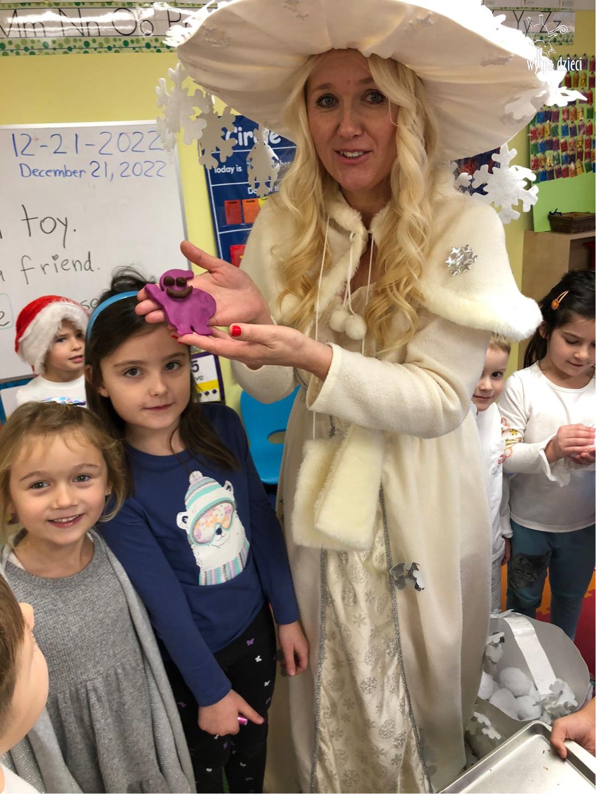 Dnia 21 grudnia 2022 roku, naszą Wyspę Dzieci w River Grove odwiedziła Pani Zima. Wizyta odbyła się pod hasłem: „My się zimy nie boimy i wesoło się bawimy”. Pani Zima odwiedziła każdą grupę. Wchodząc do naszych klas śpiewała piosenkę „Zima , zima, zima pada, pada śnieg”. Od najmłodszej grupy – Misie po najstarsze grupy kindergarten, wszyscy od razu przyłączyli się do wspólnego śpiewania tej piosenki. Pani Zima urządziła nam również zawody w rzucaniu śnieżkami. Ale było wesoło !!!!! Następnie omówiła z dziećmi zasady bezpiecznych zabaw, sposoby ubierania się i dbania o zdrowie, gdy na dworze jest zimno, a także jak ważne jest dokarmianie zwierząt. Przeczytała nam bardzo mądry tekst o dokarmianiu ptaszków i zachęciła nas do przygotowania dla nich karmników. Przygotowała dla naszych przedszkolaków zimowe rymowanki oraz zagadki. Wszyscy bardzo wesoło spędzili czas i obiecali, że wkrótce na naszym placu zabaw staną duże, piękne bałwany. Dziękujemy Pani Zimo za wspaniałą zabawę. Teraz czekamy tylko na Święta i śnieg 🙂 A podobno już jutro ma być go bardzo dużo !!!!