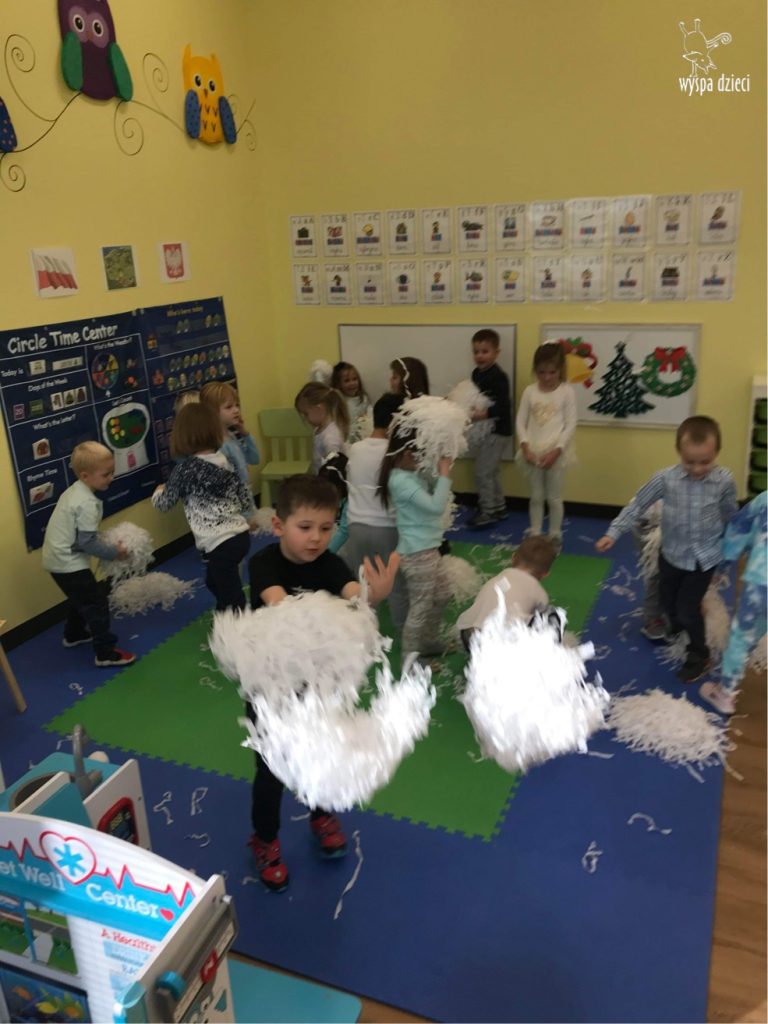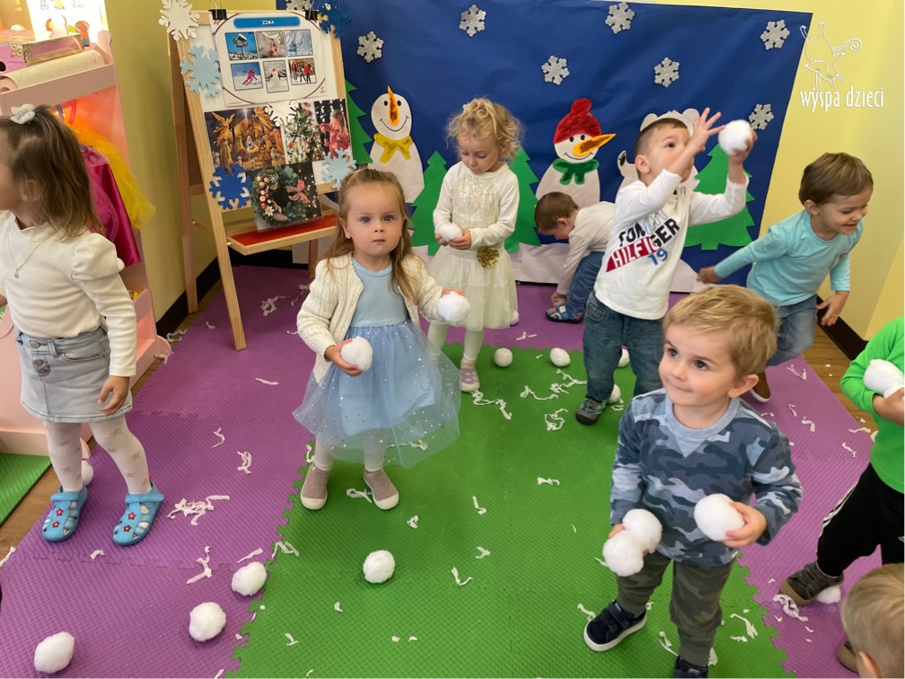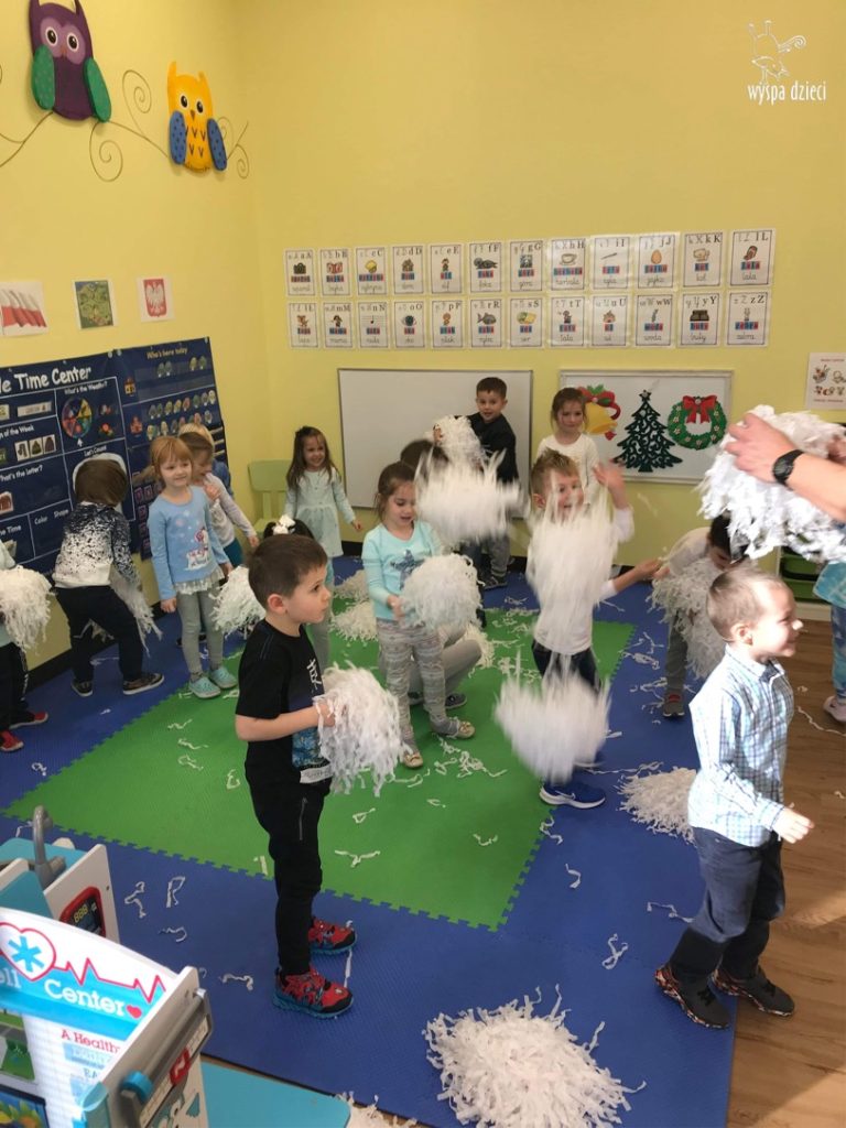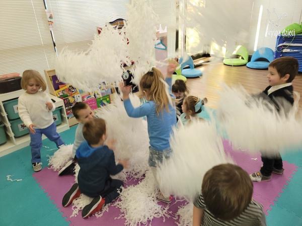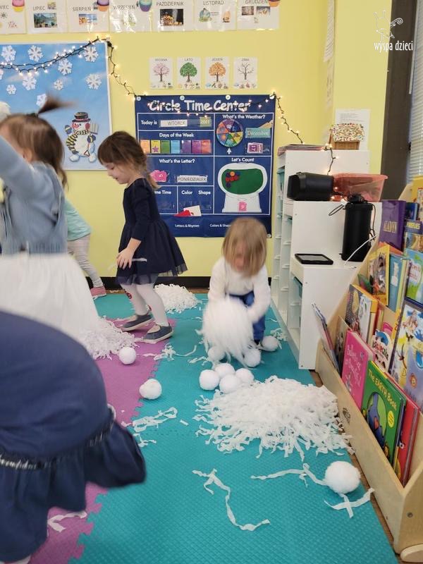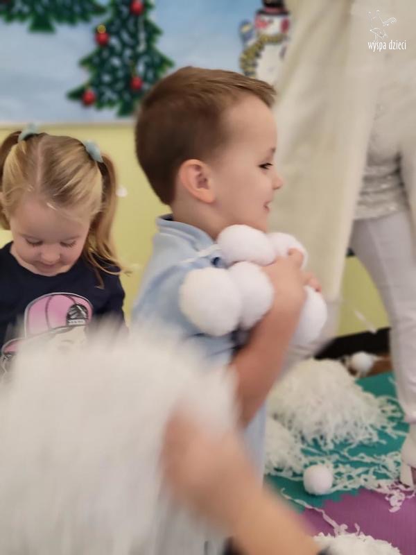 Na pożegnanie Pani Zima obsypywała dzieci „ciepłym śniegiem” w postaci kul z waty.