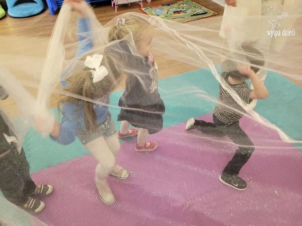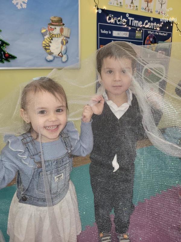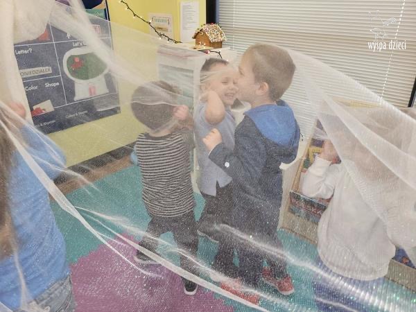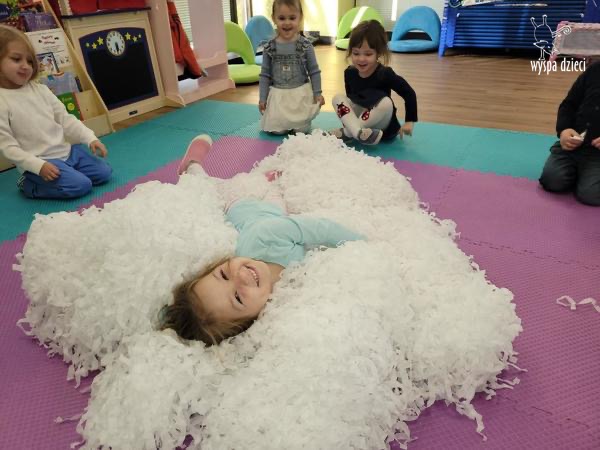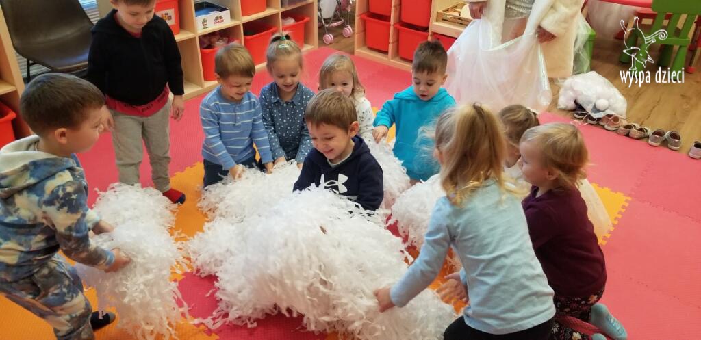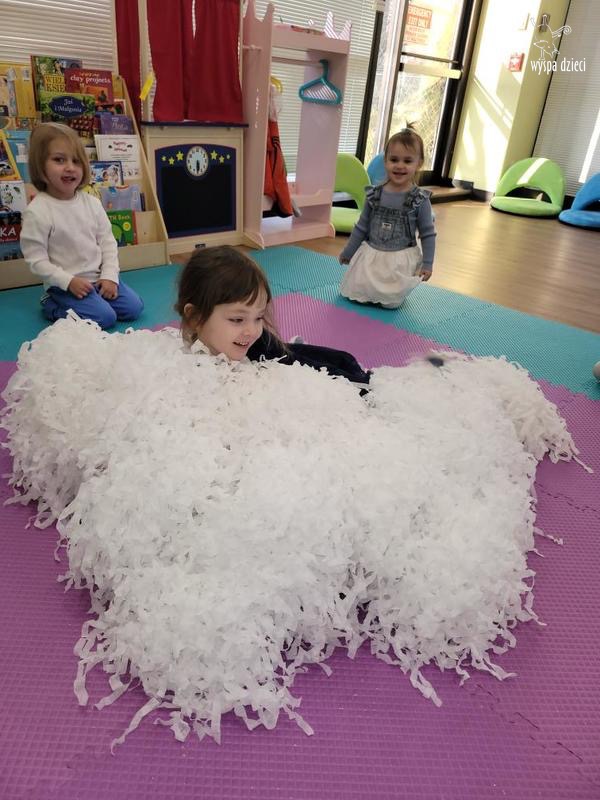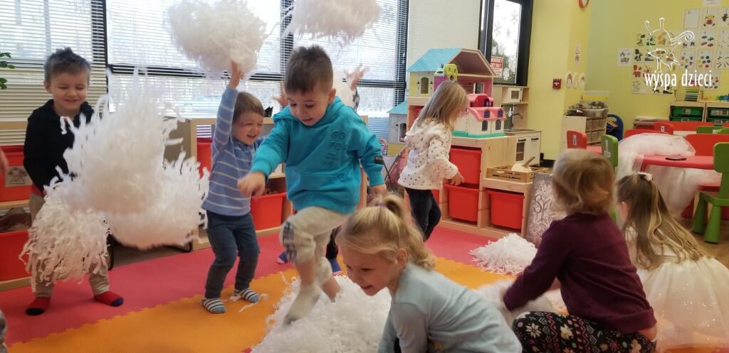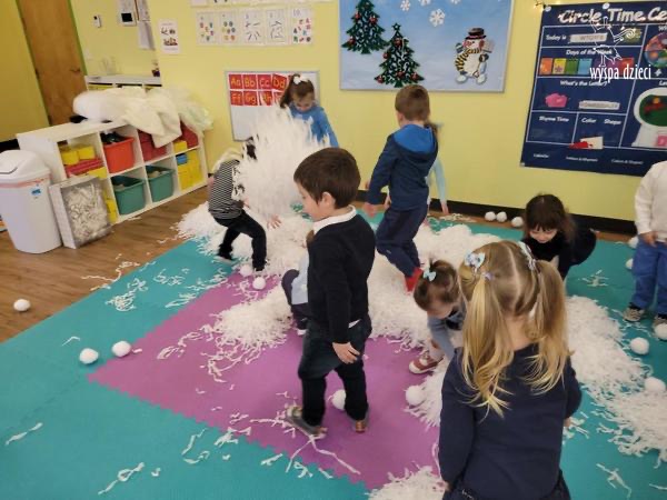 Na pożegnanie Pani Zima obsypywała dzieci „ciepłym śniegiem” w postaci kul z waty.