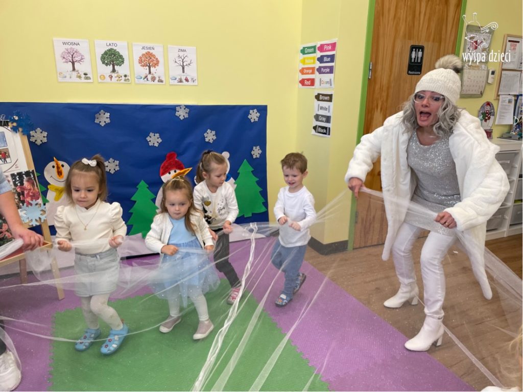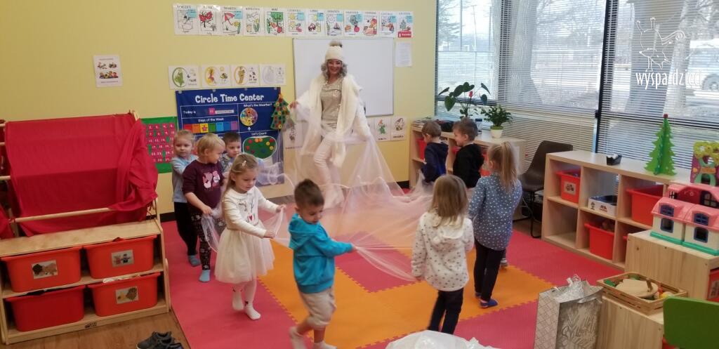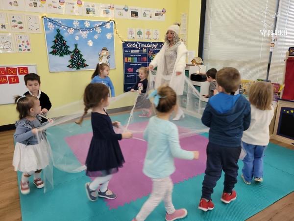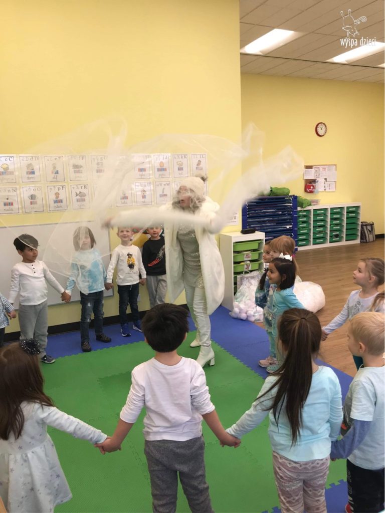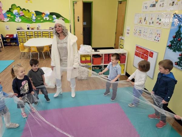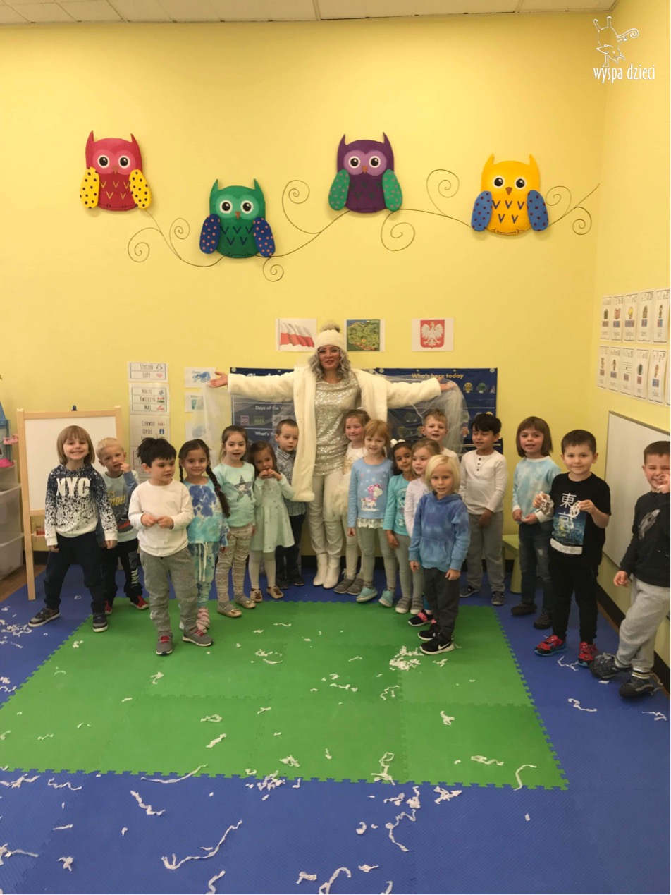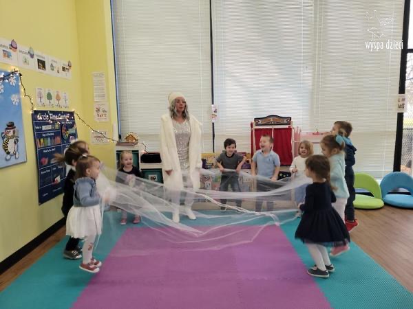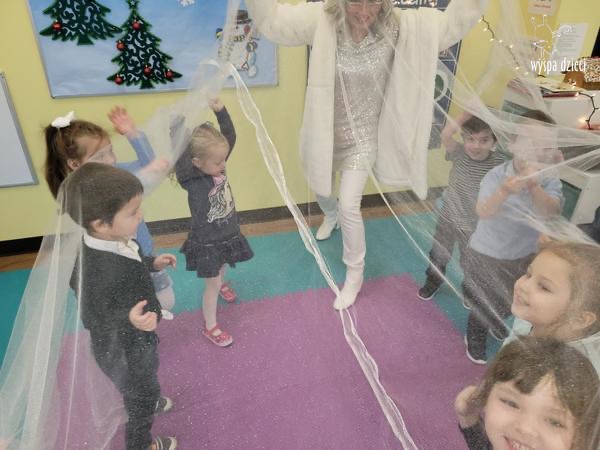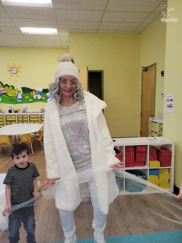Była to taka nowoczesna Pani Zima ?. Miała zimowe srebrne włosy oraz moc niespodzianek. Odwiedziła każdą grupę i przygotowała dla dzieci mnostwo zimowych zabaw, były również wspólne tańce 🙂