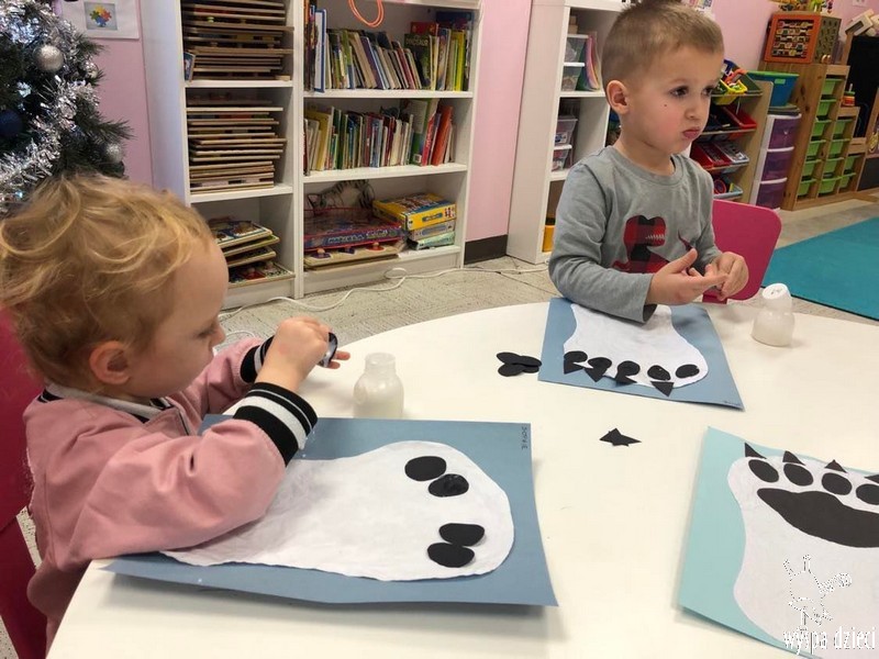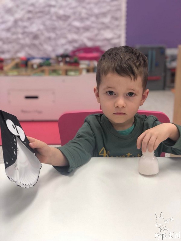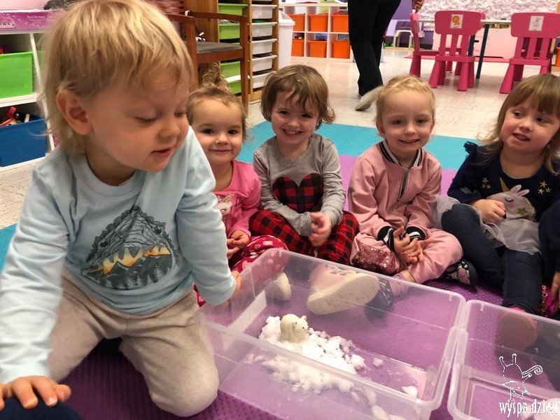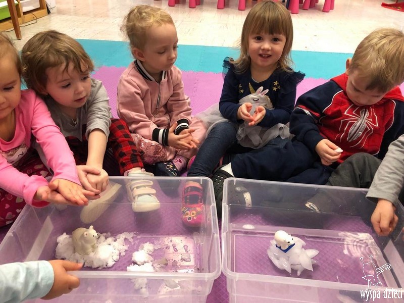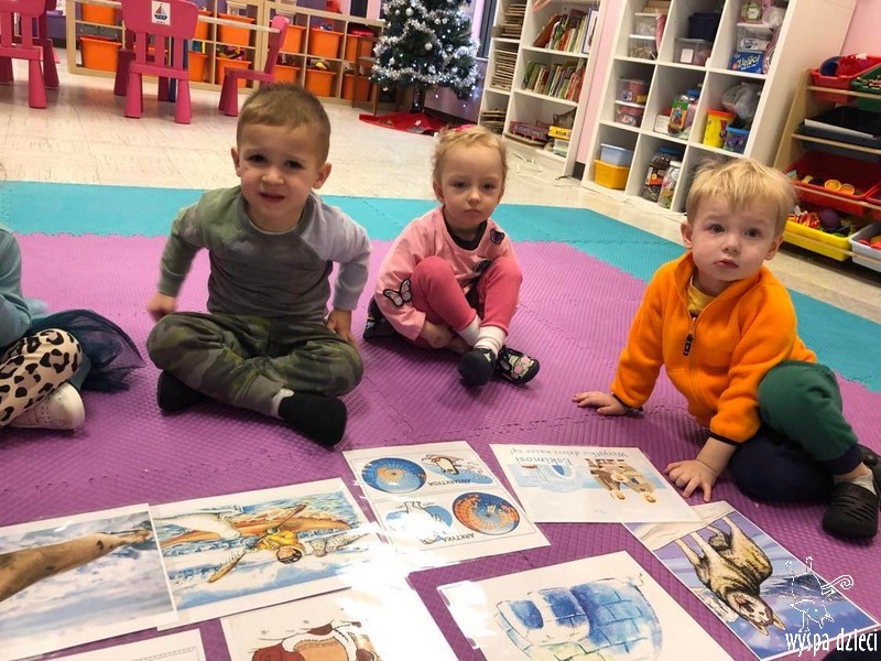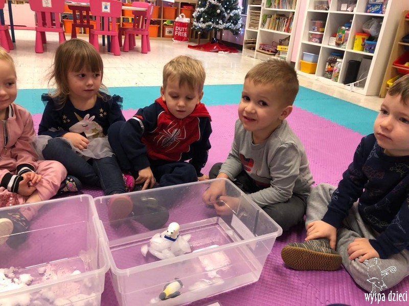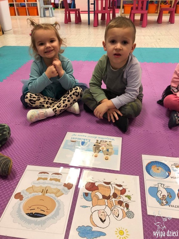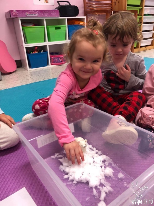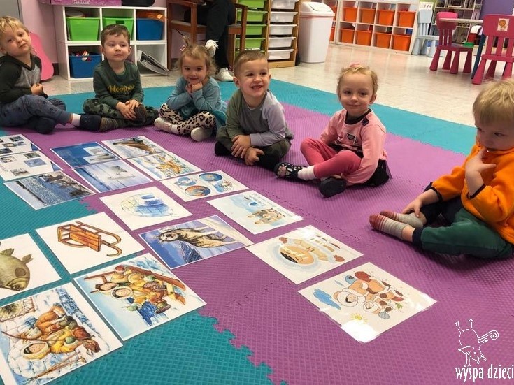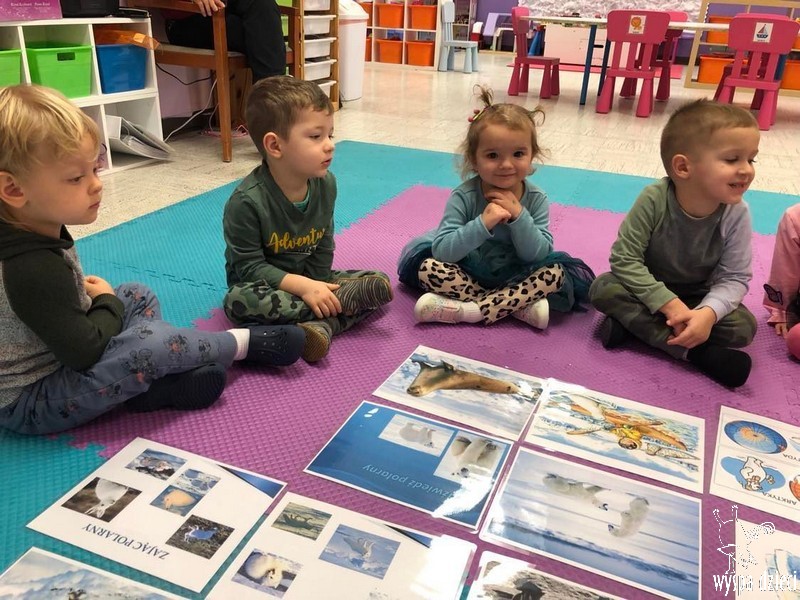 Przedszkolaki zapoznały się z życiem Eskimosów, dowiedziały się również o mieszkających tam zwierzętach- poznały ich wygląd oraz słuchały odgłosów, jakie wydają.