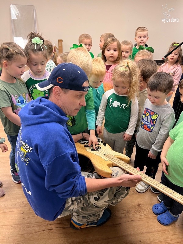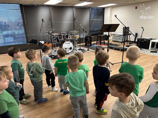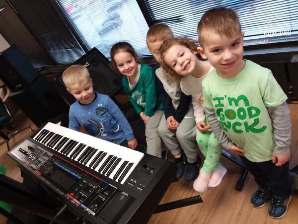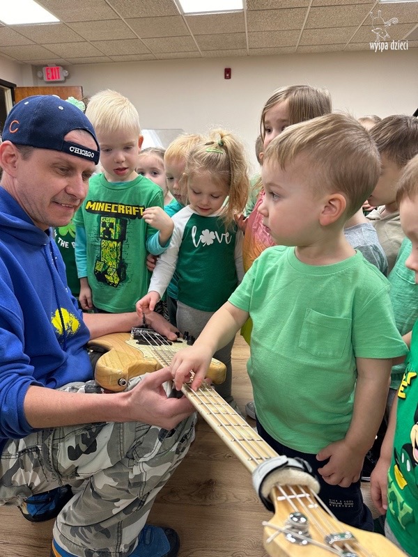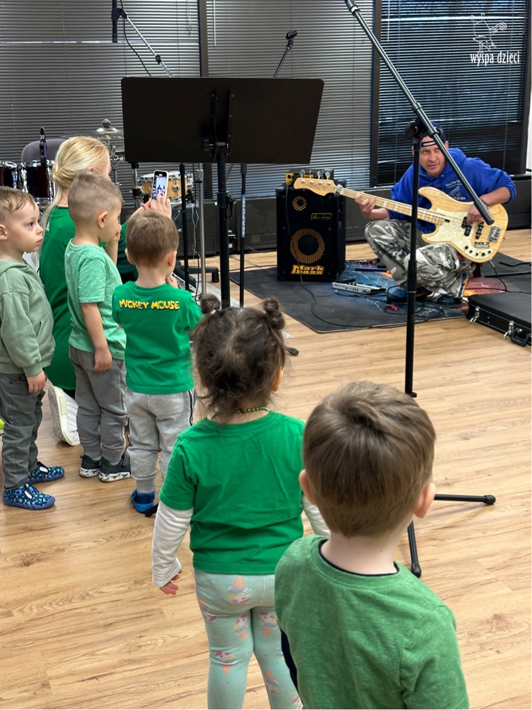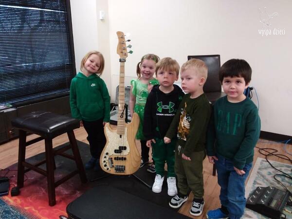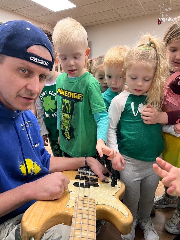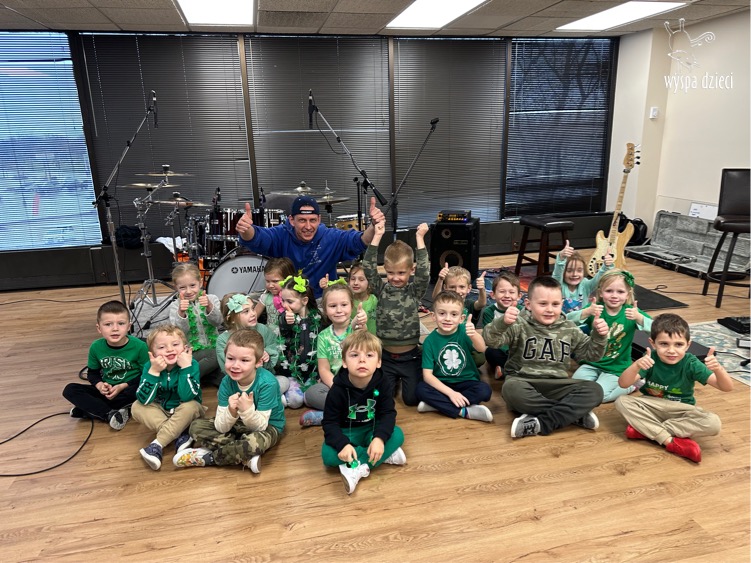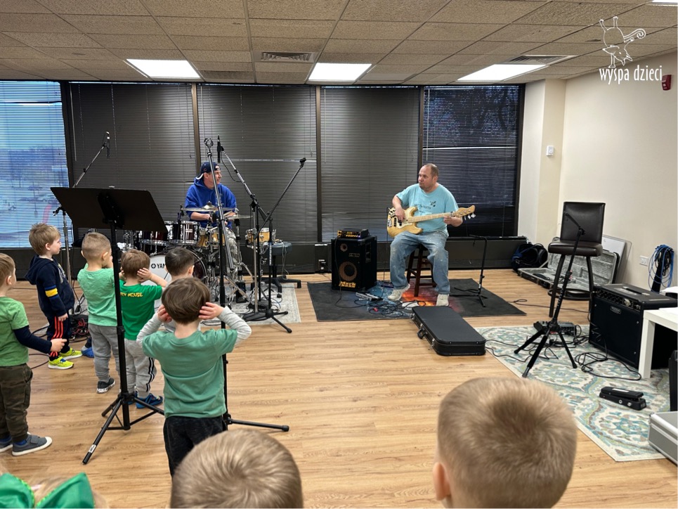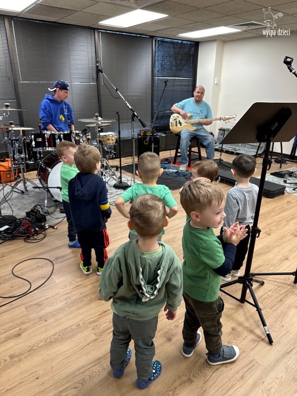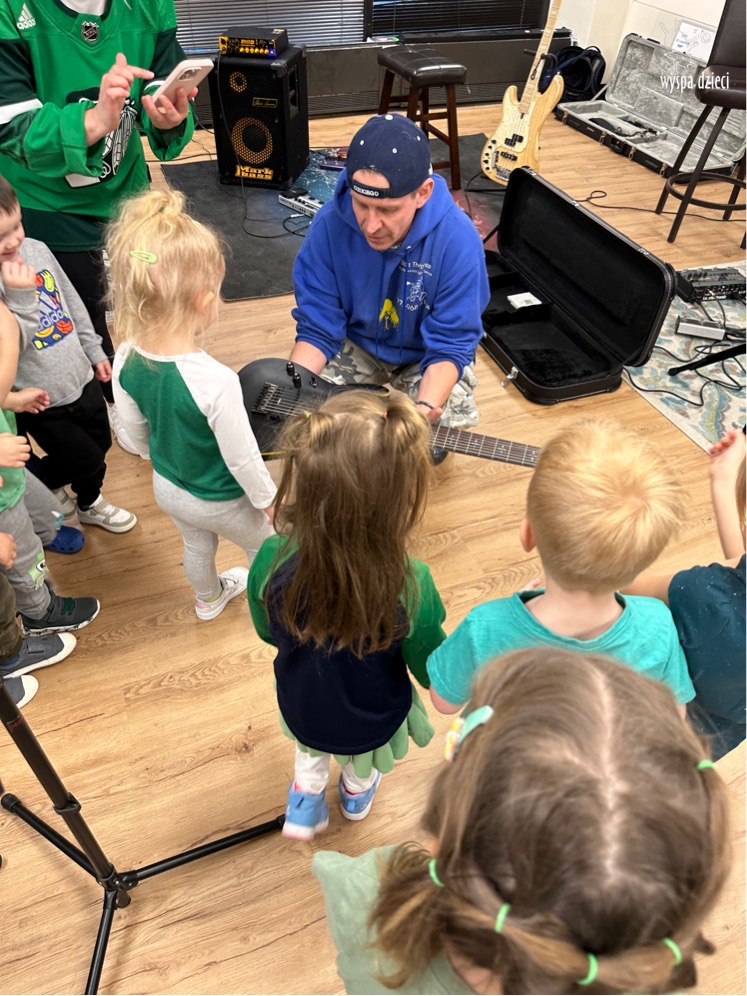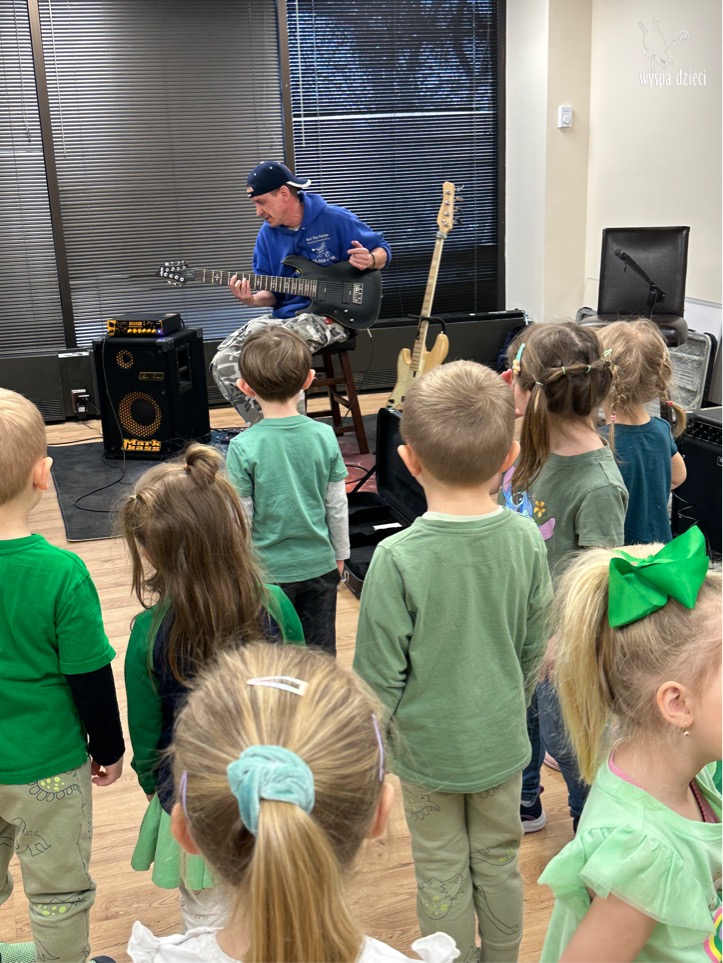 Młodsze grupy przedszkolakow z Wyspy Dzieci River Grove, dzięki uprzejmości Pana Bartka i Wojtka mogły choć chwile poczuć się jak prawdziwi muzycy. Odwiedzili miejsce w którym zobaczyli instrumenty na którym grają muzycy . Usłyszeli i zobaczyli różnice pomiędzy gitara elektryczna, a gitara basowa. Dowiedzieli się, z czego składa się perkusja. Jak również mogli zobaczyć różnice pomiędzy pianinem klasycznym a elektrycznym. Dzieci patrzyły z zapartym tchem jak Pan Bartek opowiadał o instrumentach i grał na nich. Dziekujemy za możliwość zobaczenia Waszego zaczarowanego muzycznego królestwa.
