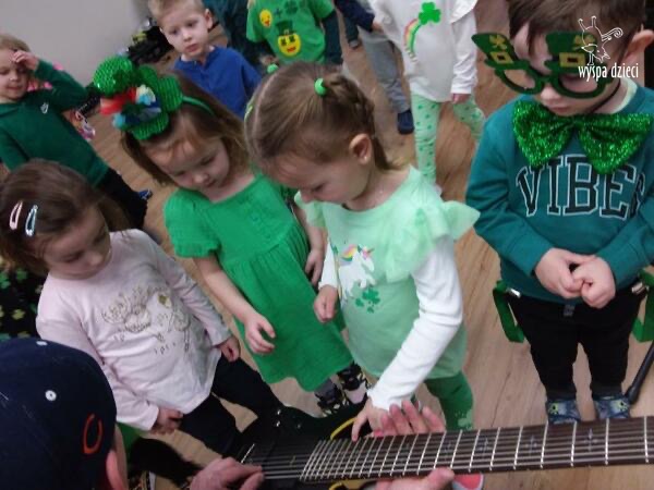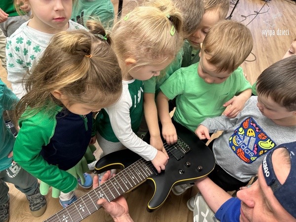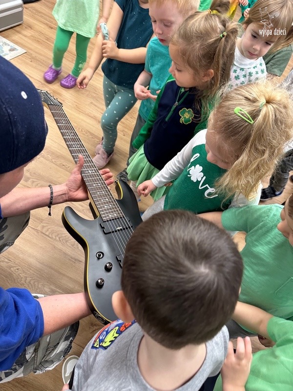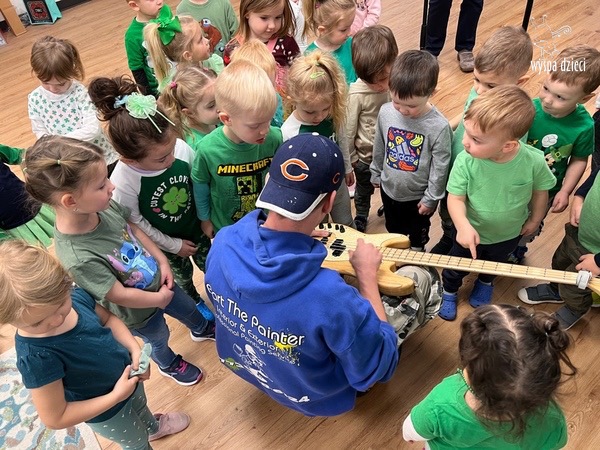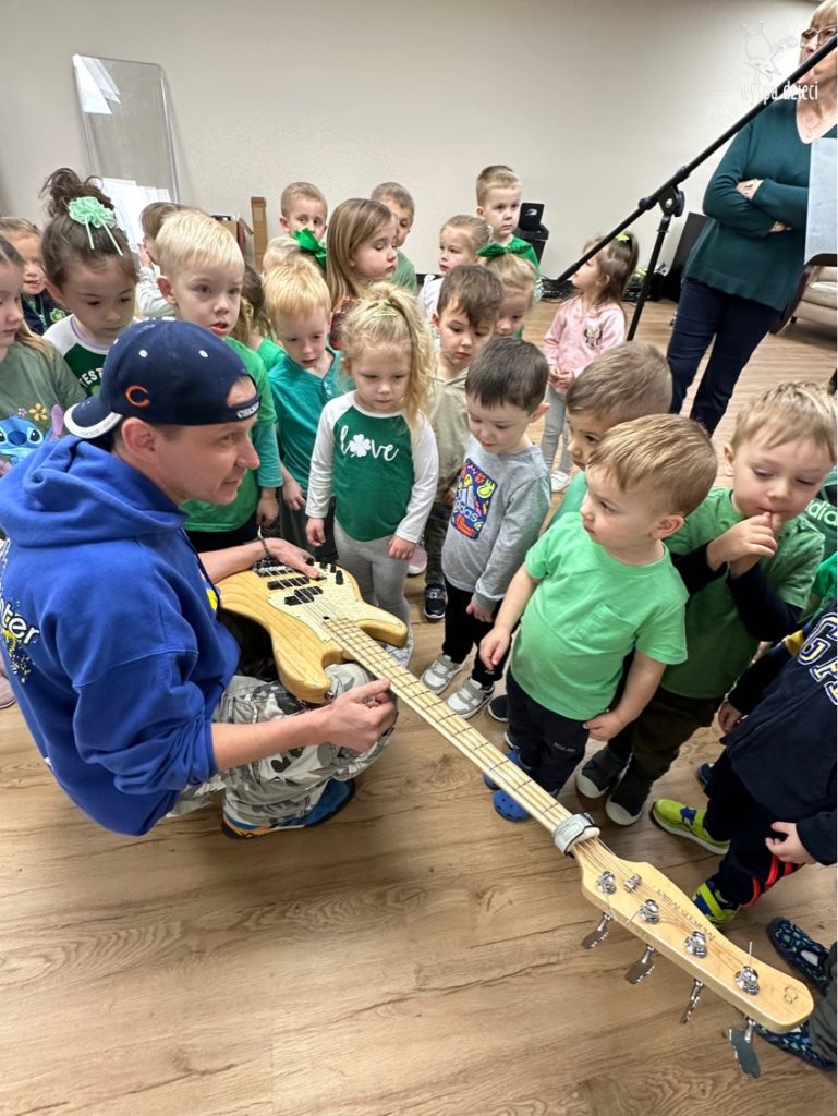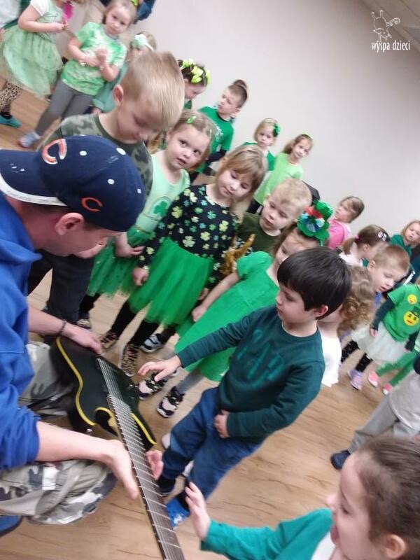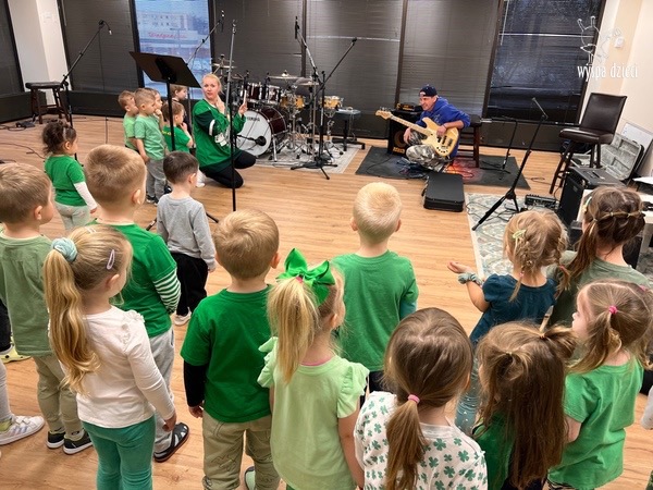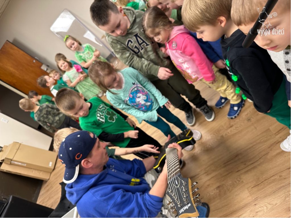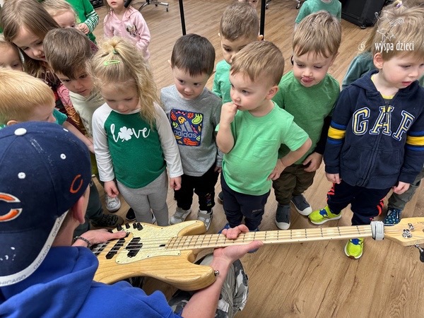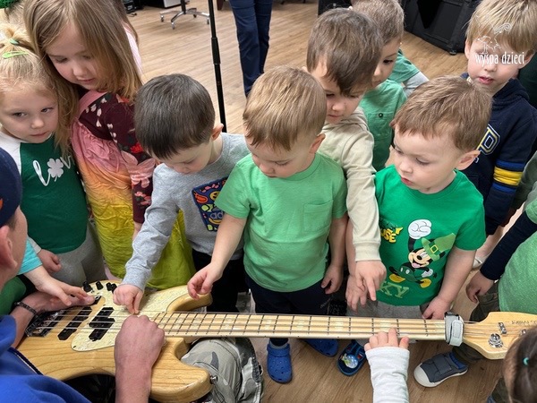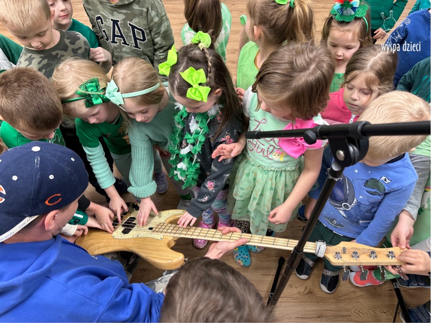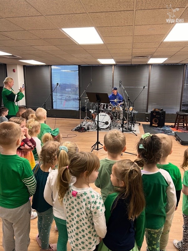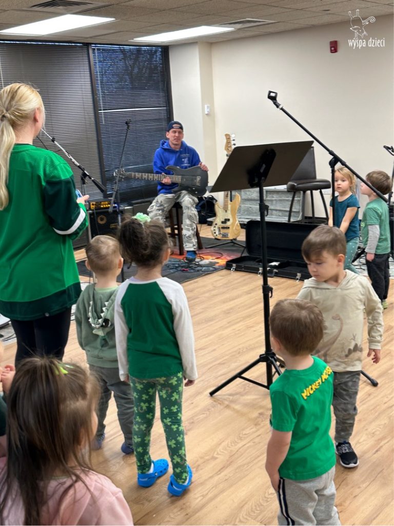 Młodsze grupy przedszkolakow z Wyspy Dzieci River Grove, dzięki uprzejmości Pana Bartka i Wojtka mogły choć chwile poczuć się jak prawdziwi muzycy. Odwiedzili miejsce w którym zobaczyli instrumenty na którym grają muzycy . Usłyszeli i zobaczyli różnice pomiędzy gitara elektryczna, a gitara basowa. Dowiedzieli się, z czego składa się perkusja. Jak również mogli zobaczyć różnice pomiędzy pianinem klasycznym a elektrycznym. Dzieci patrzyły z zapartym tchem jak Pan Bartek opowiadał o instrumentach i grał na nich. Dziekujemy za możliwość zobaczenia Waszego zaczarowanego muzycznego królestwa.