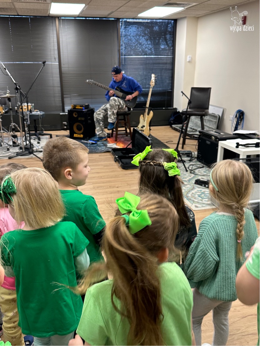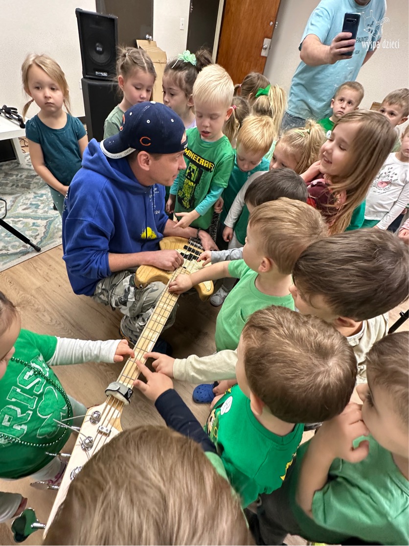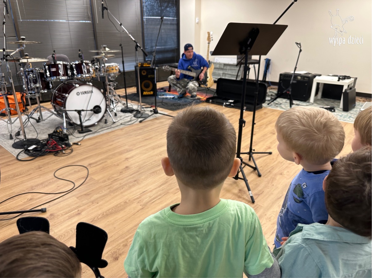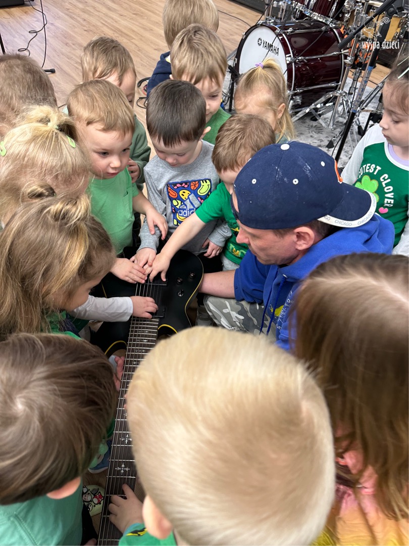 Młodsze grupy przedszkolakow z Wyspy Dzieci River Grove, dzięki uprzejmości Pana Bartka i Wojtka mogły choć chwile poczuć się jak prawdziwi muzycy. Odwiedzili miejsce w którym zobaczyli instrumenty na którym grają muzycy . Usłyszeli i zobaczyli różnice pomiędzy gitara elektryczna, a gitara basowa. Dowiedzieli się, z czego składa się perkusja. Jak również mogli zobaczyć różnice pomiędzy pianinem klasycznym a elektrycznym. Dzieci patrzyły z zapartym tchem jak Pan Bartek opowiadał o instrumentach i grał na nich. Dziekujemy za możliwość zobaczenia Waszego zaczarowanego muzycznego królestwa.