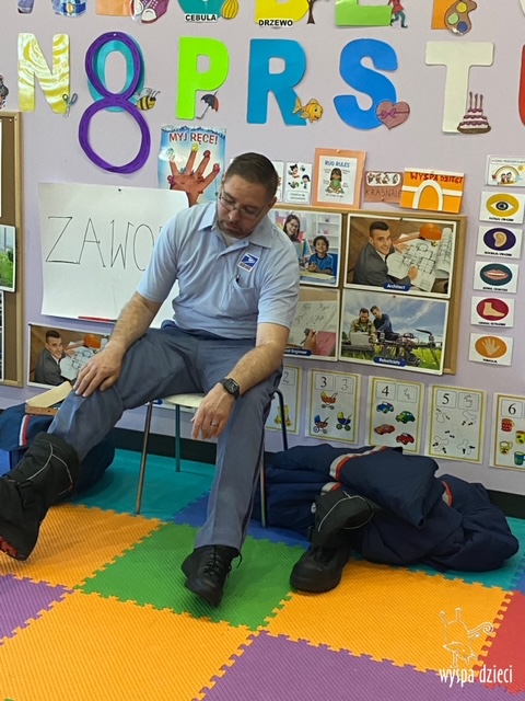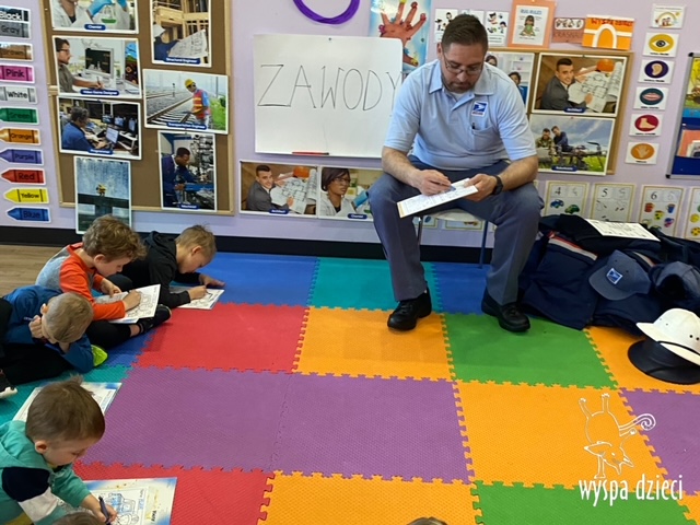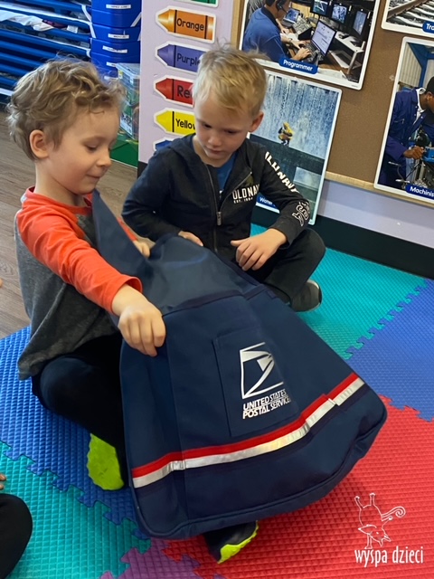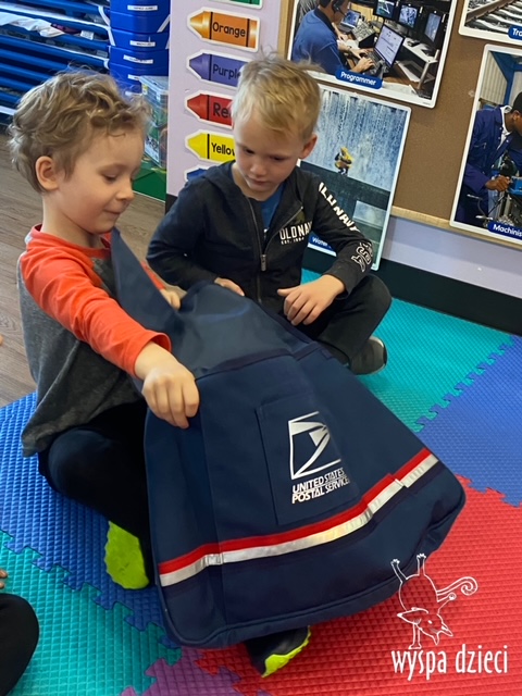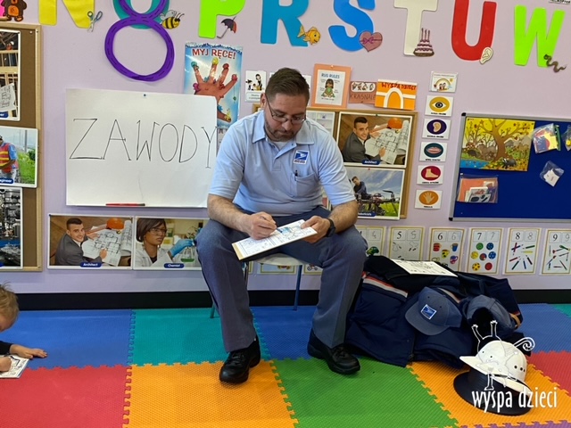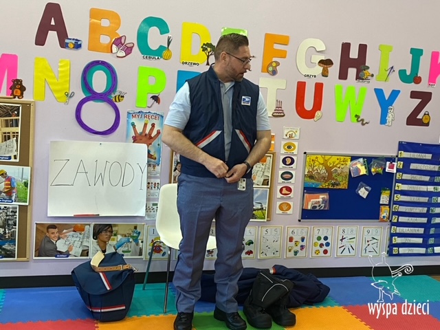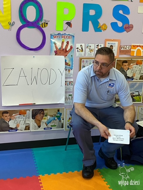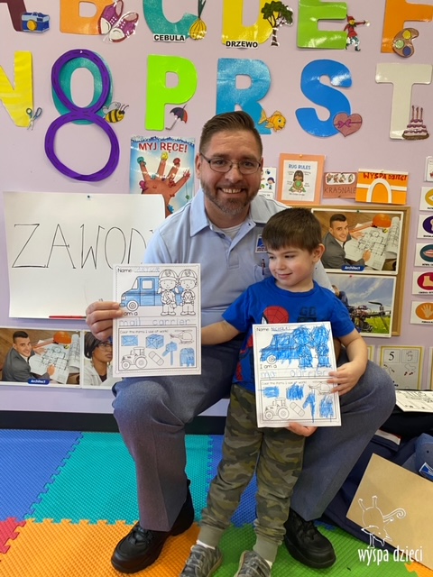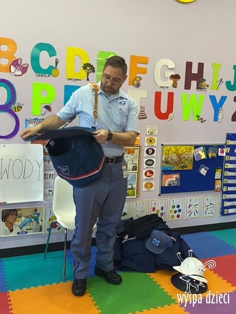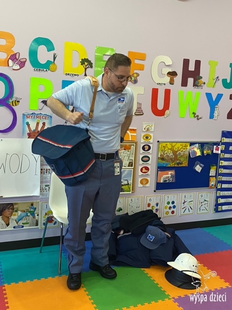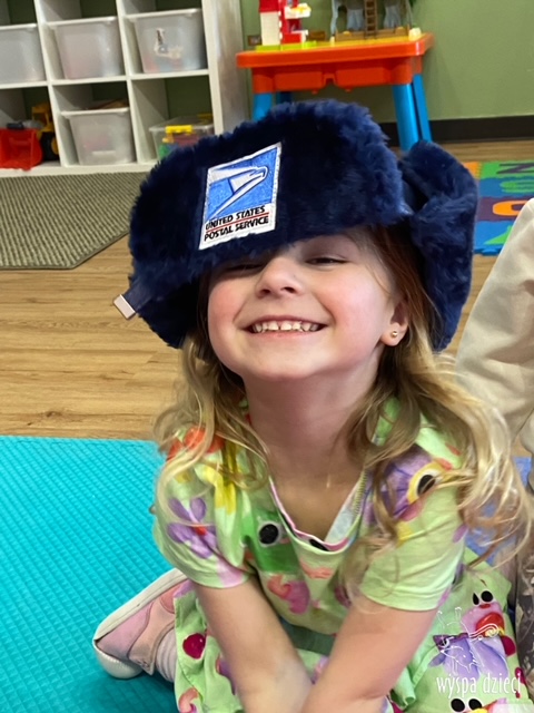 Pan Artur- listonosz opowiedział jak wygląda praca w zawodzie listonosza, pokazał dzieciom ubrania jakie zakłada listonosz zależnie od pory roku, dzieci miały nawet okazję zmierzyć czapkę listonosza oraz jego torbę! Dzieci razem z panem Arturem wykonały pracę tematyczną. Pan Artur przygotował dla dzieci piękne prezenciki w tym m.in. identyfikator pana listonosza z imieniem i nazwiskiem każdego dziecka! Dziękujemyza wspaniałą lekcję!