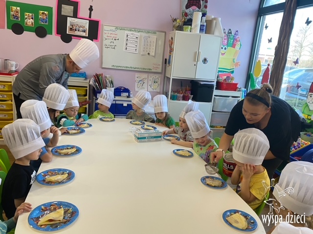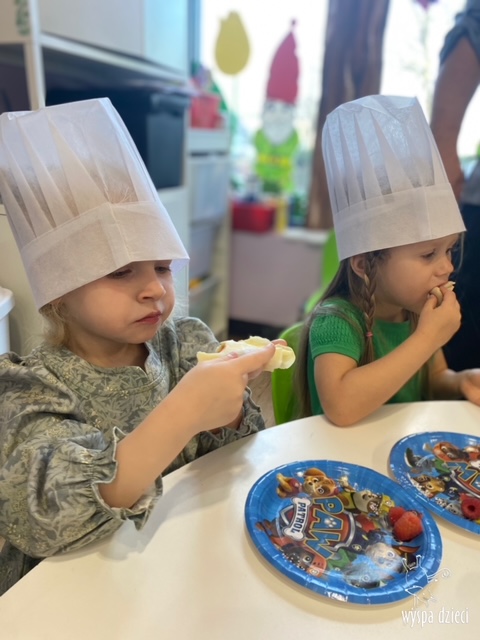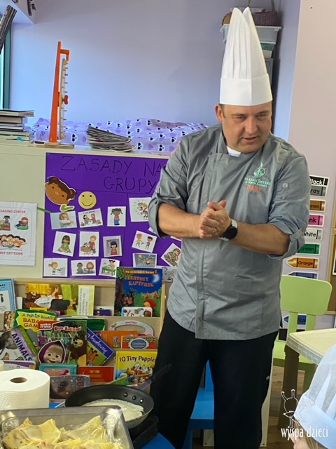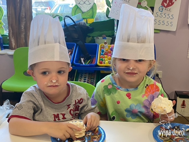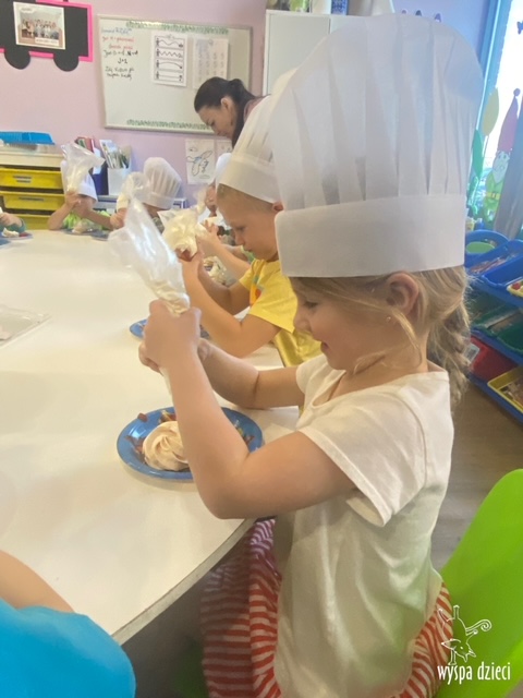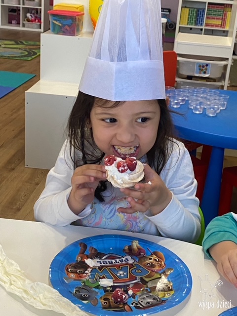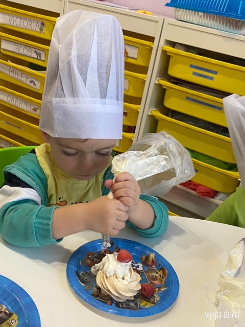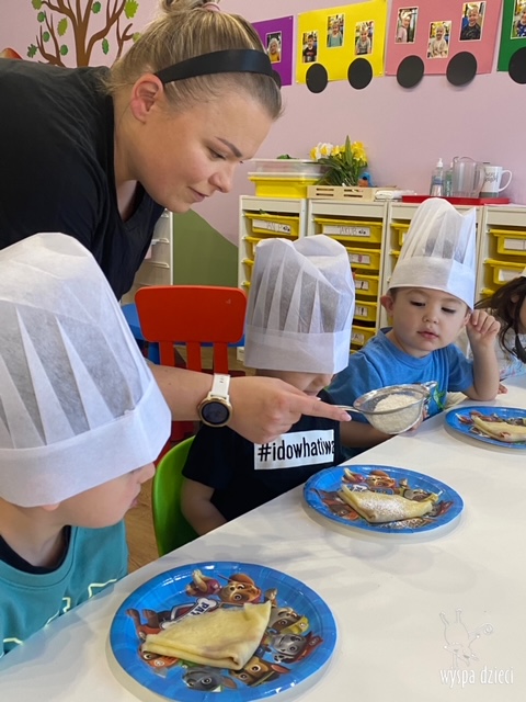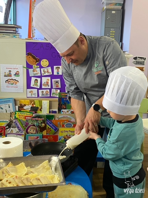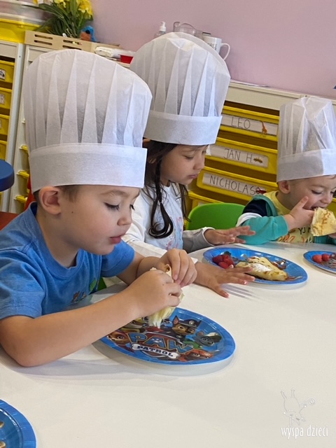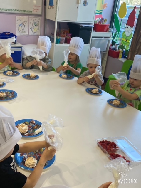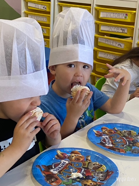 W tym tygodniu Krasnale gościły także w swojej klasie – pana Bartka, który jest szefem kuchni, oraz panią Magdę- cukiernika. Oj takie duety to my lubimy! Było pysznie i bardzo słodko! Pan Bartek przygotował razem z dziećmi pyszne naleśniki z cukrem pudrem i owocami! Naleśniki zniknęły z talerzy Krasnalków błyskawicznie. Były bajecznie pysznie! Później maluchy razem z panią cukiernik zdobiły swoje bezy. Dzieci pomogły pani Madzi ubić bitą śmietanę, którą każdy ozdobił swoją bezę. Malinka na bezie była dopełnieniem pysznegooo deseru! Mali kucharze otrzymali pamątkowe dyplomy szefa kuchni oraz specjalne czapki kucharskie! Dziękujemy za wspaniałe zajęcia!