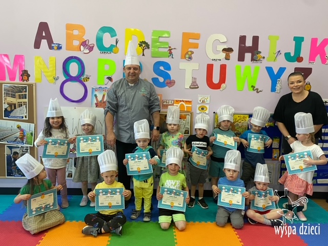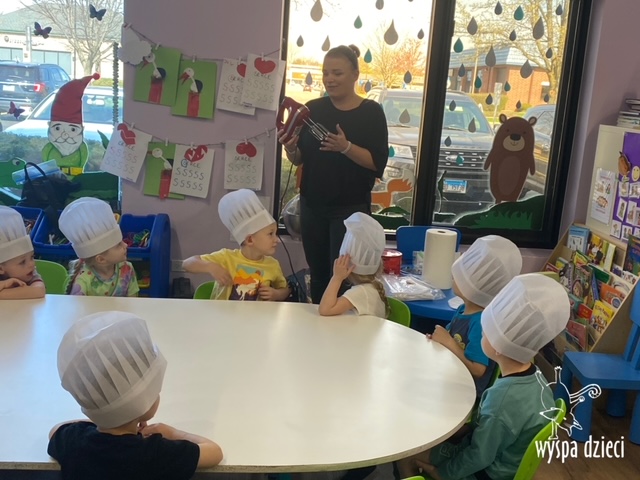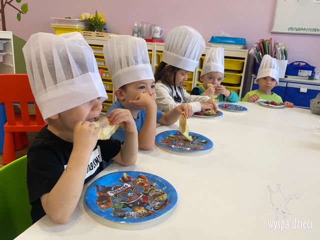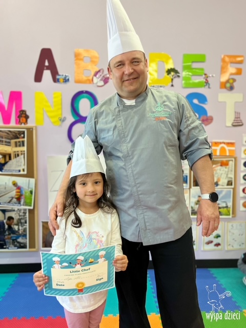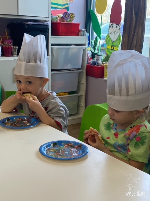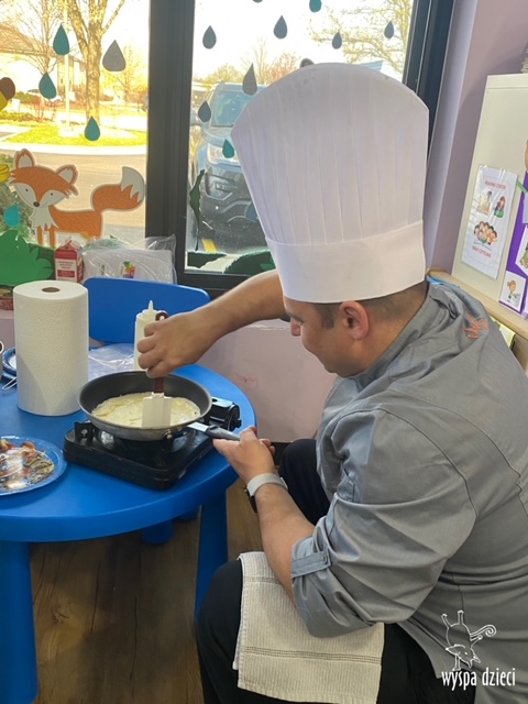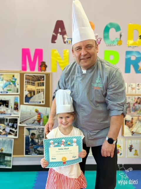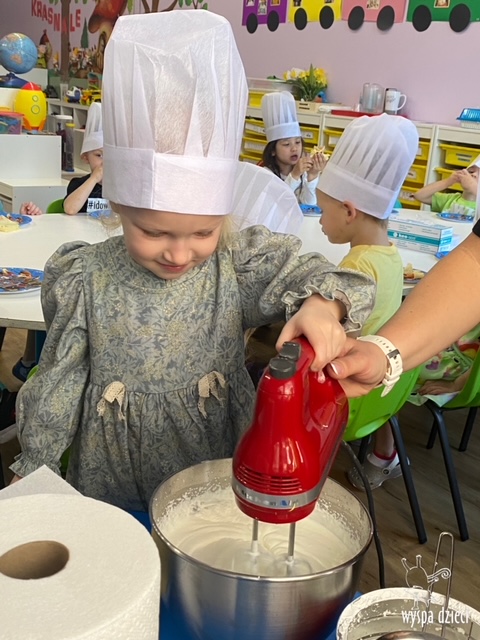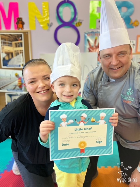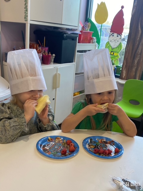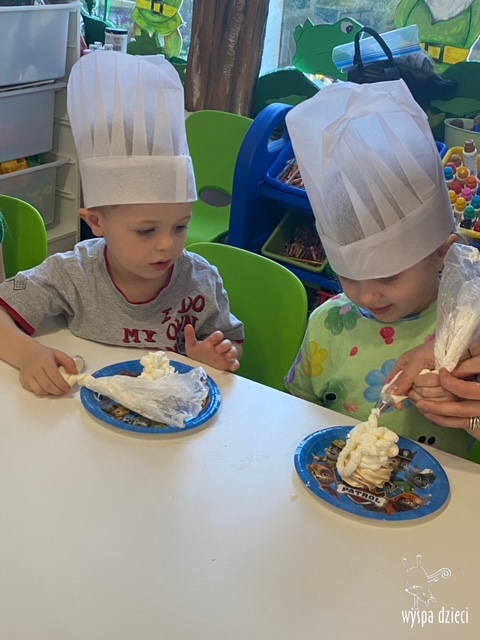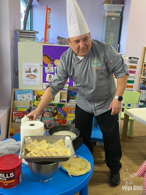 W tym tygodniu Krasnale gościły także w swojej klasie – pana Bartka, który jest szefem kuchni, oraz panią Magdę- cukiernika. Oj takie duety to my lubimy! Było pysznie i bardzo słodko! Pan Bartek przygotował razem z dziećmi pyszne naleśniki z cukrem pudrem i owocami! Naleśniki zniknęły z talerzy Krasnalków błyskawicznie. Były bajecznie pysznie! Później maluchy razem z panią cukiernik zdobiły swoje bezy. Dzieci pomogły pani Madzi ubić bitą śmietanę, którą każdy ozdobił swoją bezę. Malinka na bezie była dopełnieniem pysznegooo deseru! Mali kucharze otrzymali pamątkowe dyplomy szefa kuchni oraz specjalne czapki kucharskie! Dziękujemy za wspaniałe zajęcia!