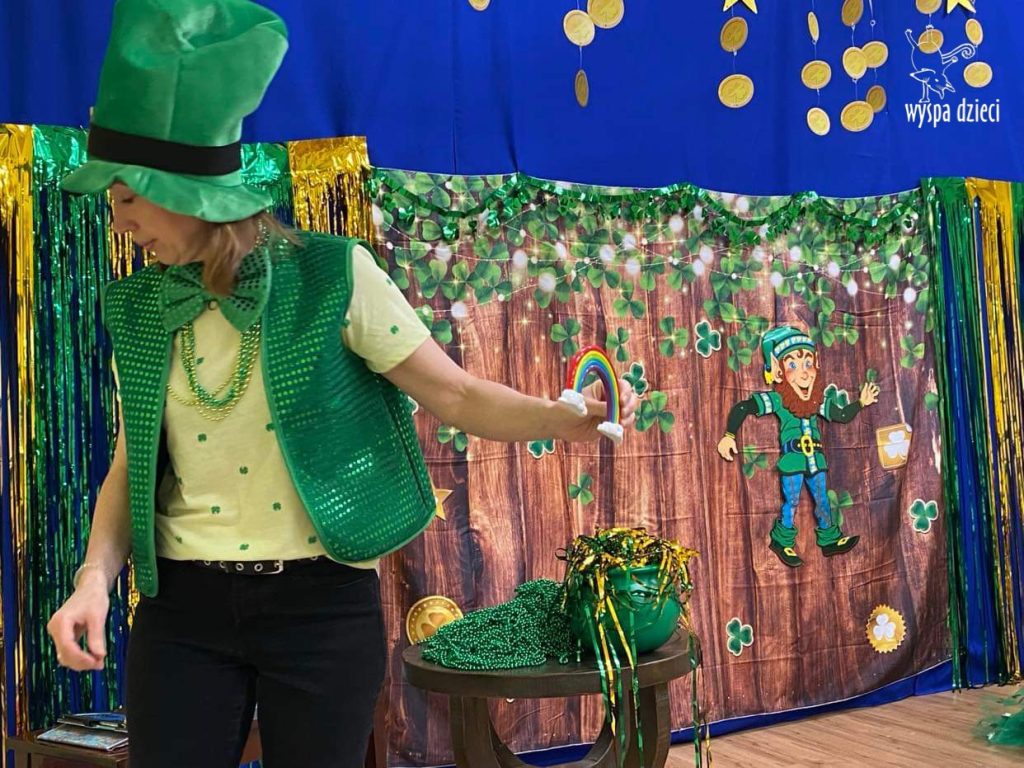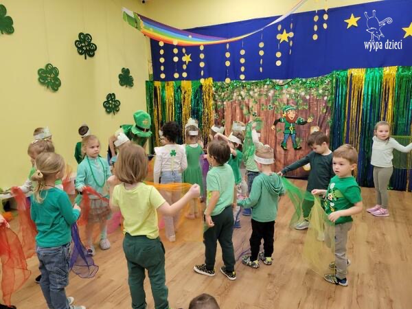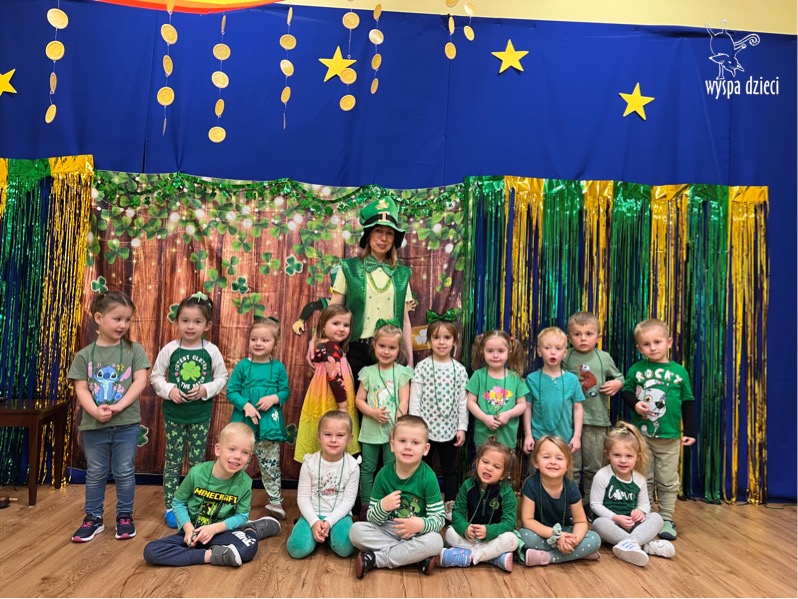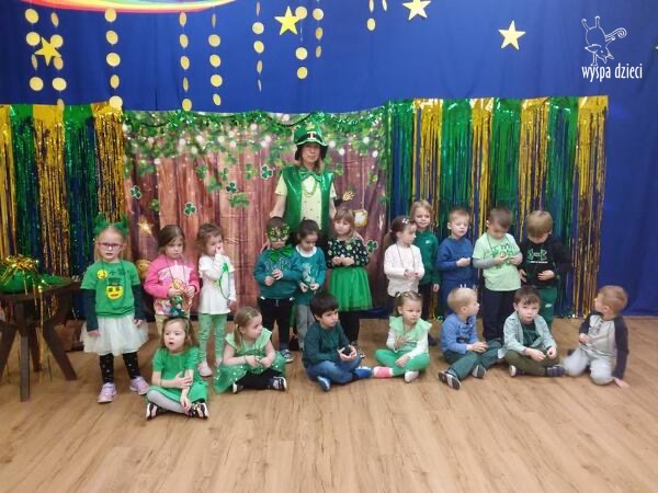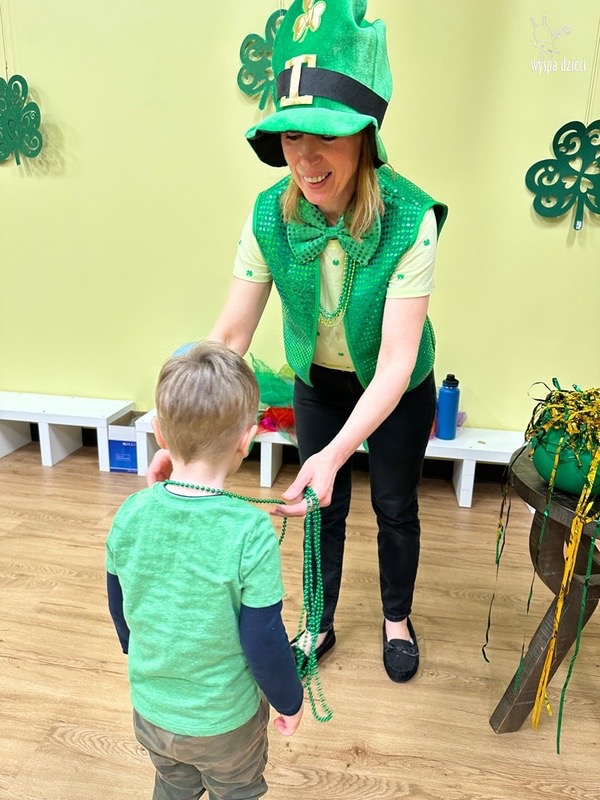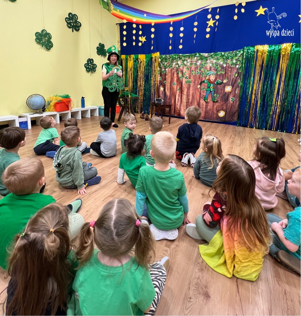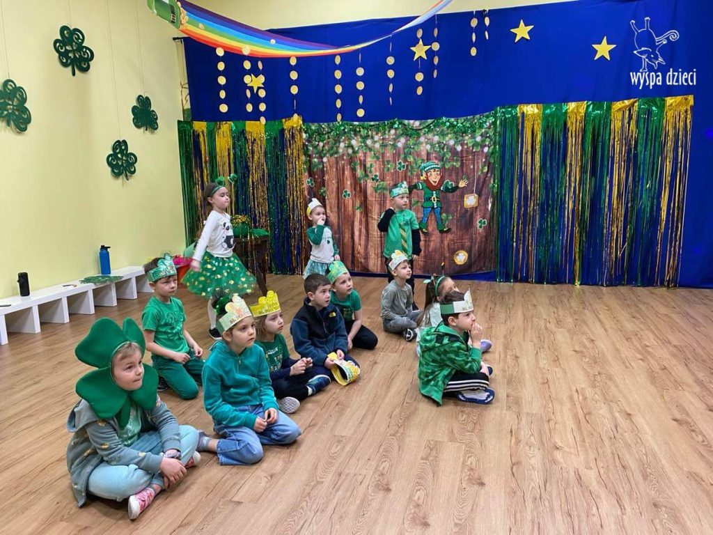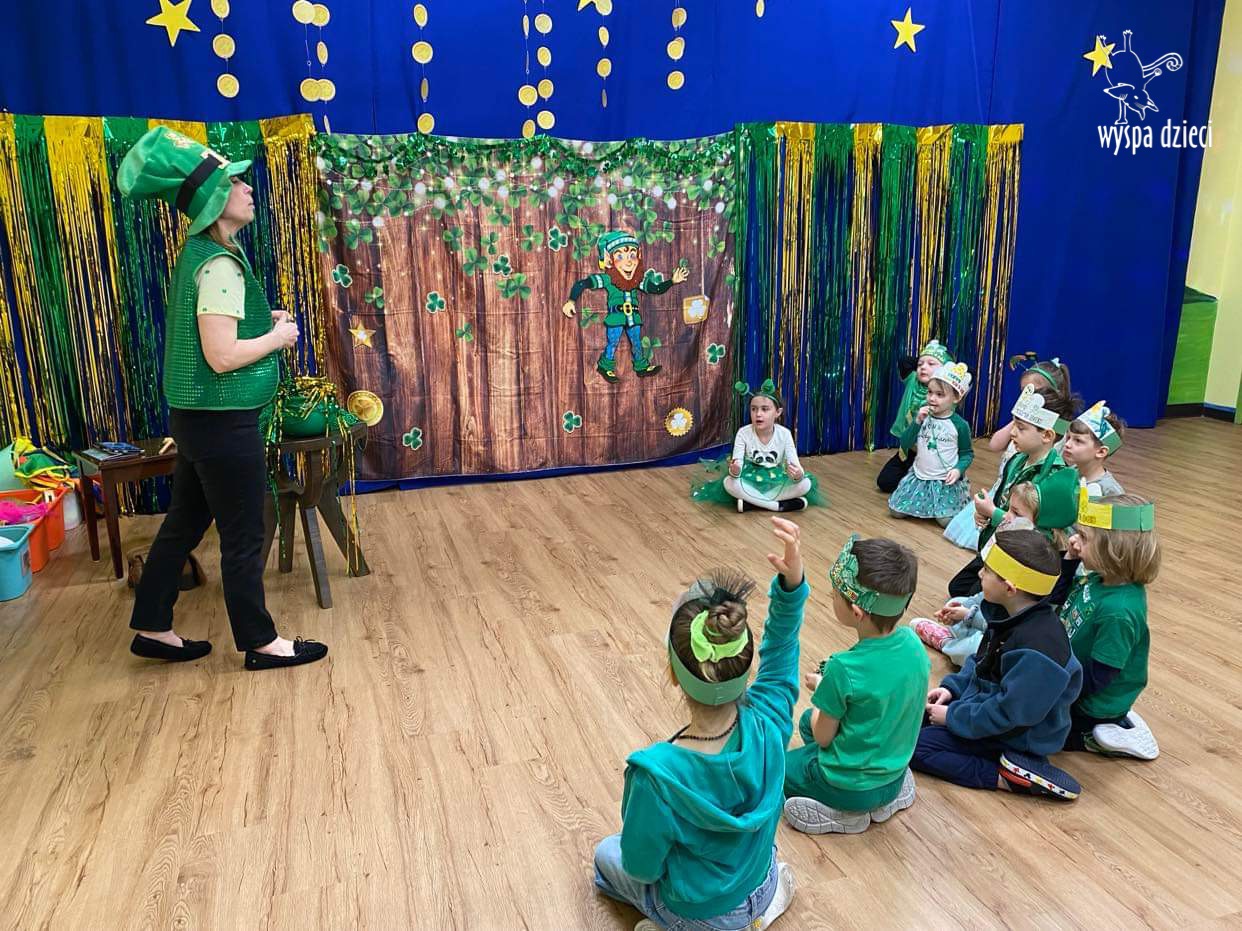 Dzień Świętego Patryka, który obchodzimy 17 marca, nie jest jedynie świętem narodowym Irlandii, ale również jednym z najchętniej obchodzonych świąt na świecie. W naszej Wyspie Dzieci River Grove również przedszkolaki miały okazję zapoznać się z tradycjami irlandzkiego święta. Zaznajomiły się z symbolami tej Zielonej Wyspy, takimi jak trójlistna koniczyna, kolor zielony, flaga i godło Irlandii. Dzieci poznały historię patrona Irlandii oraz legendę o skrzacie Leprechaun. Na koniec Leprechaun podarowal kazdemu Przedszkolakowi zielony naszyjnik .