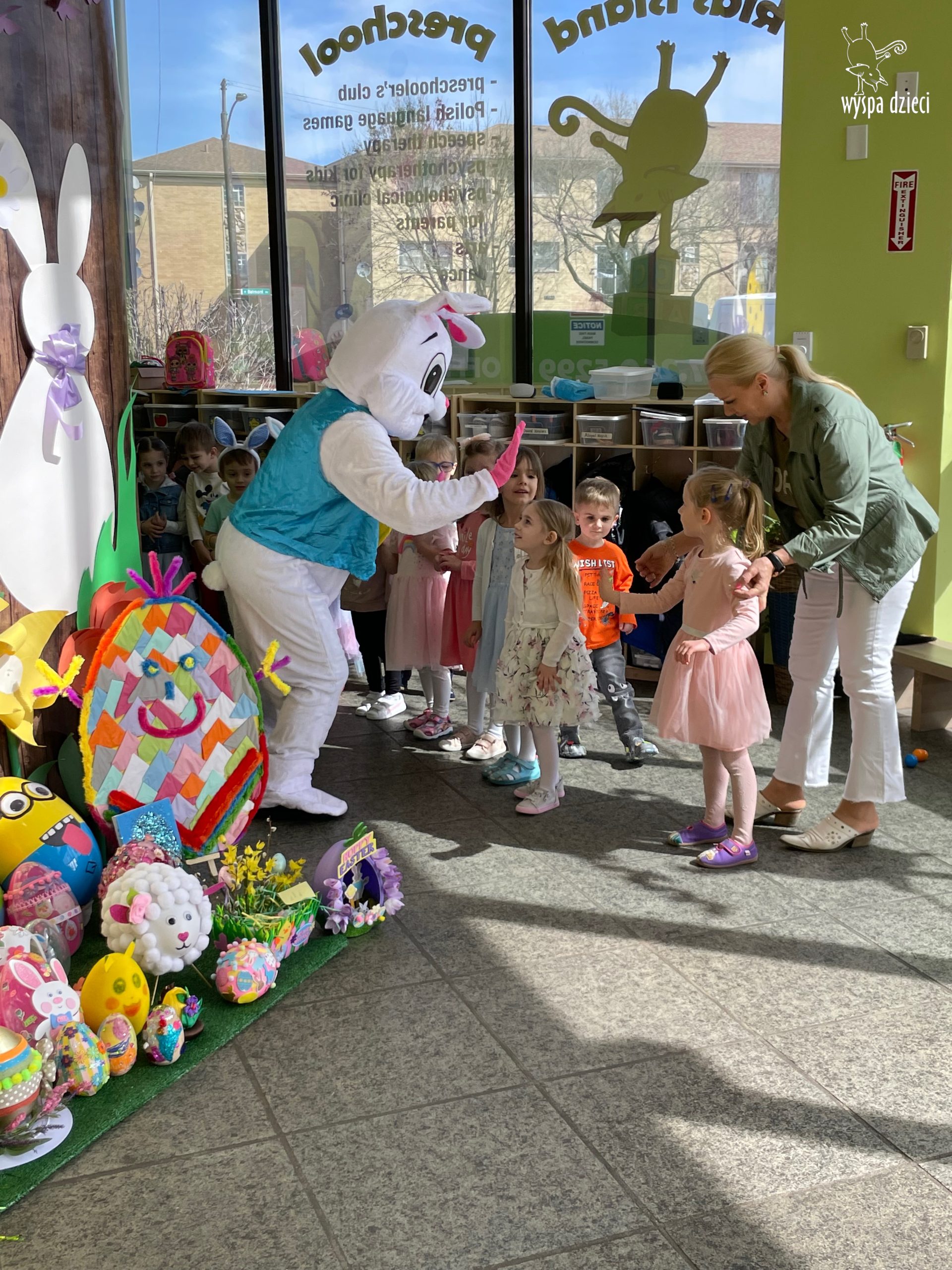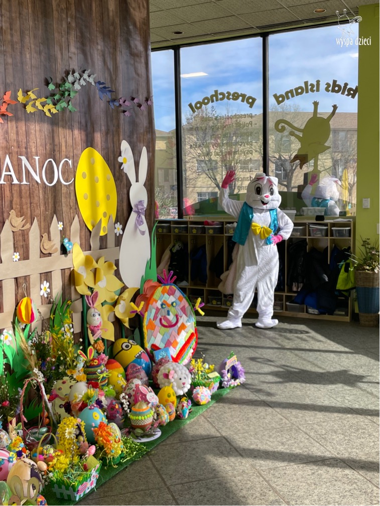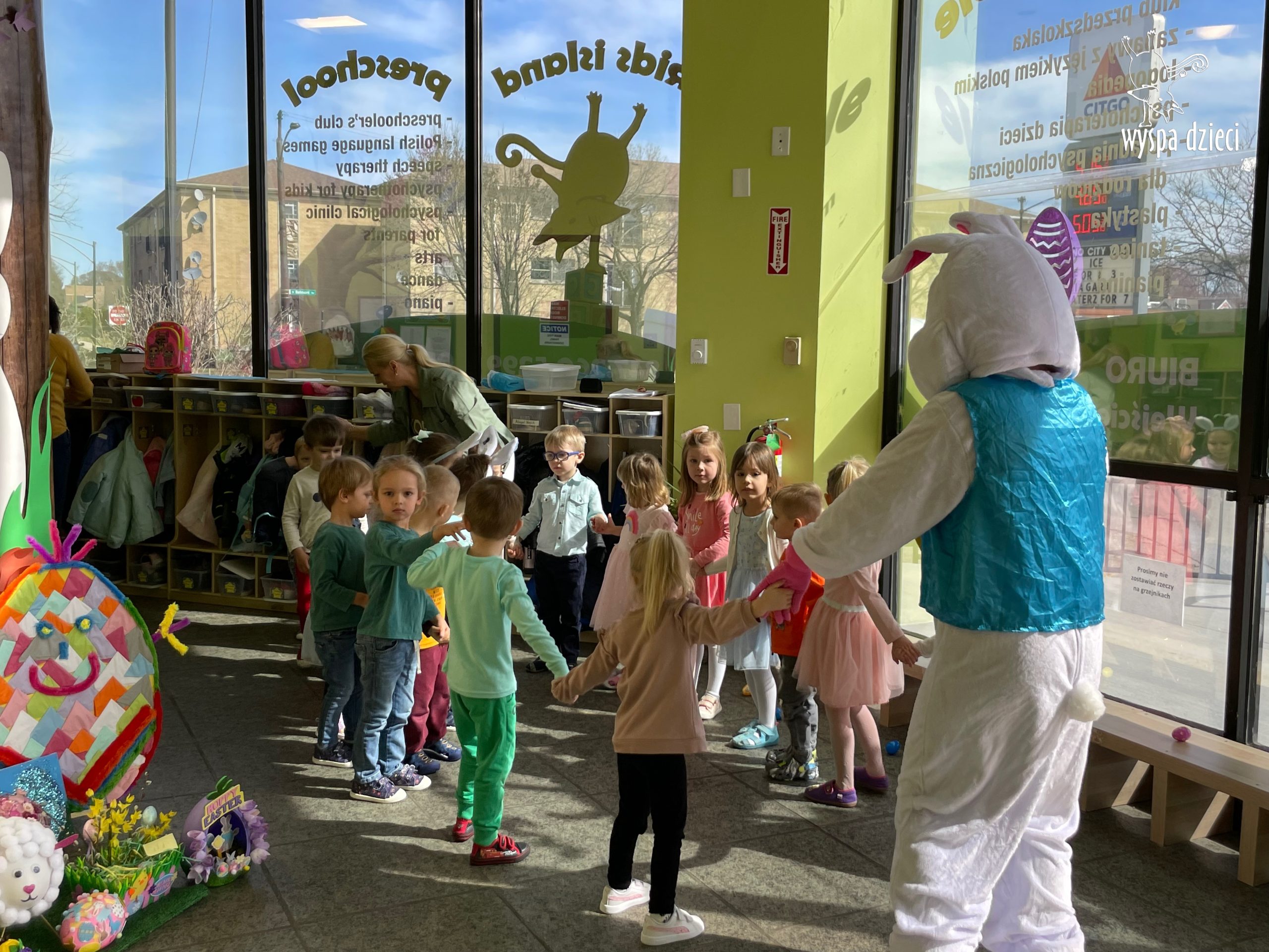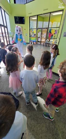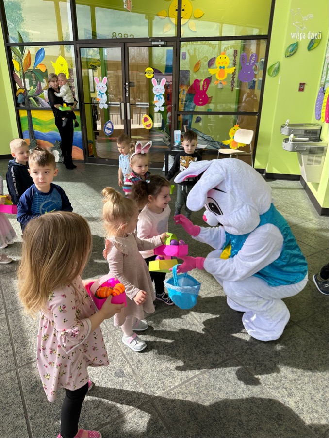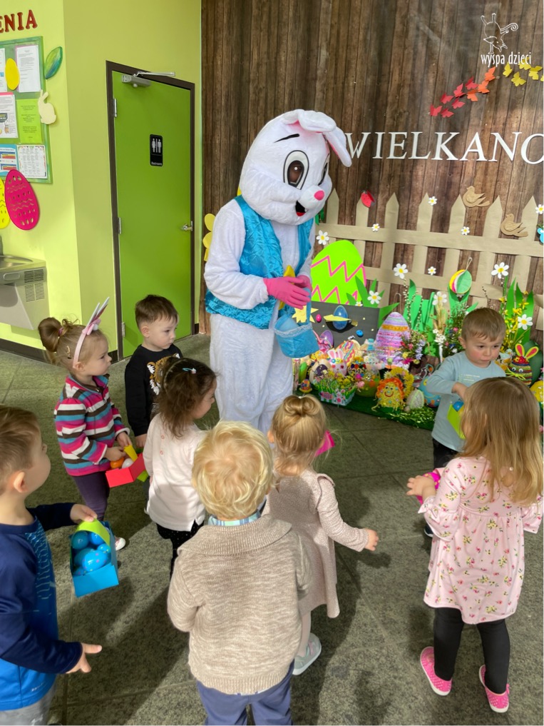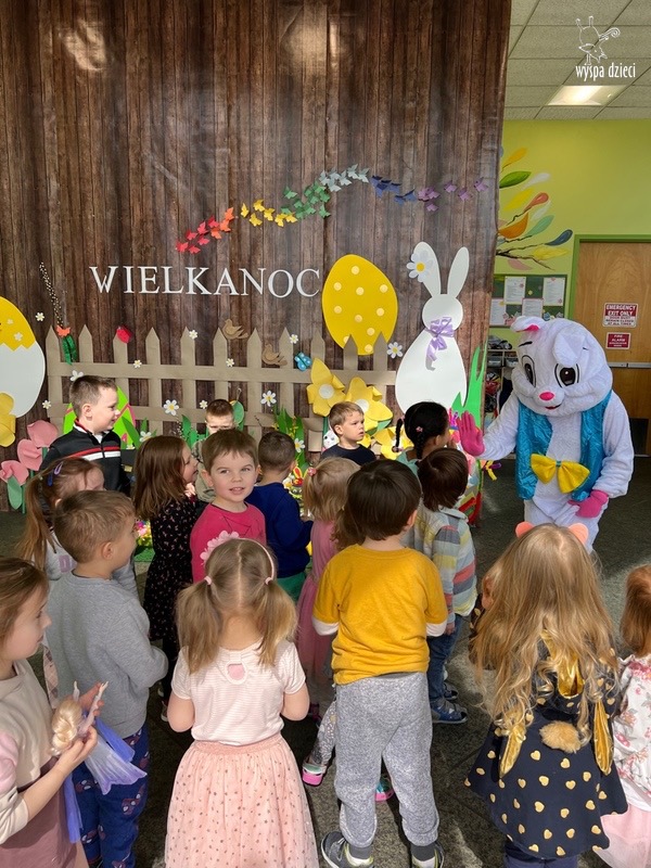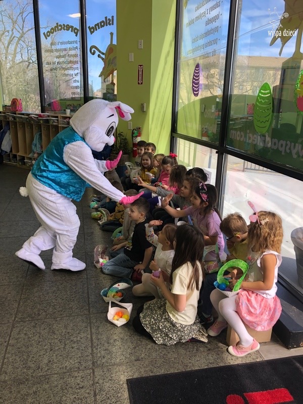 Dziś do naszej Wyspy Dzieci w River Grove przykicał wspaniały, radosny wielkanocny zajączek. Dzieci znalazły ślady zajączka po których maszerowały do głównego korytarza , gdzie czekały na nich jajka niespodzianki . Zajączek odwiedzil każdą grupę. Nasz gość chętnie pozował z dziećmi do zdjęć i z nimi rozmawiał o zbliżających się świętach, a tekże śpiewał piosenki o wiośnie.
