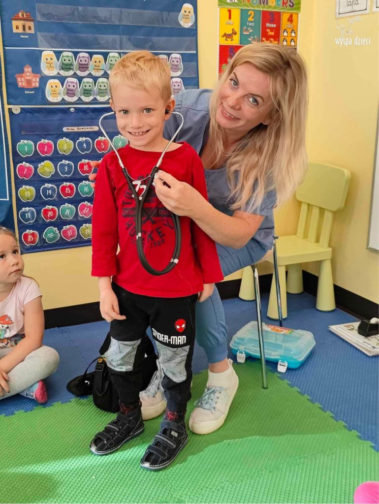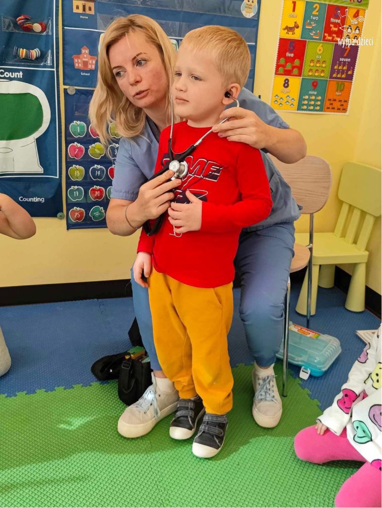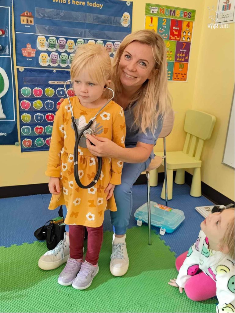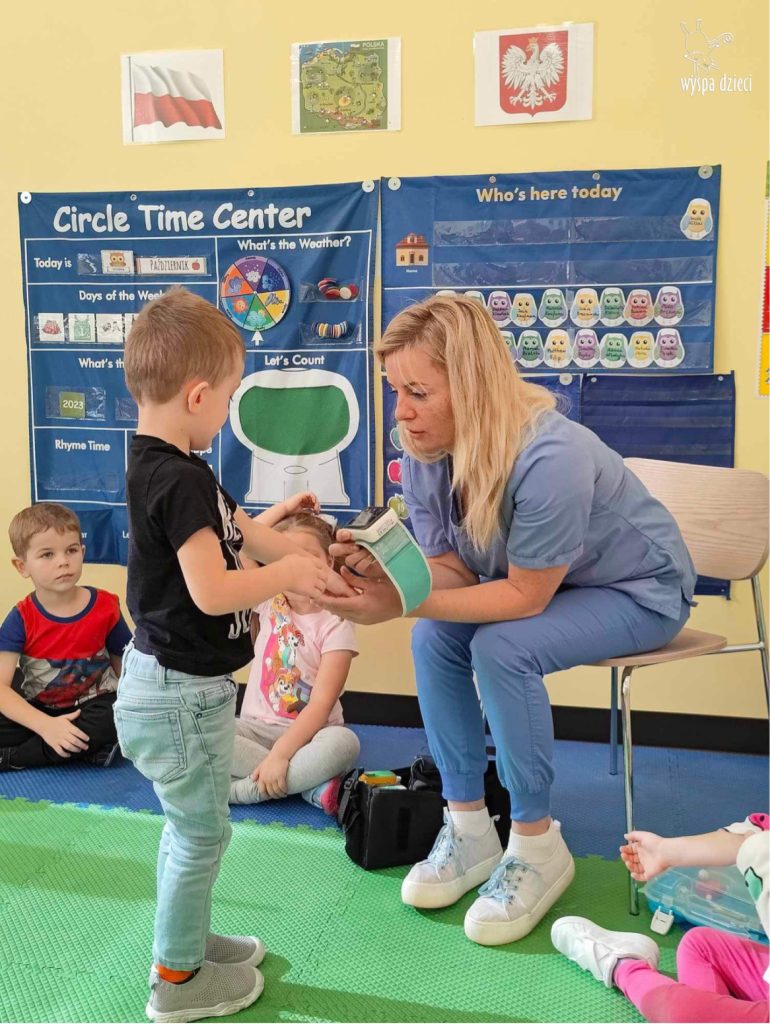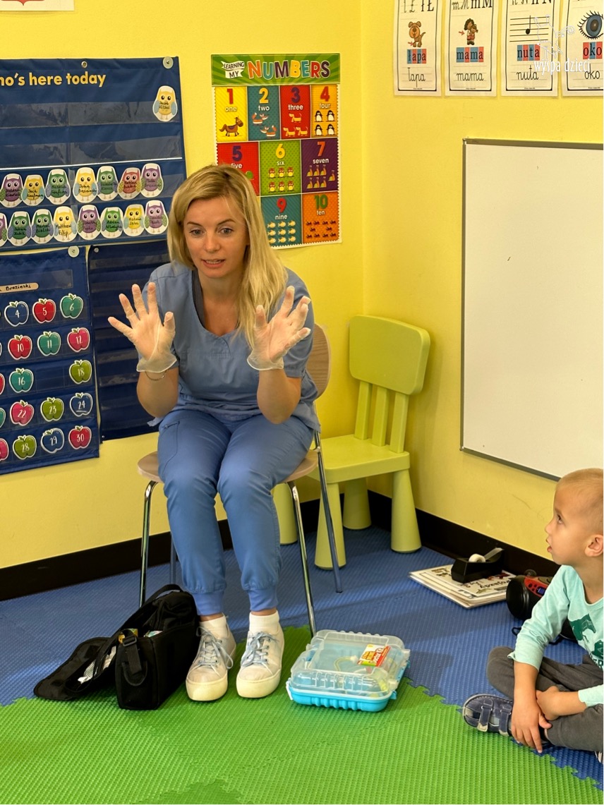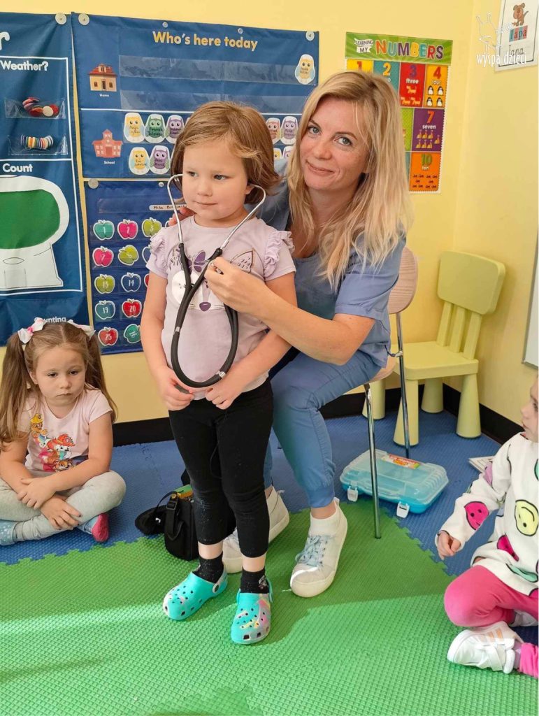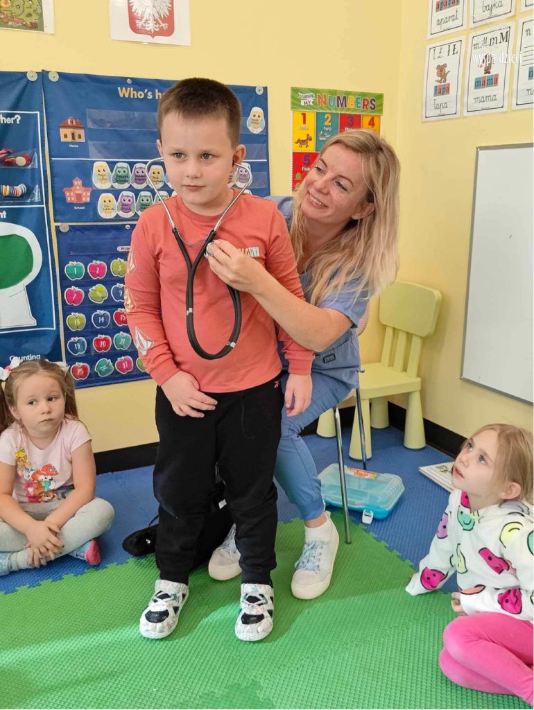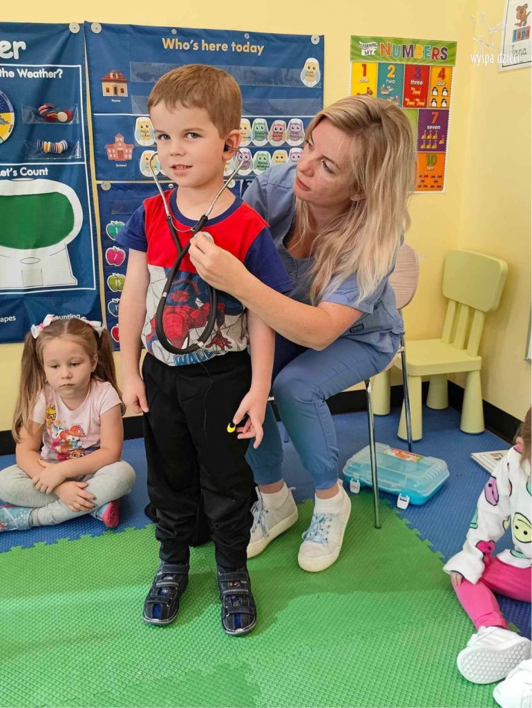 W tym tygodniu na Wyspie Dzieci w River Grove rozmawiamy o zawodach. Z tej okazji grupa Bystrzaków gościła mamę Adrianka. Pani Katarzyna opowiadała o ciekawym zawodzie pielęgniarki, który wykonuje na co dzień. Przyniosła ze sobą kilka przedmiotów, z których korzysta w pracy. Każdy chciał posłuchać bicia swego serca, sprawdzić, czy ma wystarczającą ilość tlenu do oddychania czy też zmierzyć ciśnienie. Na koniec dzieci otrzymały kolorowe plastry “tak na wszelki wypadek”, a pani Kasia laurkę z podziękowaniem za wspaniałe, pouczające spotkanie. Dziękujemy!