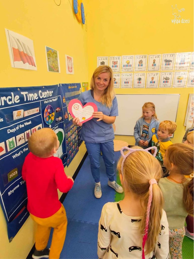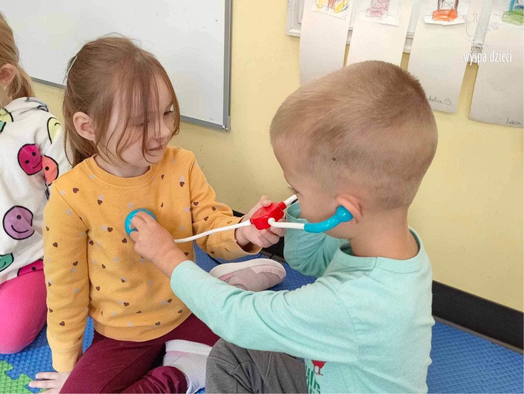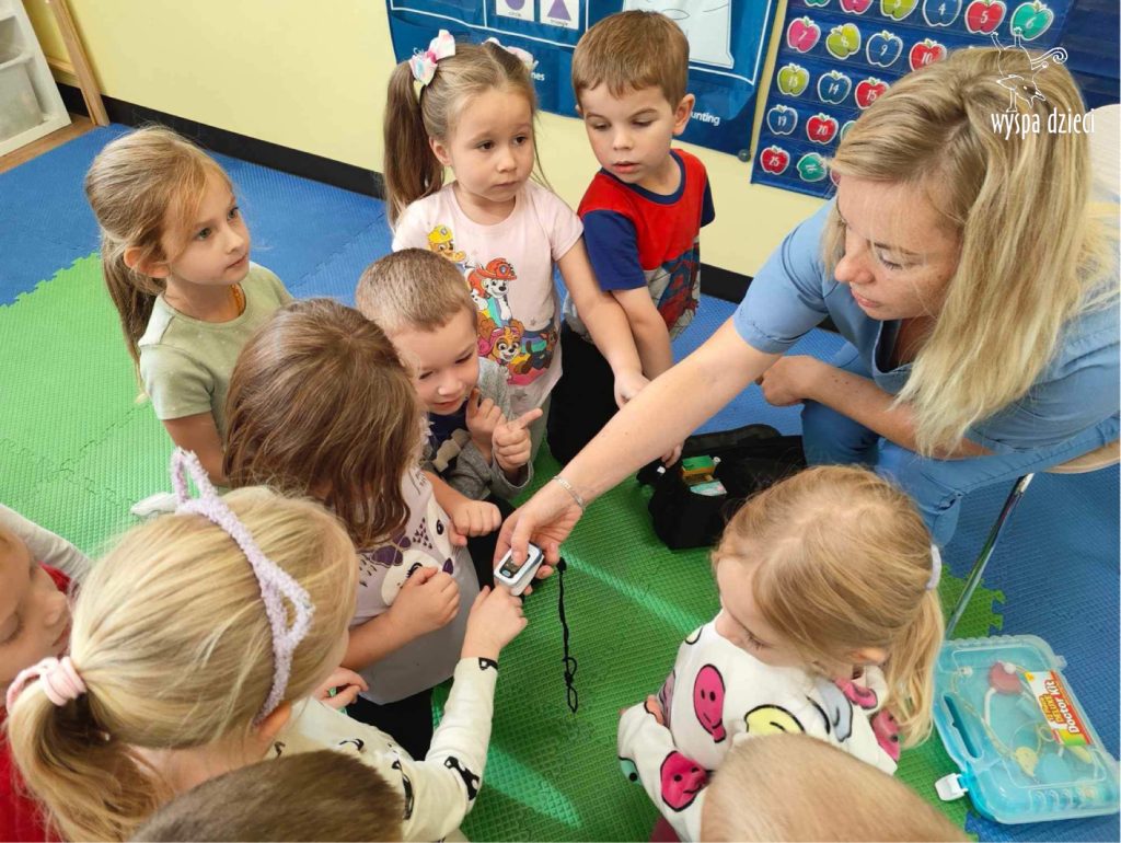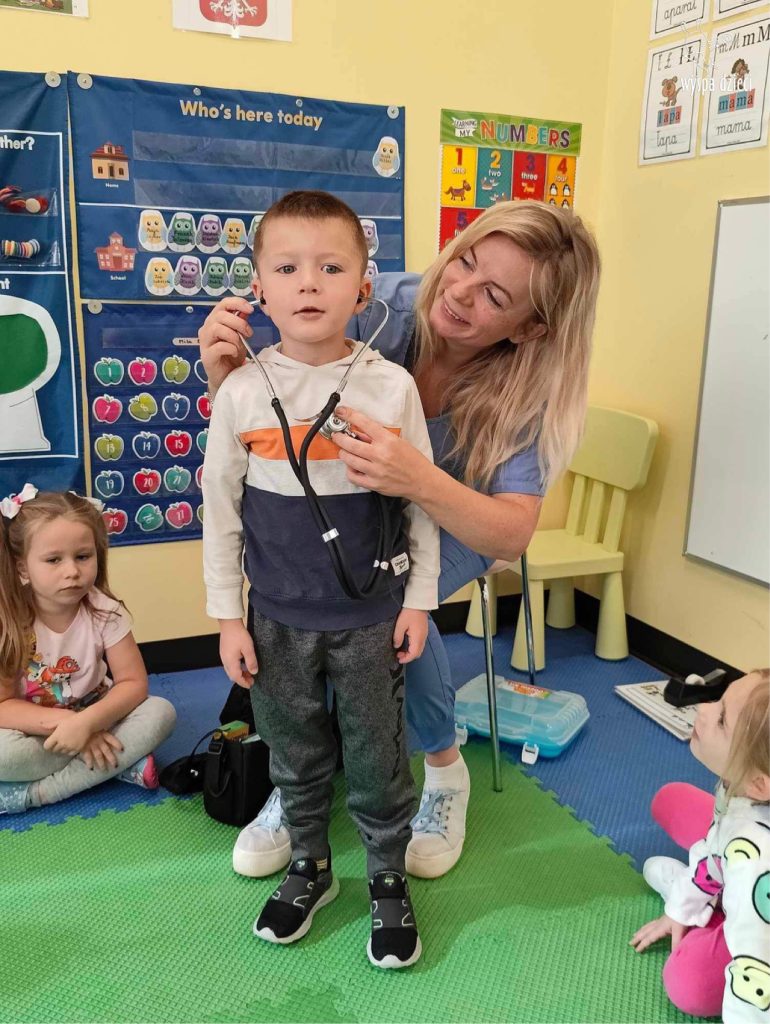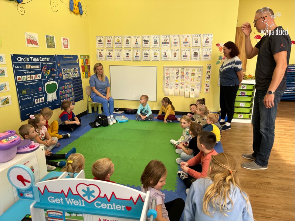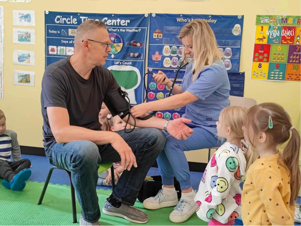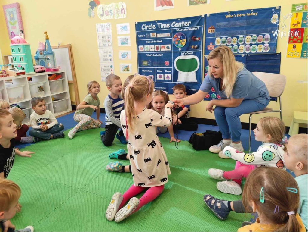 W tym tygodniu na Wyspie Dzieci w River Grove rozmawiamy o zawodach. Z tej okazji grupa Bystrzaków gościła mamę Adrianka. Pani Katarzyna opowiadała o ciekawym zawodzie pielęgniarki, który wykonuje na co dzień. Przyniosła ze sobą kilka przedmiotów, z których korzysta w pracy. Każdy chciał posłuchać bicia swego serca, sprawdzić, czy ma wystarczającą ilość tlenu do oddychania czy też zmierzyć ciśnienie. Na koniec dzieci otrzymały kolorowe plastry “tak na wszelki wypadek”, a pani Kasia laurkę z podziękowaniem za wspaniałe, pouczające spotkanie. Dziękujemy!