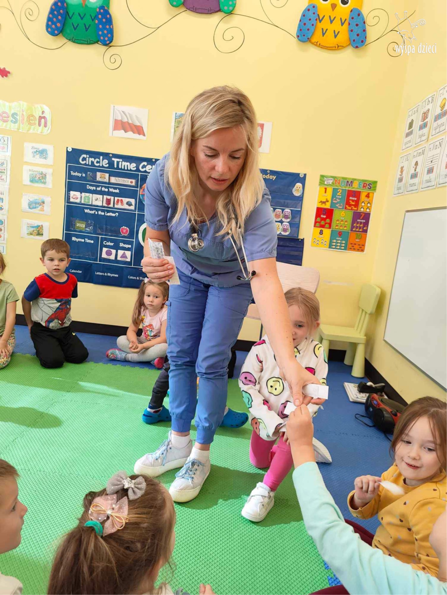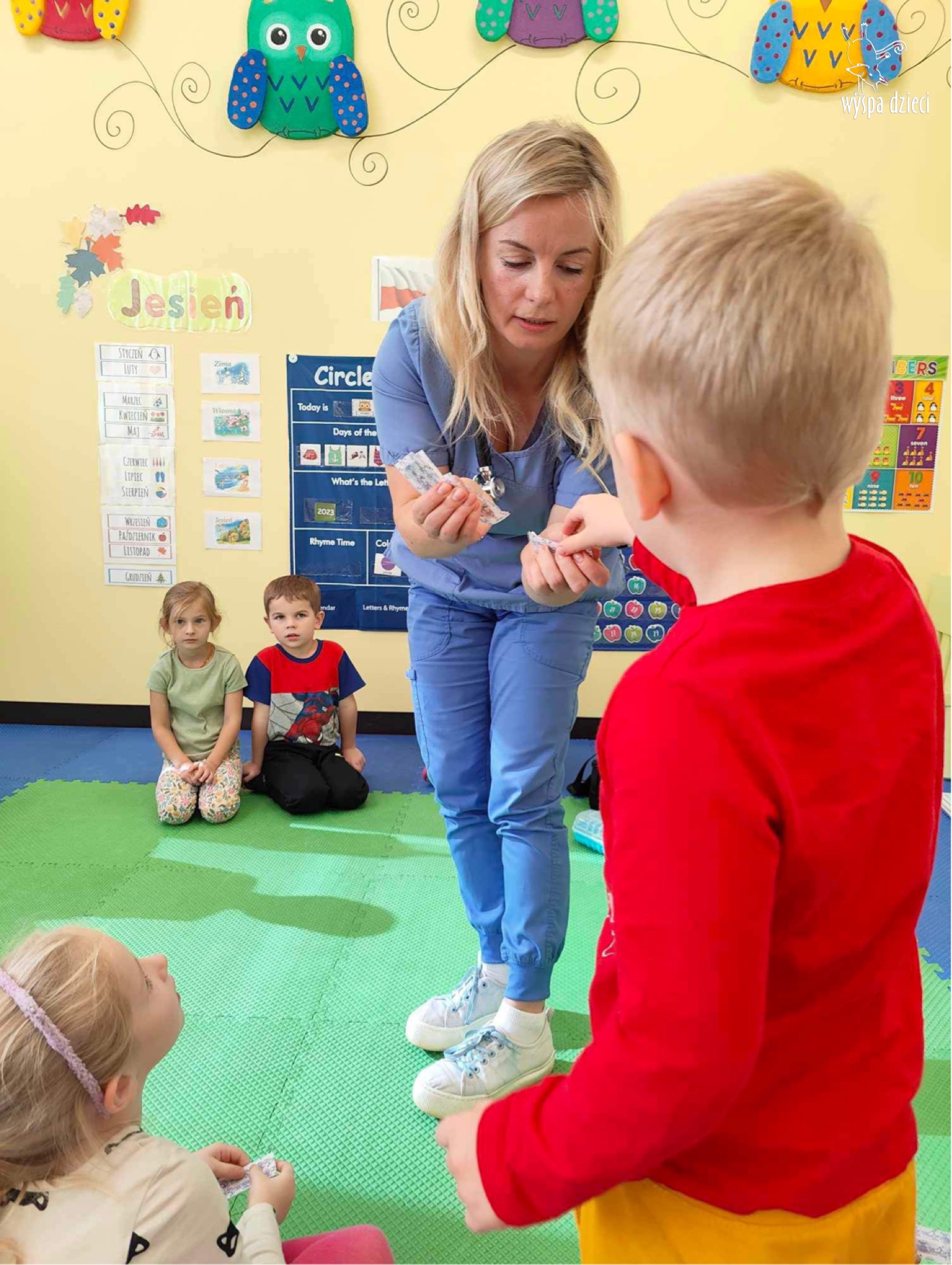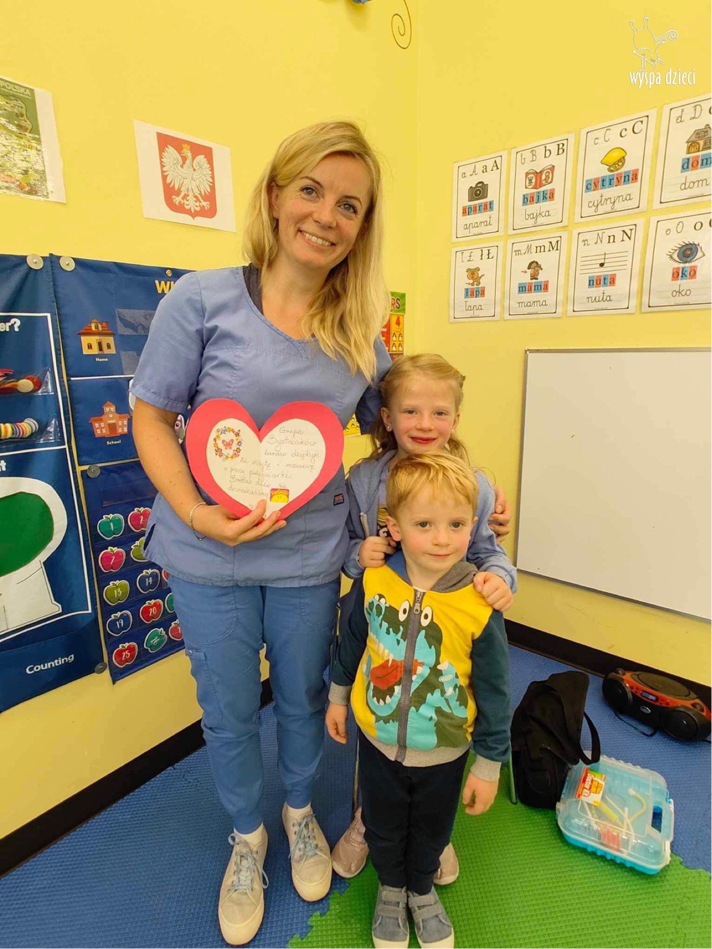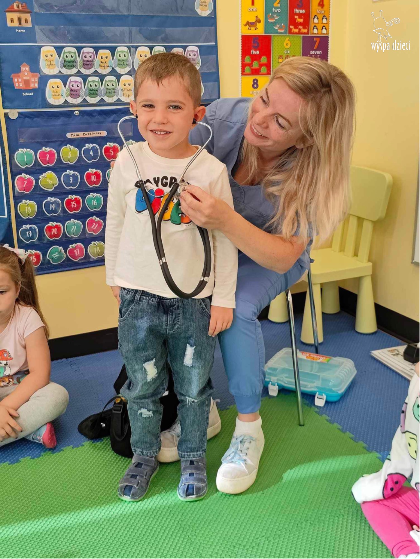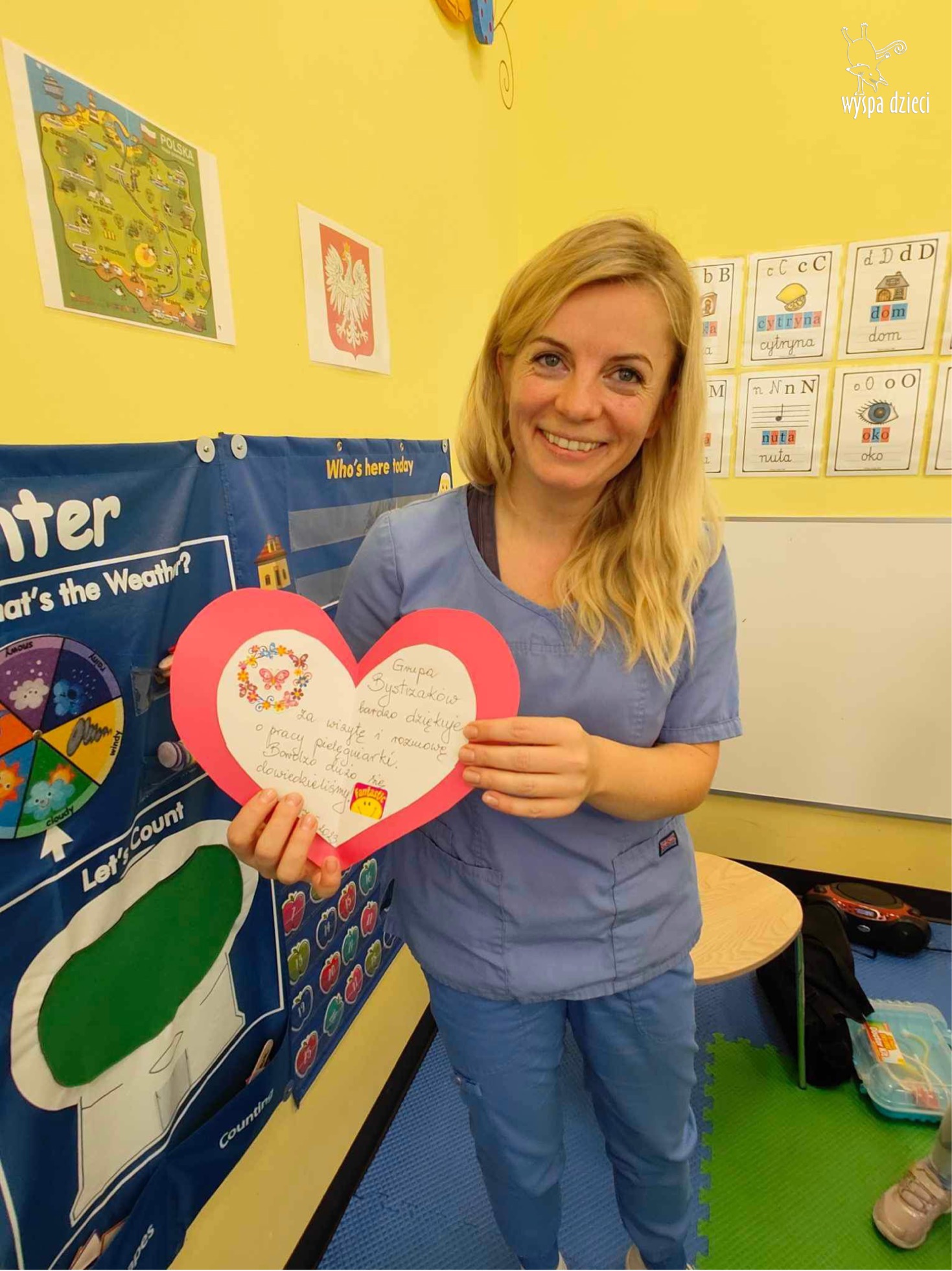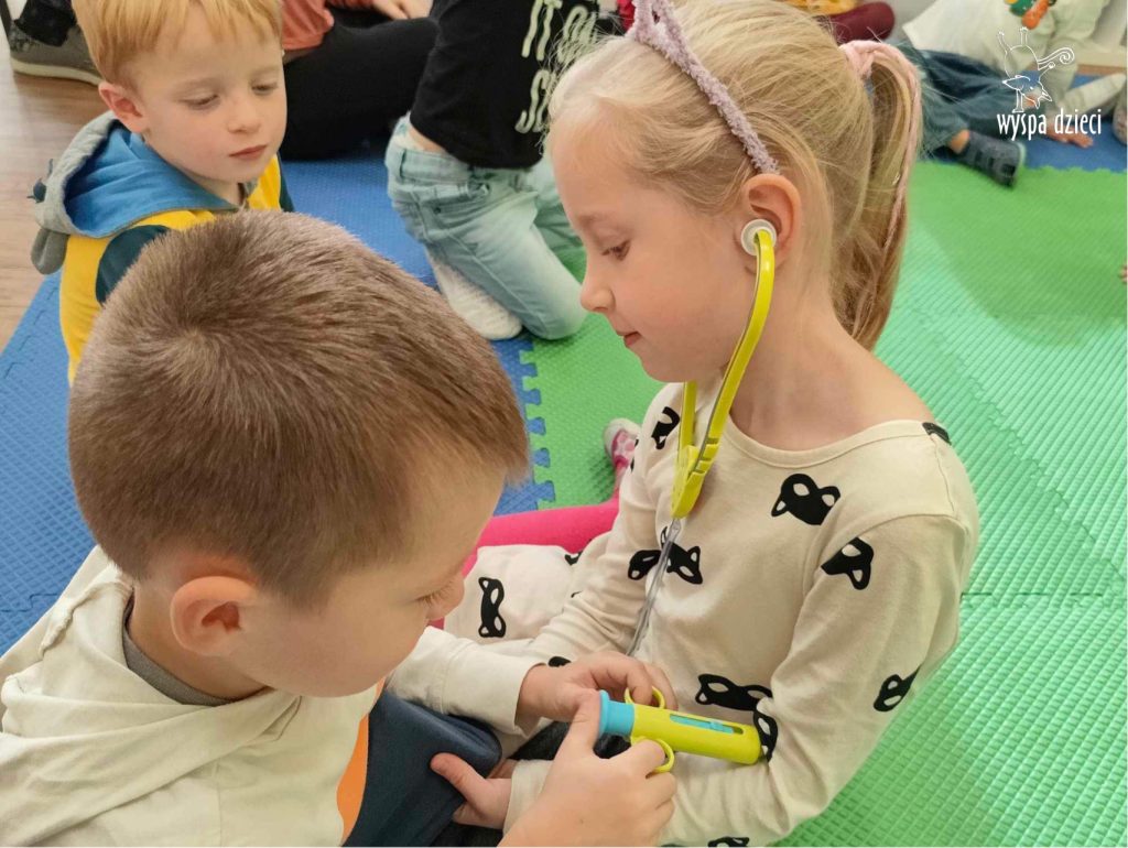 W tym tygodniu na Wyspie Dzieci w River Grove rozmawiamy o zawodach. Z tej okazji grupa Bystrzaków gościła mamę Adrianka. Pani Katarzyna opowiadała o ciekawym zawodzie pielęgniarki, który wykonuje na co dzień. Przyniosła ze sobą kilka przedmiotów, z których korzysta w pracy. Każdy chciał posłuchać bicia swego serca, sprawdzić, czy ma wystarczającą ilość tlenu do oddychania czy też zmierzyć ciśnienie. Na koniec dzieci otrzymały kolorowe plastry “tak na wszelki wypadek”, a pani Kasia laurkę z podziękowaniem za wspaniałe, pouczające spotkanie. Dziękujemy!