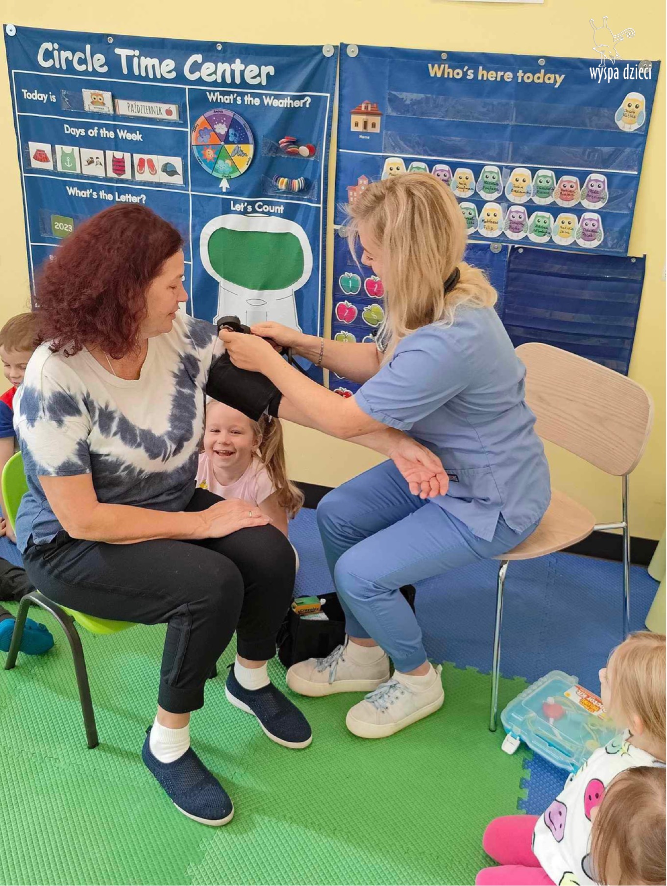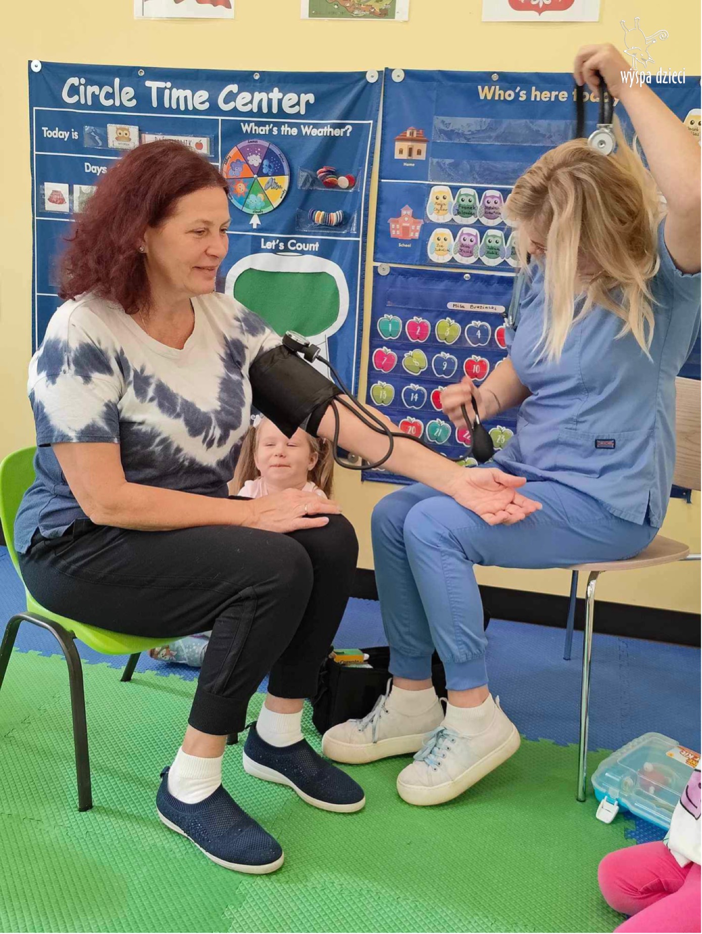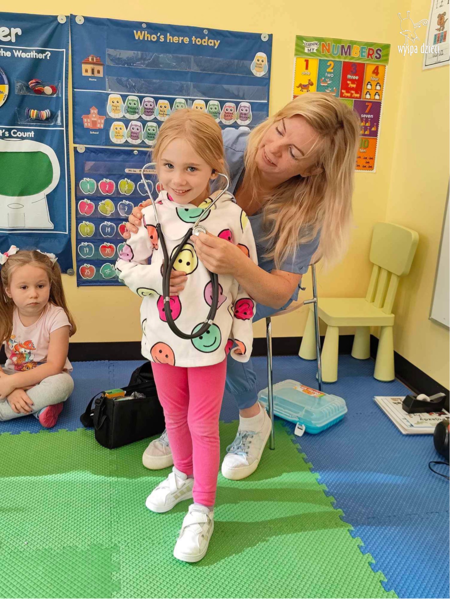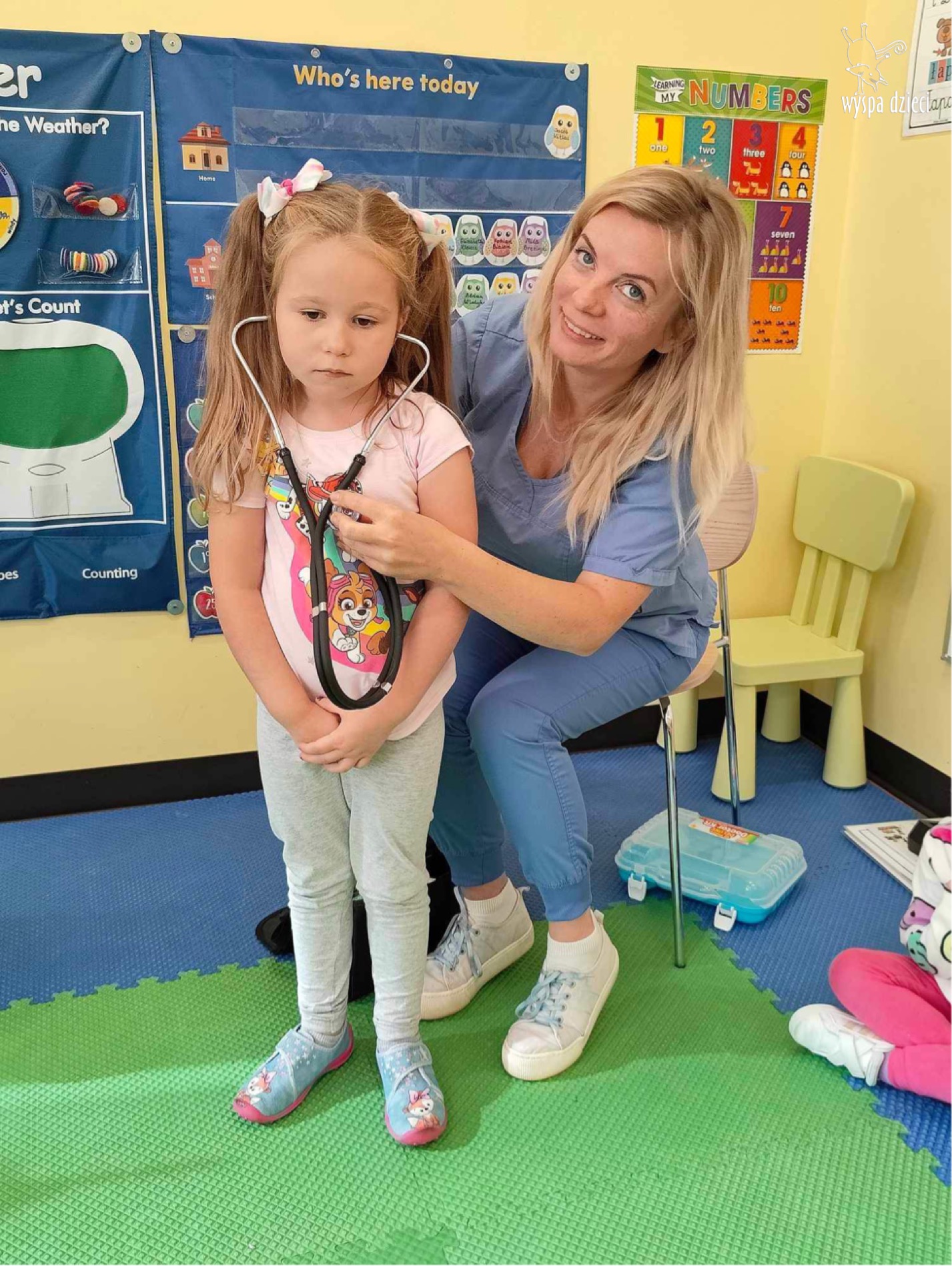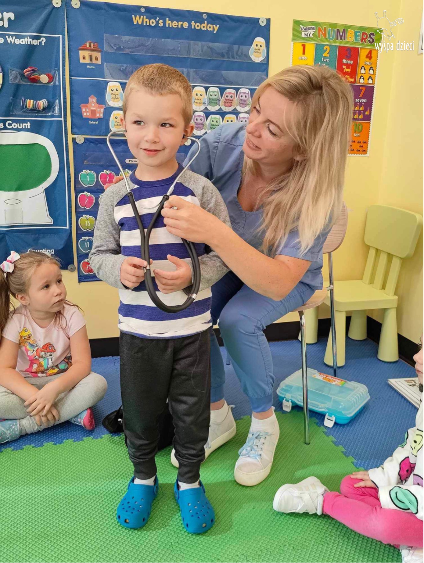 W tym tygodniu na Wyspie Dzieci w River Grove rozmawiamy o zawodach. Z tej okazji grupa Bystrzaków gościła mamę Adrianka. Pani Katarzyna opowiadała o ciekawym zawodzie pielęgniarki, który wykonuje na co dzień. Przyniosła ze sobą kilka przedmiotów, z których korzysta w pracy. Każdy chciał posłuchać bicia swego serca, sprawdzić, czy ma wystarczającą ilość tlenu do oddychania czy też zmierzyć ciśnienie. Na koniec dzieci otrzymały kolorowe plastry “tak na wszelki wypadek”, a pani Kasia laurkę z podziękowaniem za wspaniałe, pouczające spotkanie. Dziękujemy!