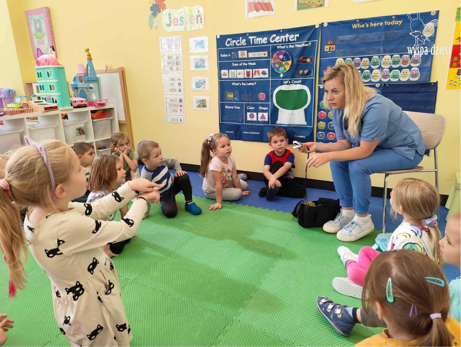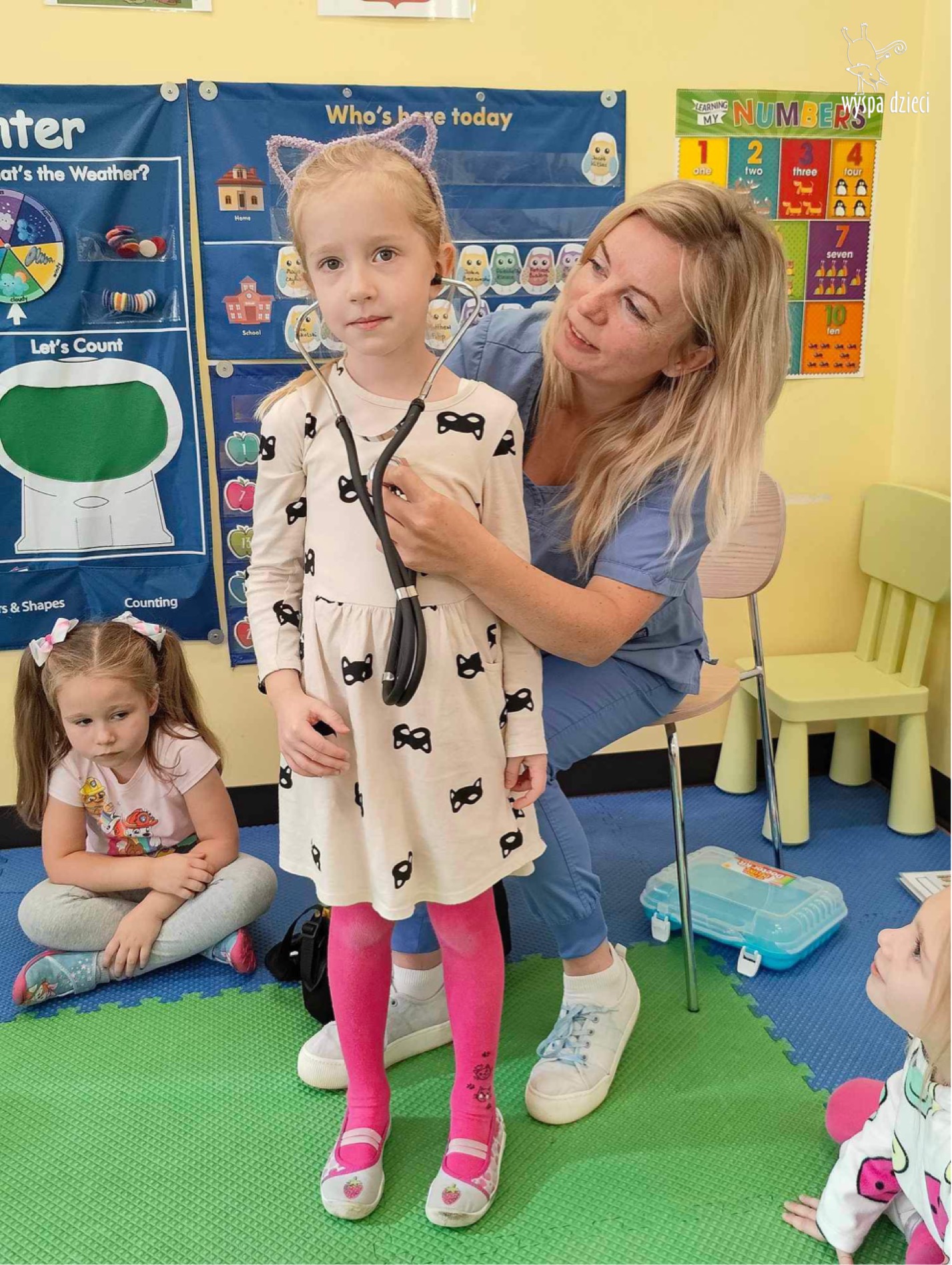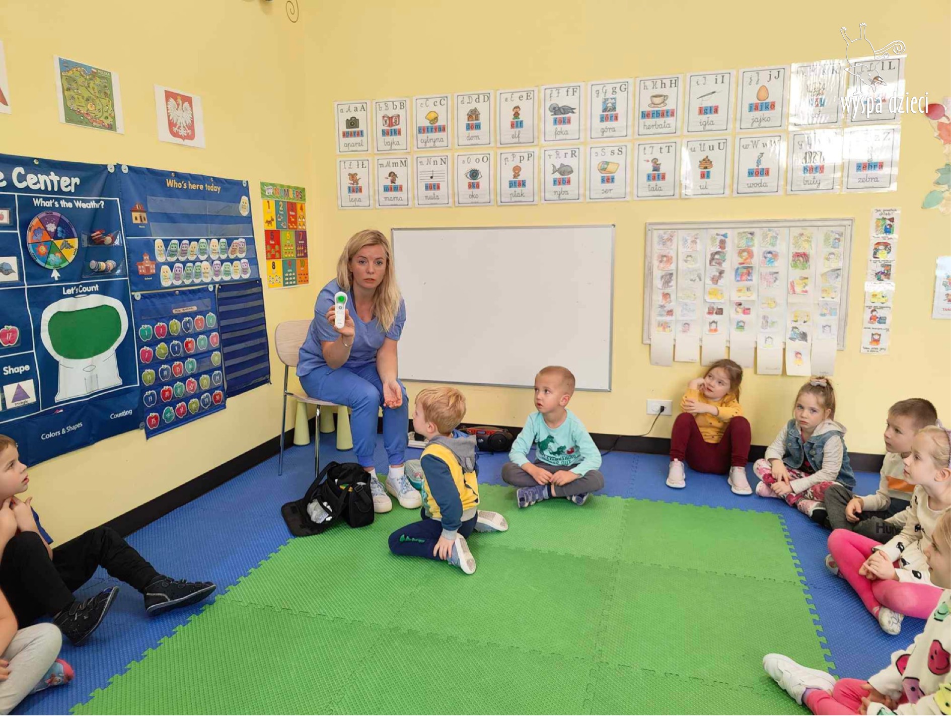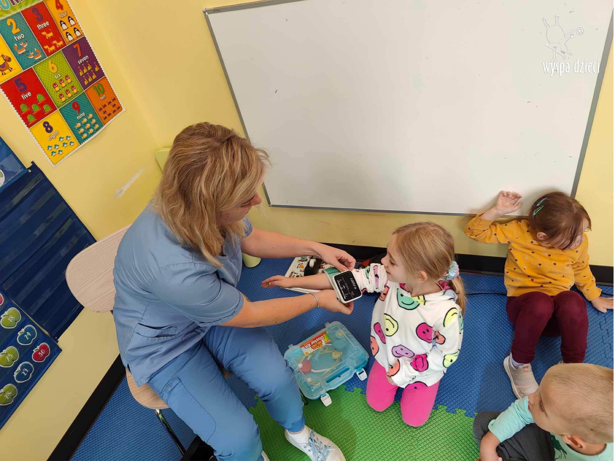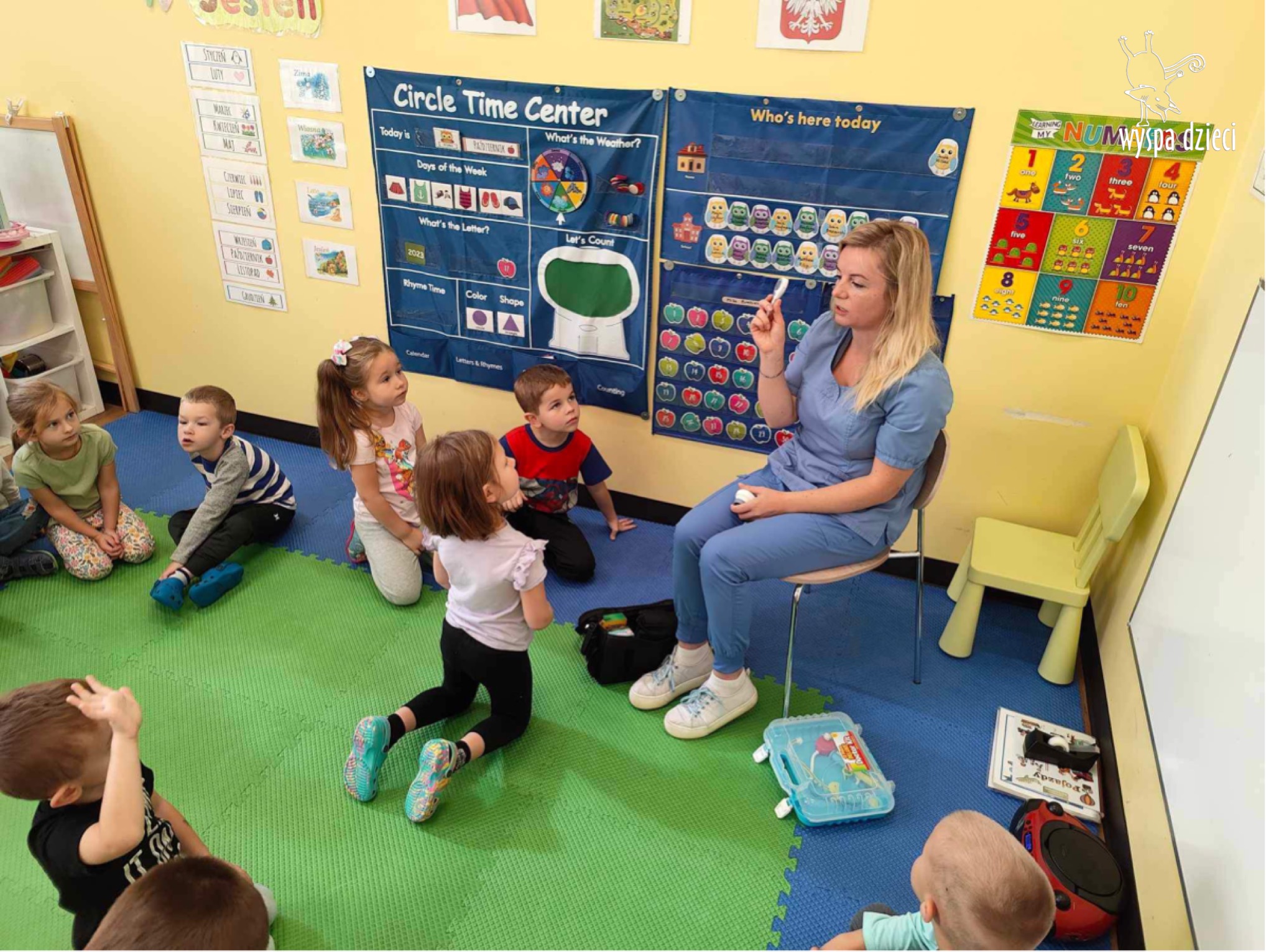 W tym tygodniu na Wyspie Dzieci w River Grove rozmawiamy o zawodach. Z tej okazji grupa Bystrzaków gościła mamę Adrianka. Pani Katarzyna opowiadała o ciekawym zawodzie pielęgniarki, który wykonuje na co dzień. Przyniosła ze sobą kilka przedmiotów, z których korzysta w pracy. Każdy chciał posłuchać bicia swego serca, sprawdzić, czy ma wystarczającą ilość tlenu do oddychania czy też zmierzyć ciśnienie. Na koniec dzieci otrzymały kolorowe plastry “tak na wszelki wypadek”, a pani Kasia laurkę z podziękowaniem za wspaniałe, pouczające spotkanie. Dziękujemy!