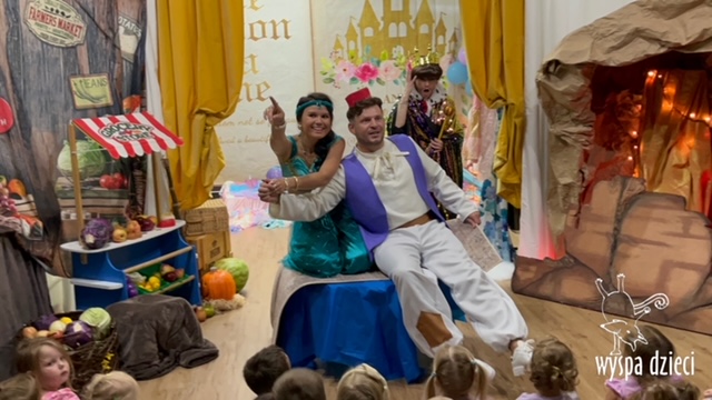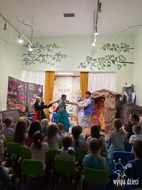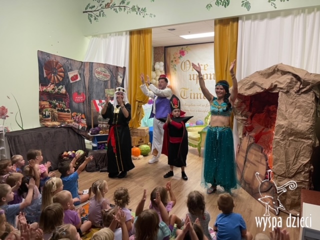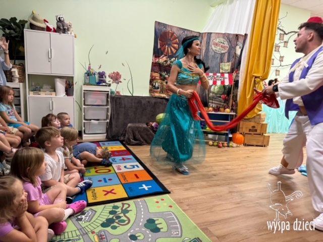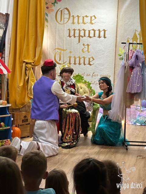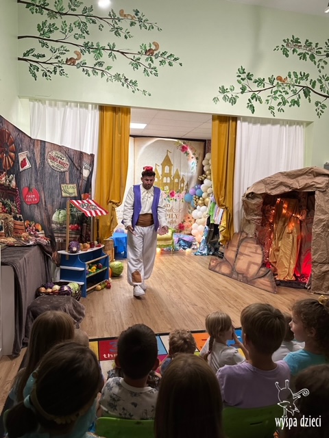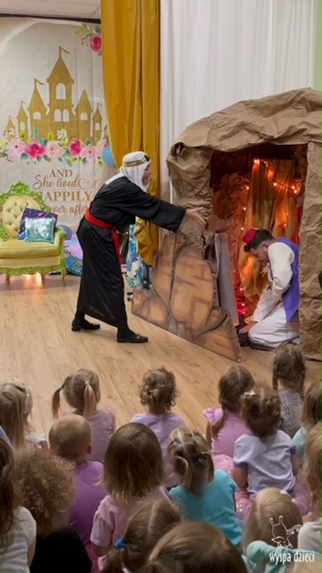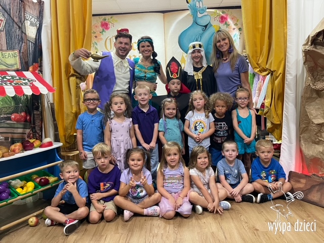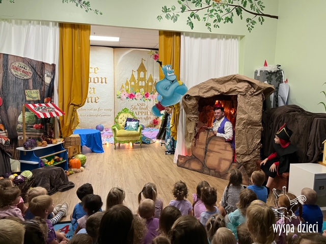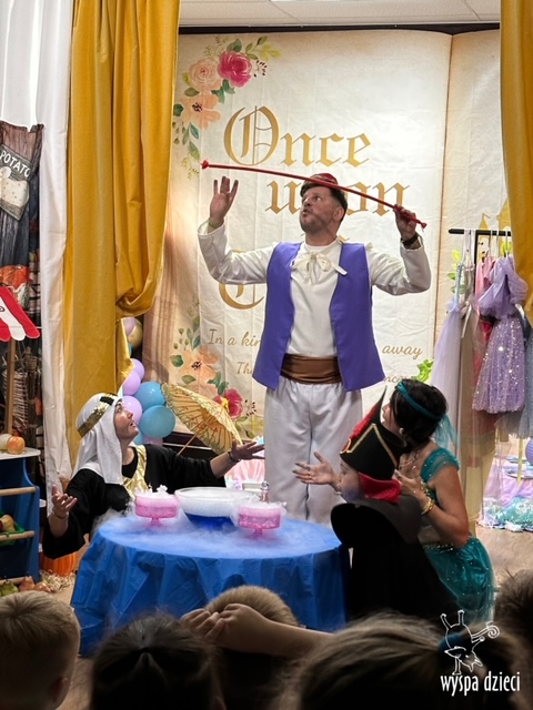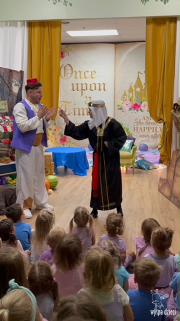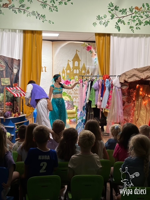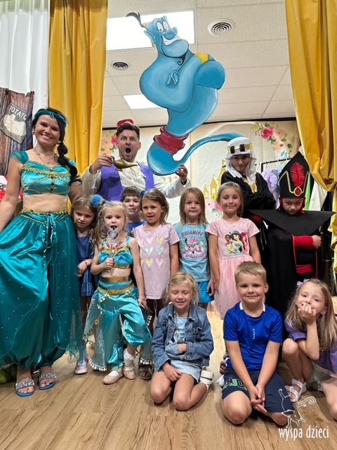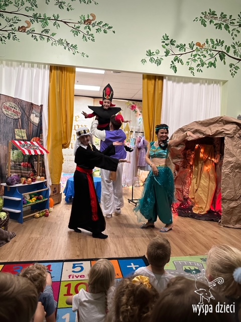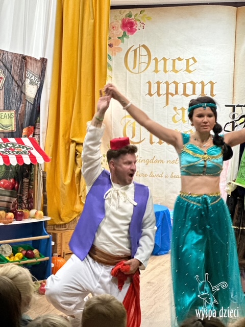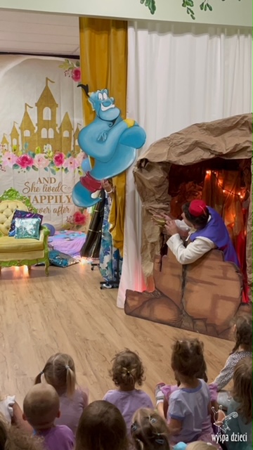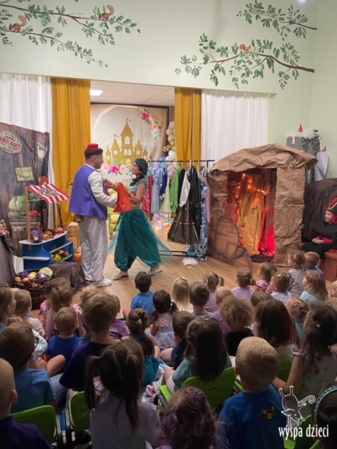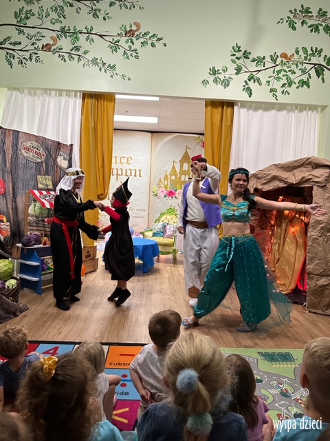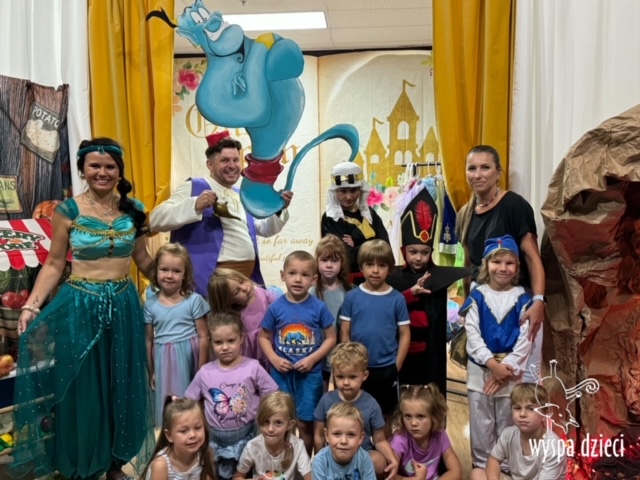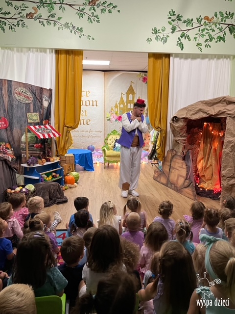 Świat bajek i baśni jest wspaniałym światem, który w sposób niezwykły pobudza wyobraźnie… Tym razem nasze przedszkolaki wybrały się w niezwykłą podróż do krainy Walta Disneya, gdzie poznali losy Aladyna, pięknej księżniczki Jasmine, Dżina i Sułtana Jafara. Tą niezykłą opowieść przedstawiły dla dzieci wychowawczynie grupy Jagódki – pani Karolina ( Jasmine) , pani Madzia ( Sułtan) , gościnnie wystąpił Super Tomasz, który wcielił się w rolę Aladyna. W przedstawieniu wziął też udział Jaś z grupy Jagódki, który był pomocnikiem Sułtana Jafara. Po obejrzeniu pięknej bajki, dzieci wzięły udział w pokazie magicznych sztuczek razem z bohaterami bajki. “Dżinie, dżinie, dżinie , otwórz nam magiczną skrzynię” -tak brzmiało magiczne zaklęcie naszych przedszkolaków. Ten dzień pozostanie na długo w pamięci naszych przedszkolaków…
