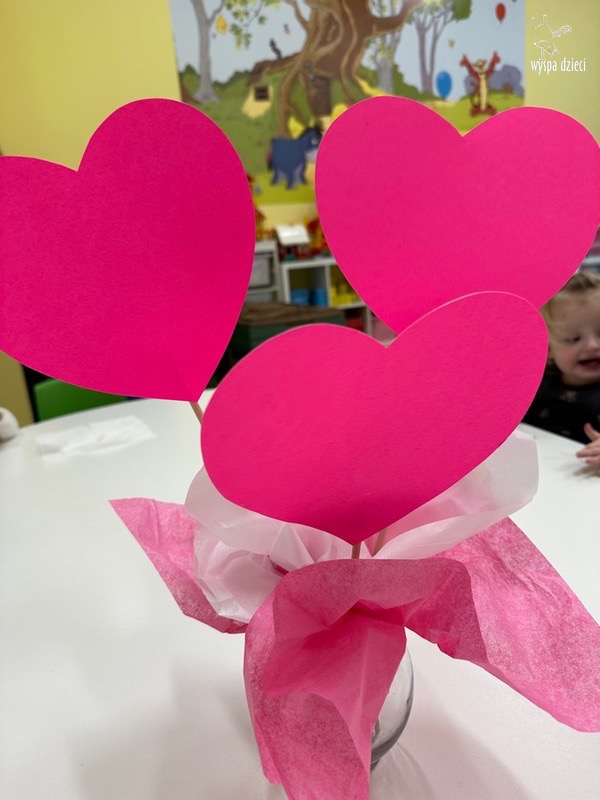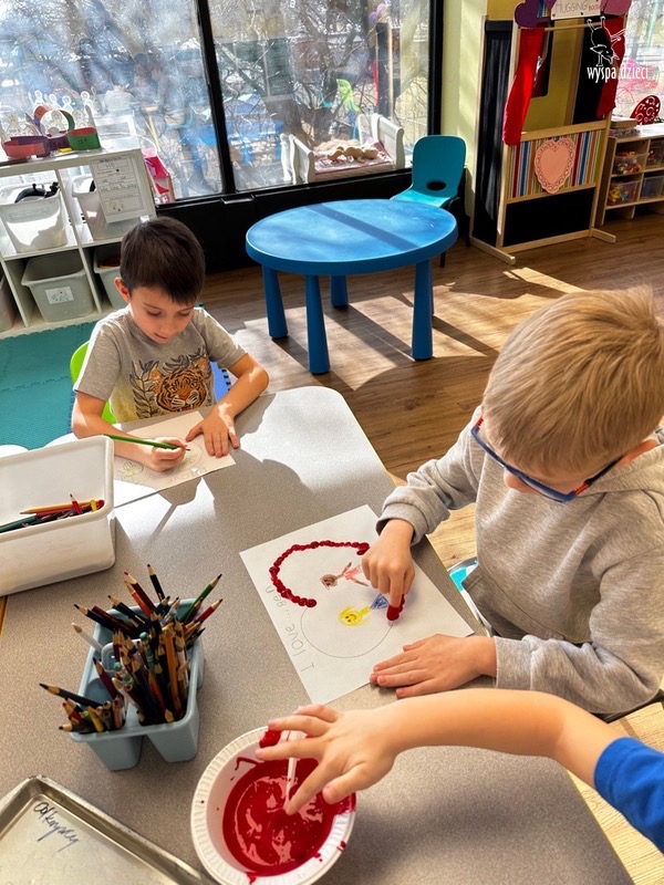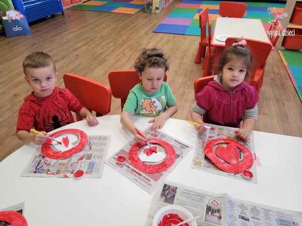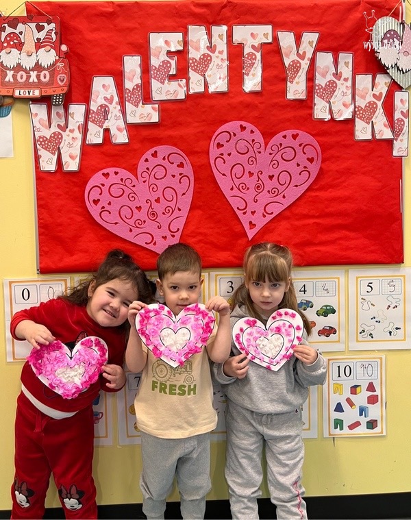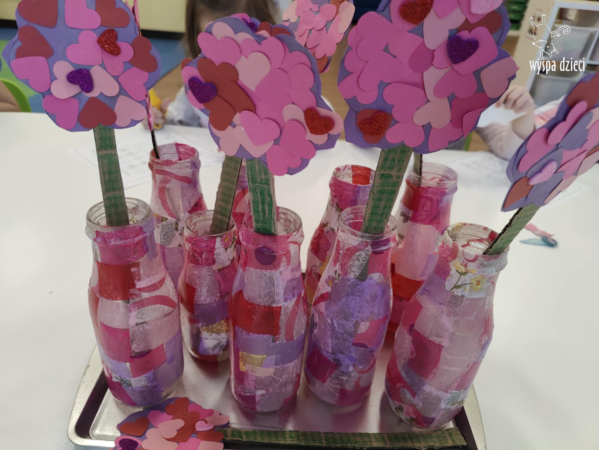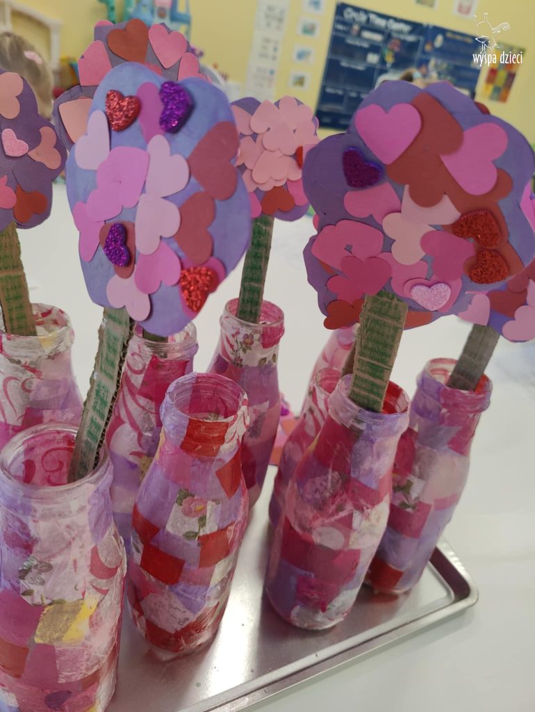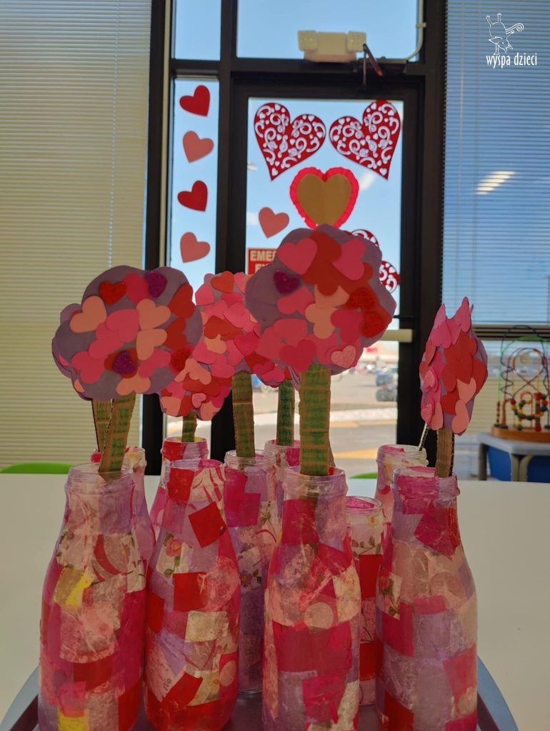Przez cały tydzień Wyspa Dzieci River Grove zamieniła się w krainę miłości i przyjaźni. W przedszkolu królował kolor czerwony. Dzieci poznały tradycje walentynkowe, dowiedziały się jak ważne jest okazywanie uczuć przyjaźni i sympatii w stosunku do innych ludzi. Wyklejały, rysowały i kolorowały serduszka, wykonywały laurki. Grupa Bystrzaków wykonała przepiękne czerwone i różowe wazoniki, które następnie podarowały swoim Walentynkom.