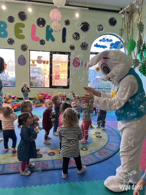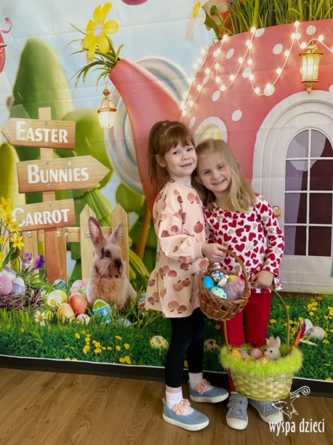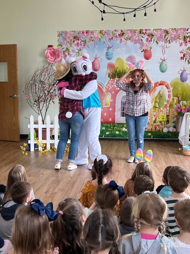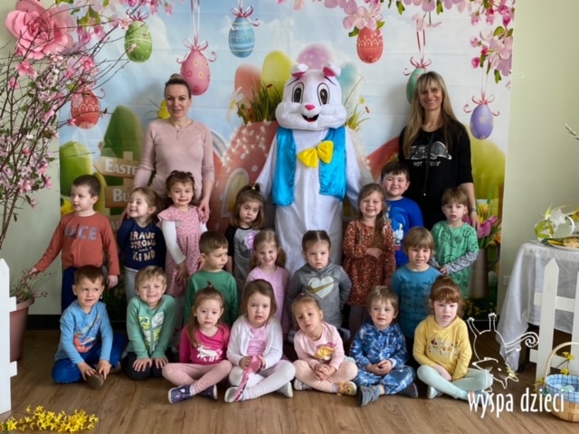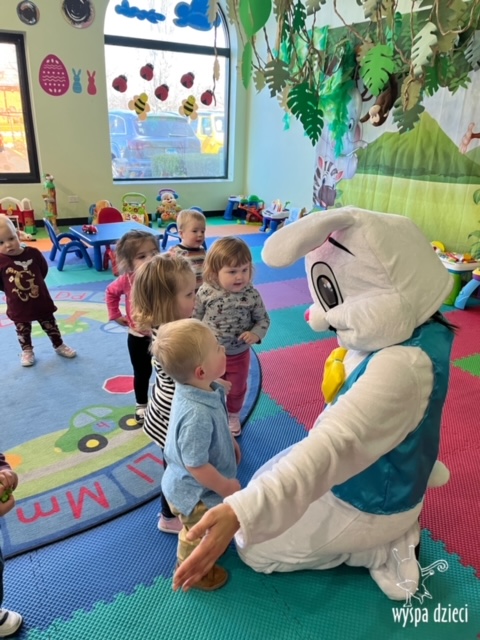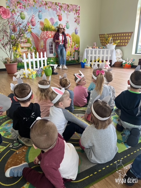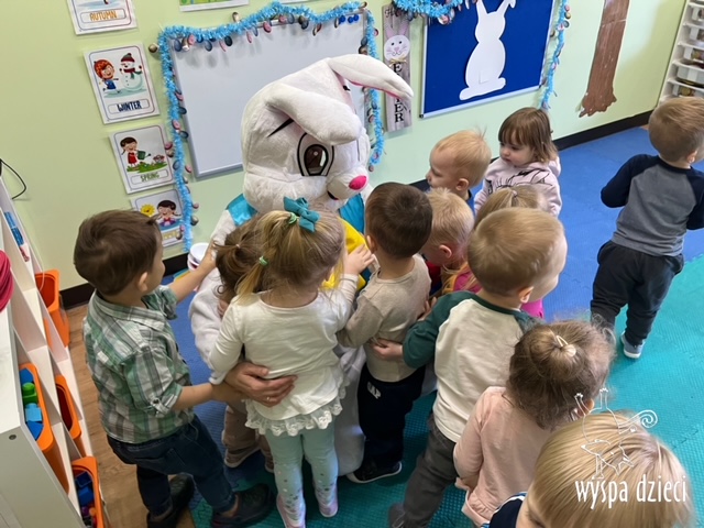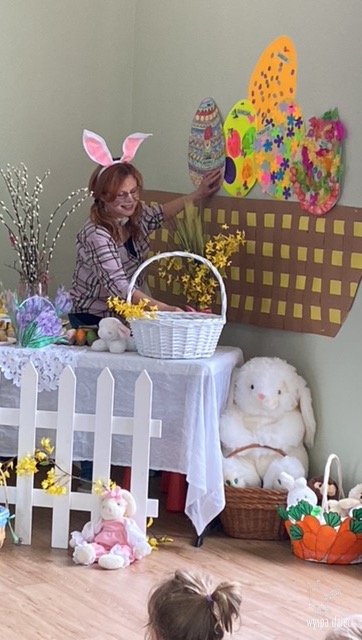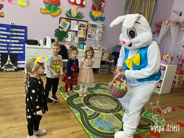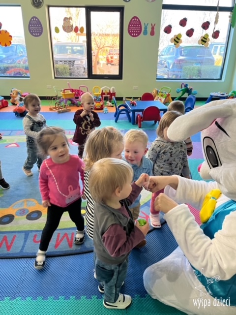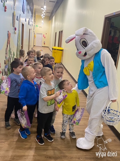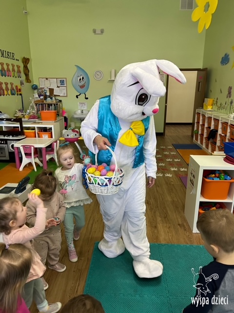 Wielkanoc tuż, tuż… W ostatnich dniach na Wyspie Dzieci w Algonquin można było poczuć wielkanocny klimat. Nauczycielki z grupy Odkrywcy – p. Kasia i p. Mariola przygotowały dla dzieci piękne wielkanocne przedstawienie, które wprowadziło wszystkich w świateczny klimat. Króliki pięknie przygotowały swój domek do odwiedzin ich kuzyna – królika wielkanocnego. Króliczki posprzatały, przygotowały świąteczne wypieki, udekorowały swój domek baziami i żonkilami. Niestety okazało się, że są w nie lada problemie, gdyż zabrakło im wielkanocnych jajek, a bez tego nie mogło się obyć przy wizycie wyjątkowego kuzyna! Na szczęście nasze przedszkolaki pomogły królikom przygotowując piękne wialkanocne jajka! Każda grupa przygotowała swoje unikatowe jajeczko, które podarowała dla zaprzyjaźnionych królików.