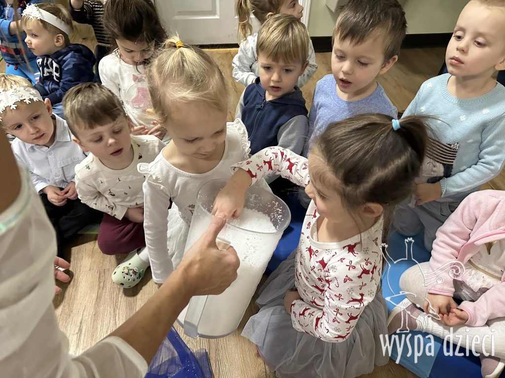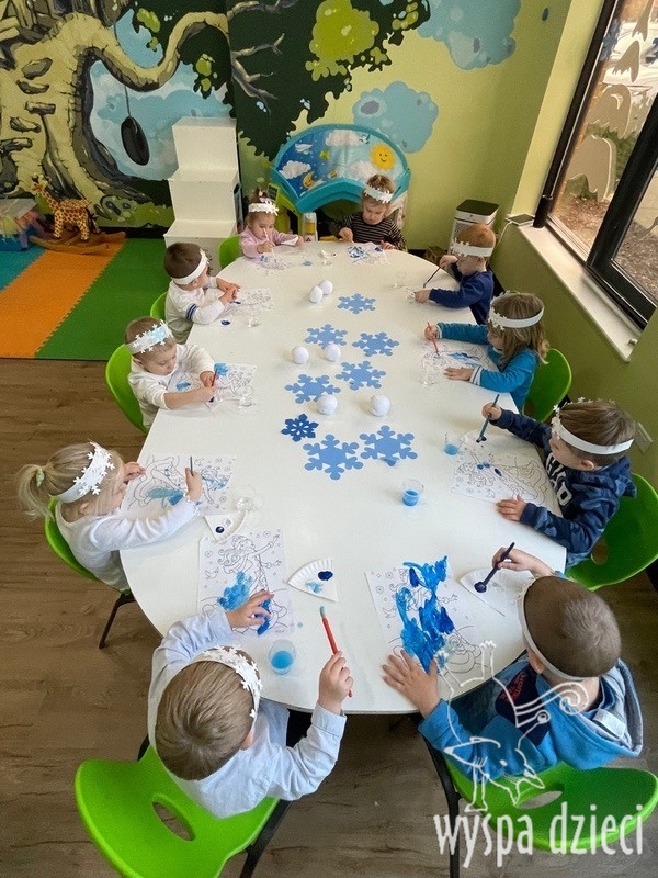 Przyszła zima biała, śniegu nasypała, zamroziła wodę, staw pokryła lodem… tupu, tup po śniegu, dzyń, dzyń, dzyń na sankach, skrzypu, skrzyp na mrozie, lepimy bałwanka!