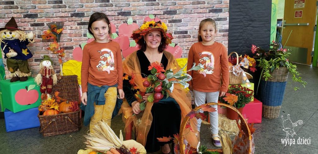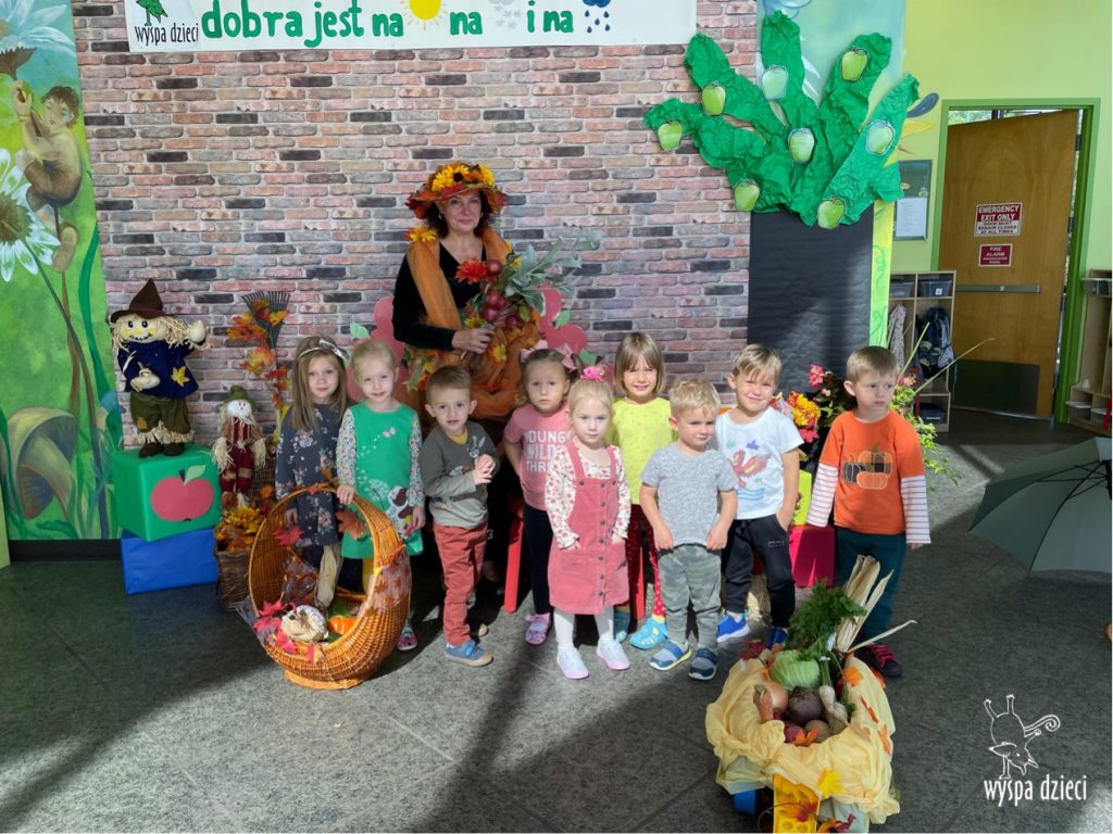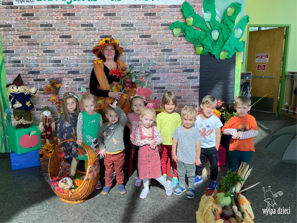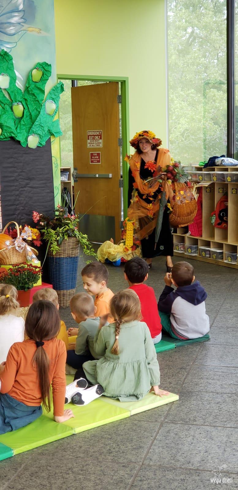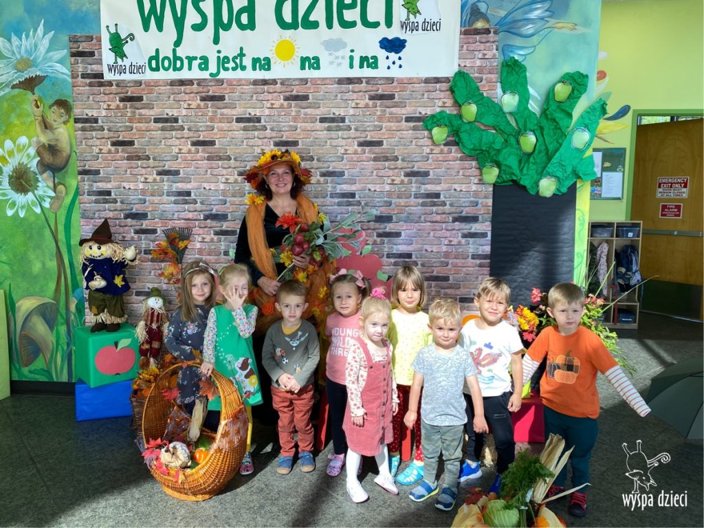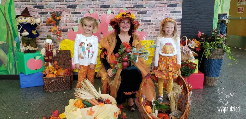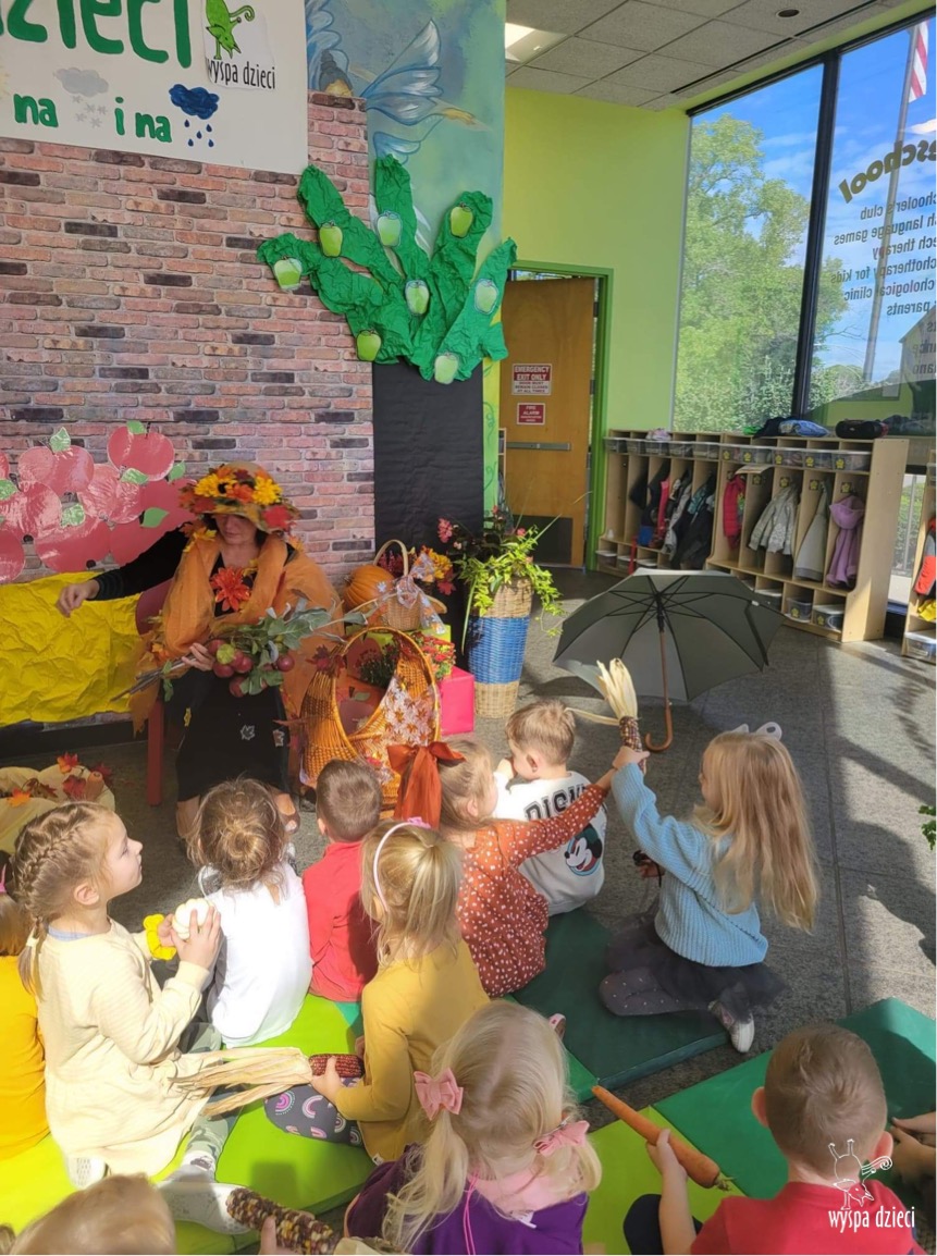 Dnia 23 września w naszej Wyspie Dzieci w River Grove można było spotkać Panią Jesień. Zostala ona powitana przez przedszkolaki z wielkim entuzjazmem, bowiem przybyła do nich w kapeluszu z liscmi w pieknej jesiennej sukni a w koszyczku trzymała ciekawe prezenty. Przyniosła dla dzieci prawdziwe dary jesieni z ogrodu i sadu. Przedszkolaki odgadywaly jesienne zagadki oraz rozpoznawały dary jesieni.