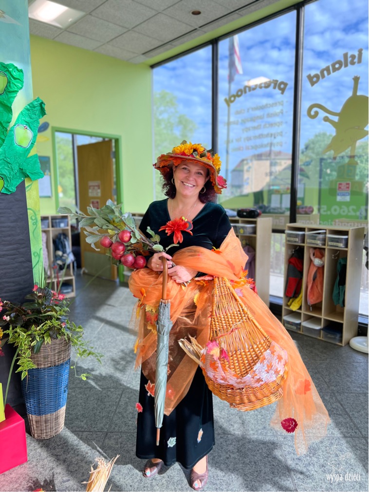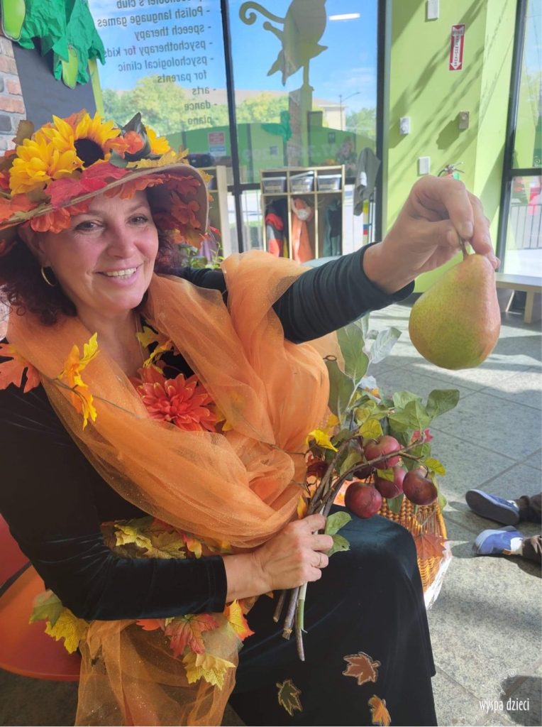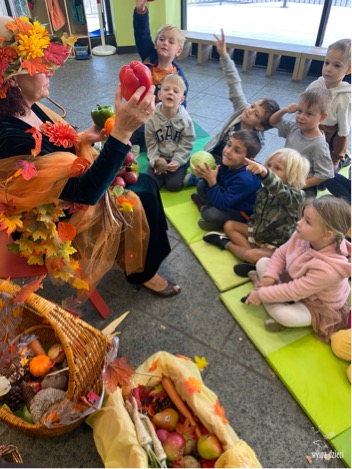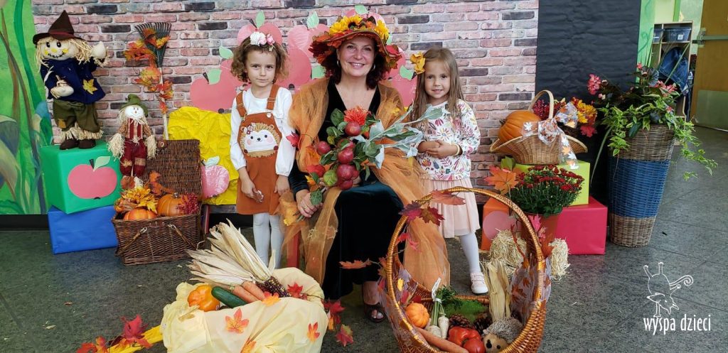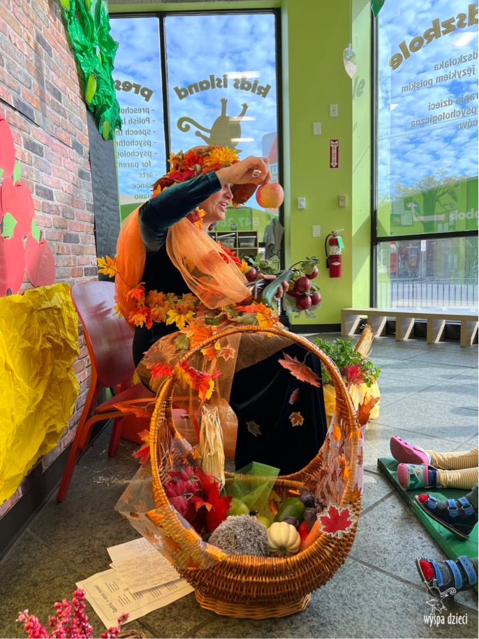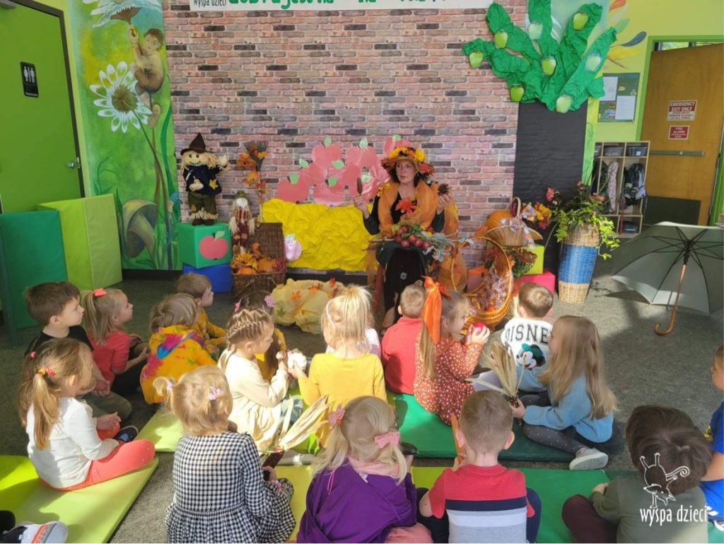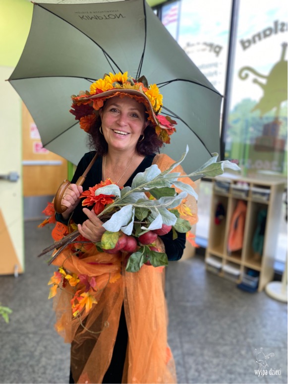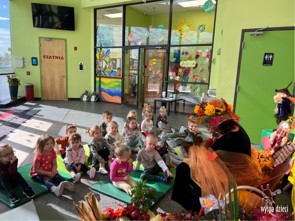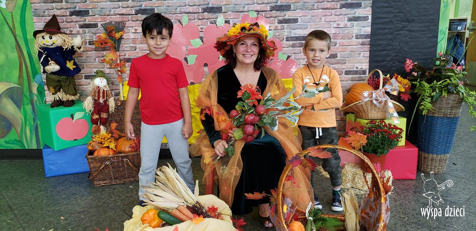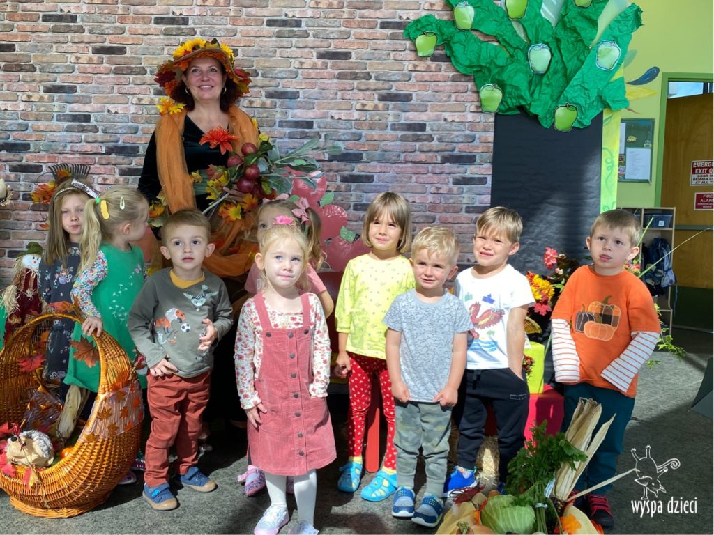 Dnia 23 września w naszej Wyspie Dzieci w River Grove można było spotkać Panią Jesień. Zostala ona powitana przez przedszkolaki z wielkim entuzjazmem, bowiem przybyła do nich w kapeluszu z liscmi w pieknej jesiennej sukni a w koszyczku trzymała ciekawe prezenty. Przyniosła dla dzieci prawdziwe dary jesieni z ogrodu i sadu. Przedszkolaki odgadywaly jesienne zagadki oraz rozpoznawały dary jesieni.