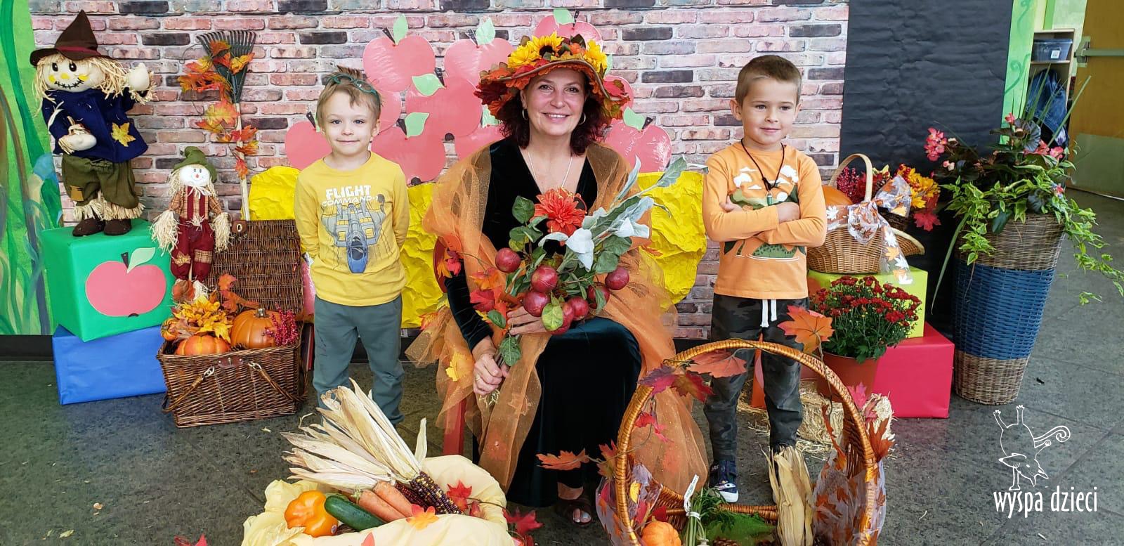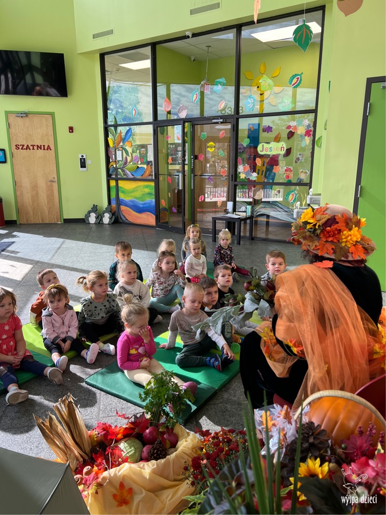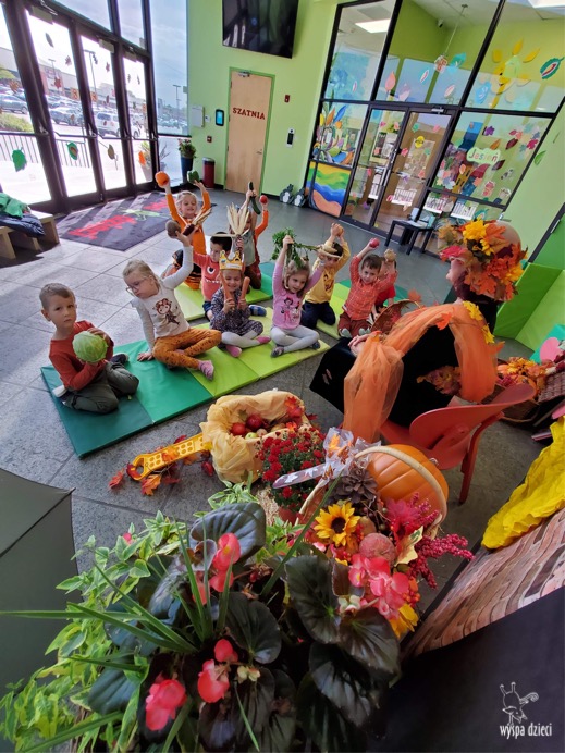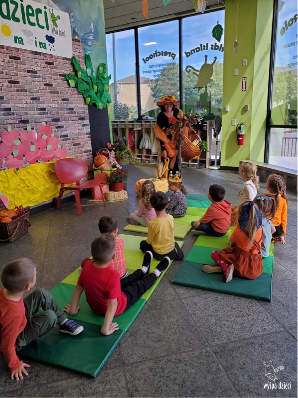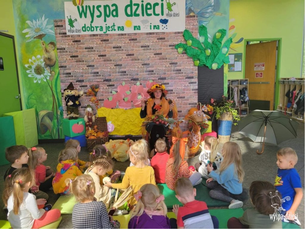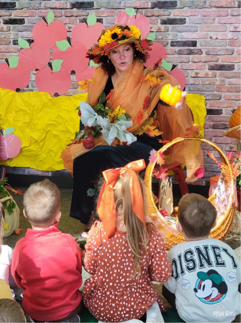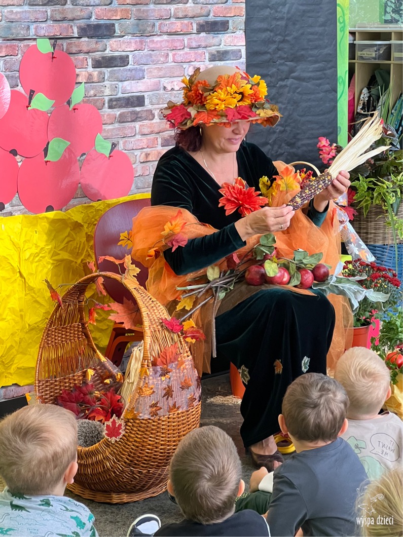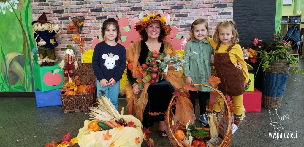 Dnia 23 września w naszej Wyspie Dzieci w River Grove można było spotkać Panią Jesień. Zostala ona powitana przez przedszkolaki z wielkim entuzjazmem, bowiem przybyła do nich w kapeluszu z liscmi w pieknej jesiennej sukni a w koszyczku trzymała ciekawe prezenty. Przyniosła dla dzieci prawdziwe dary jesieni z ogrodu i sadu. Przedszkolaki odgadywaly jesienne zagadki oraz rozpoznawały dary jesieni.