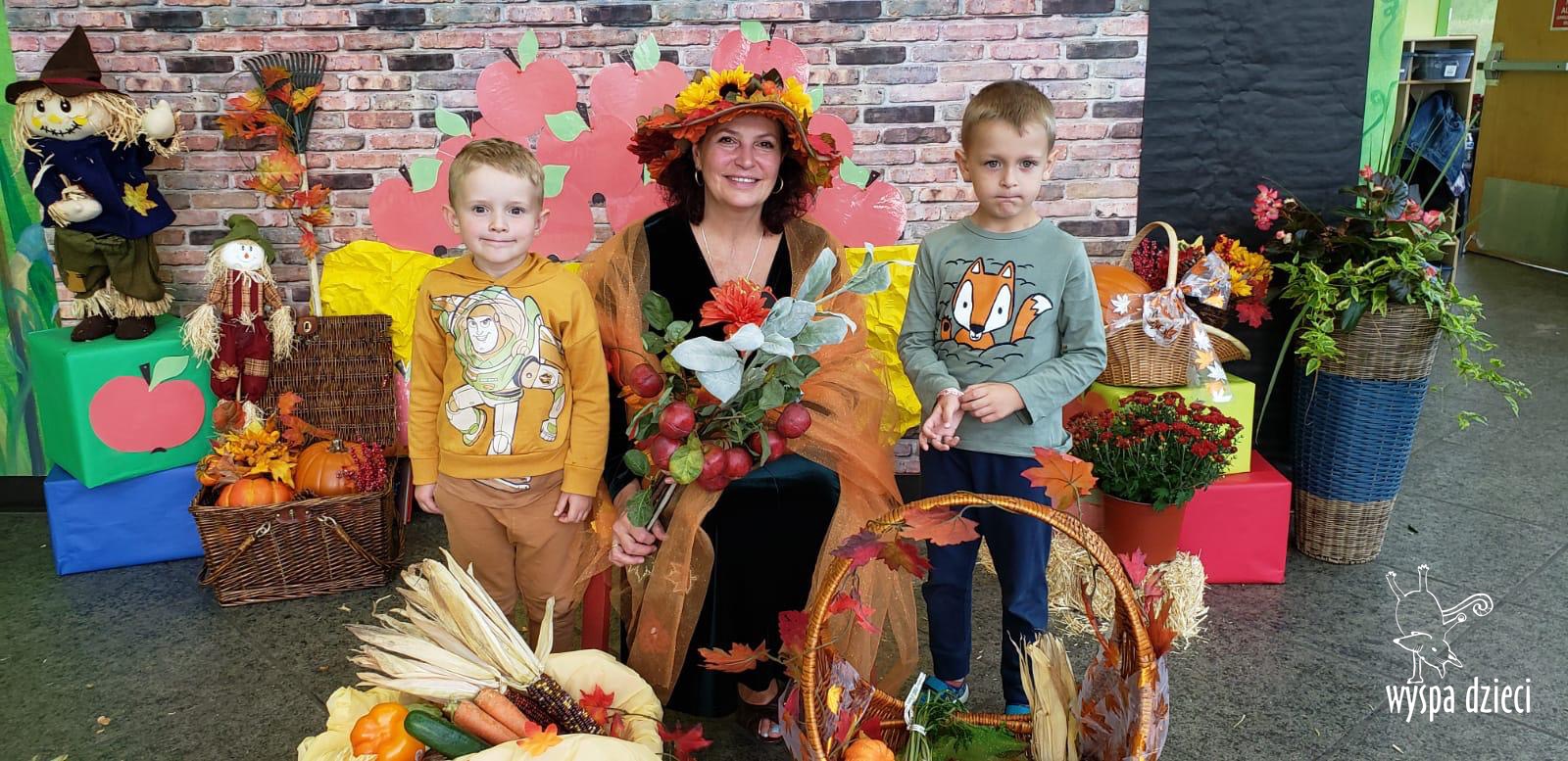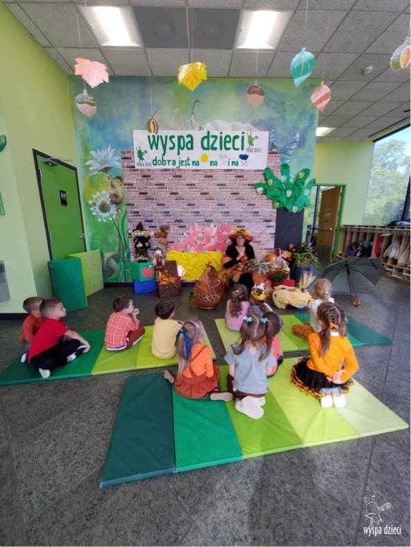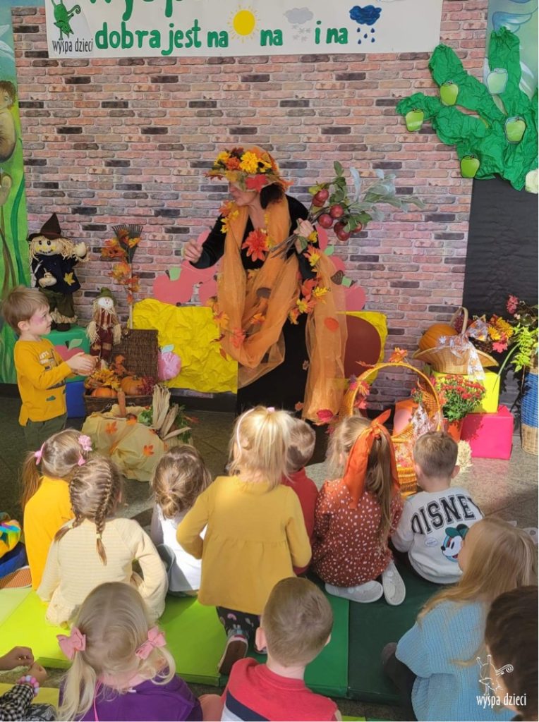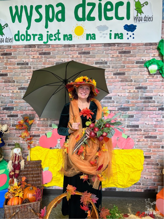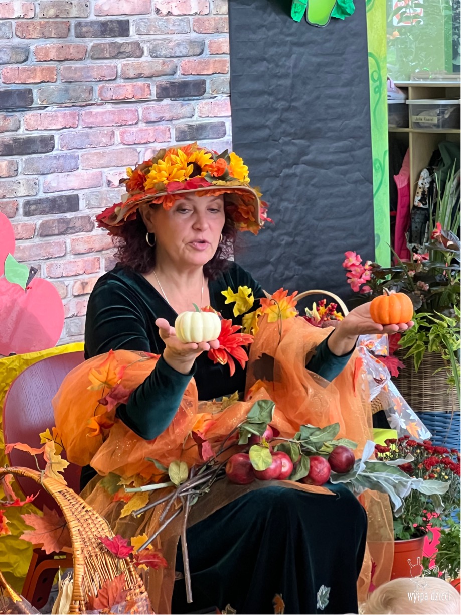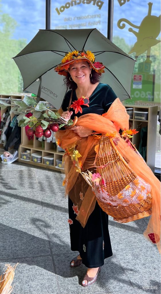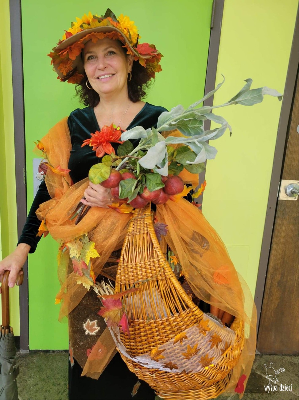 Dnia 23 września w naszej Wyspie Dzieci w River Grove można było spotkać Panią Jesień. Zostala ona powitana przez przedszkolaki z wielkim entuzjazmem, bowiem przybyła do nich w kapeluszu z liscmi w pieknej jesiennej sukni a w koszyczku trzymała ciekawe prezenty. Przyniosła dla dzieci prawdziwe dary jesieni z ogrodu i sadu. Przedszkolaki odgadywaly jesienne zagadki oraz rozpoznawały dary jesieni.