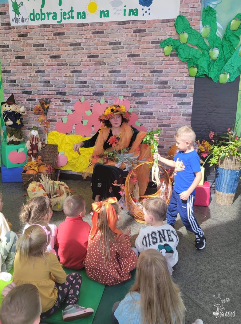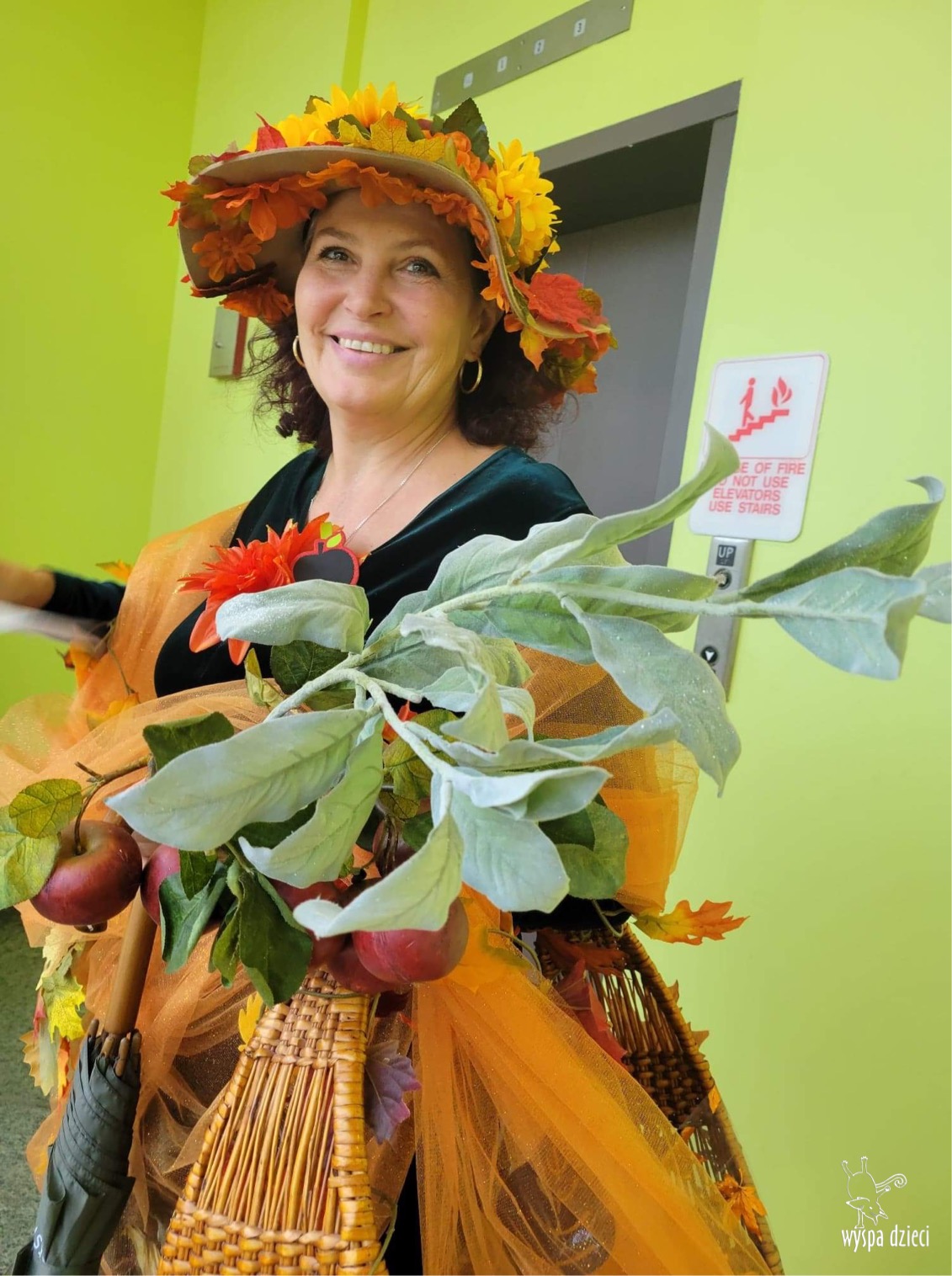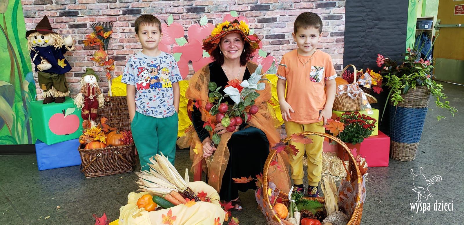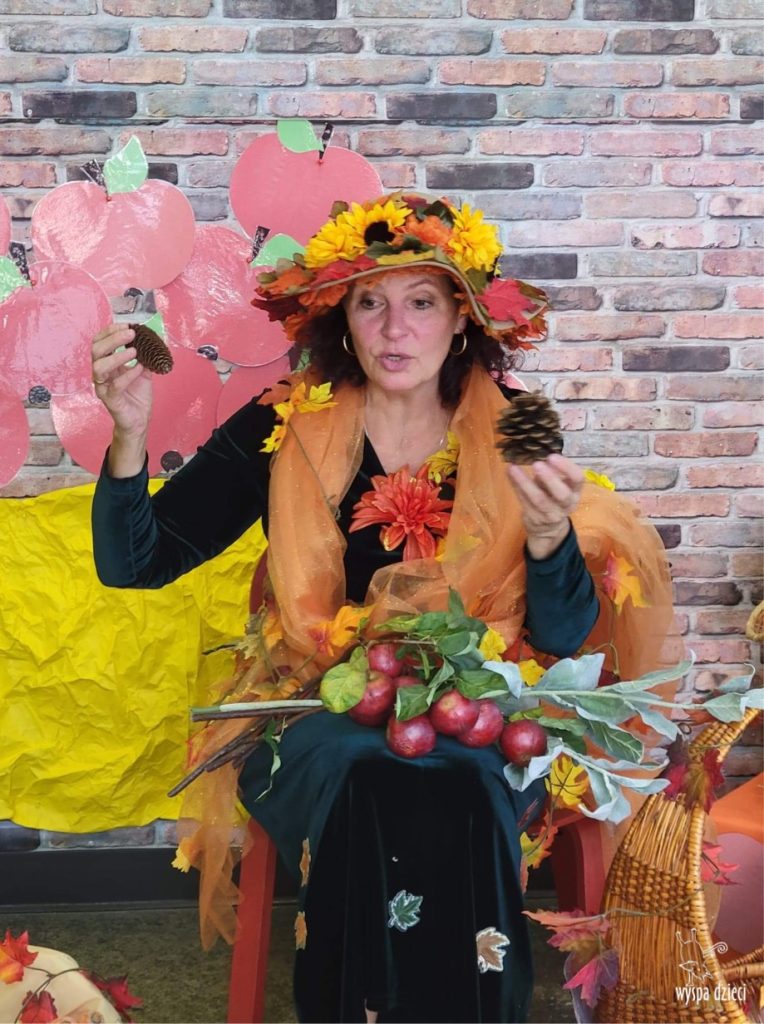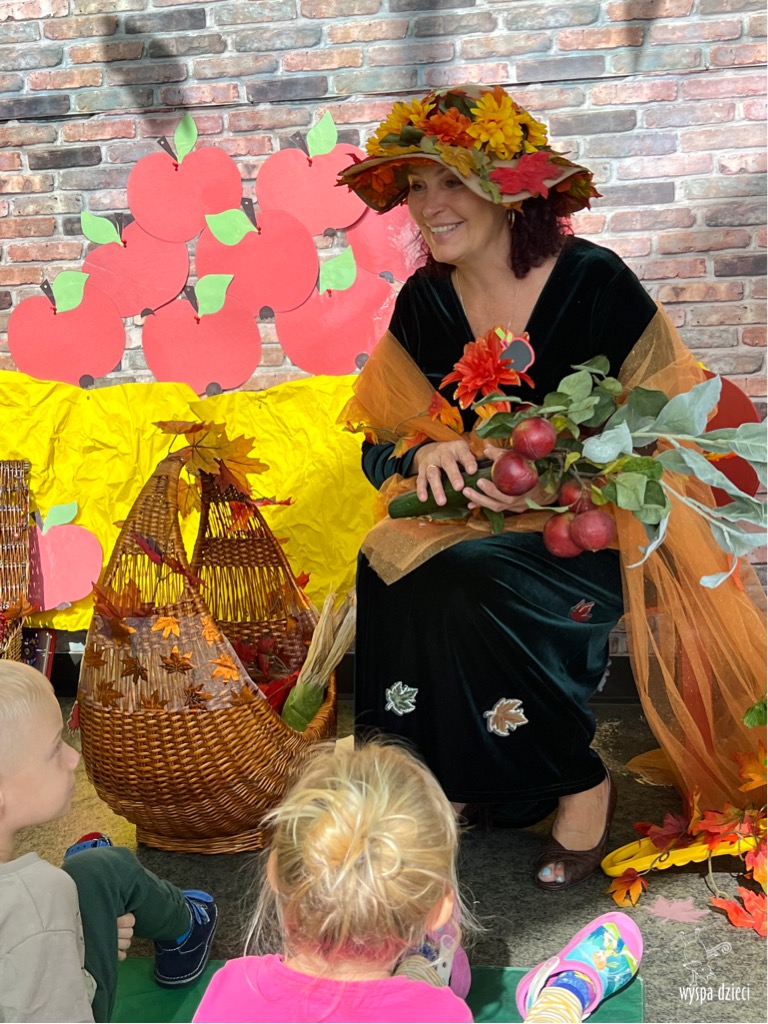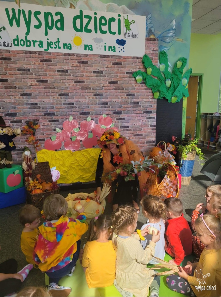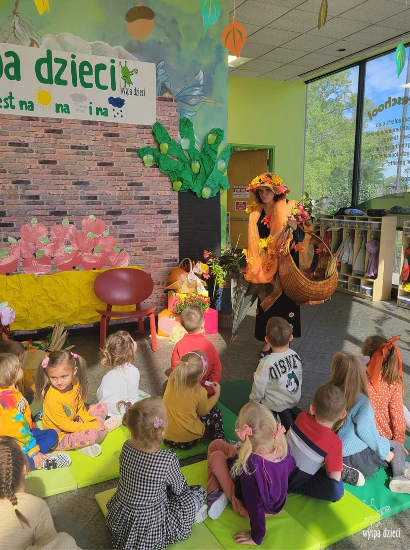 Dnia 23 września w naszej Wyspie Dzieci w River Grove można było spotkać Panią Jesień. Zostala ona powitana przez przedszkolaki z wielkim entuzjazmem, bowiem przybyła do nich w kapeluszu z liscmi w pieknej jesiennej sukni a w koszyczku trzymała ciekawe prezenty. Przyniosła dla dzieci prawdziwe dary jesieni z ogrodu i sadu. Przedszkolaki odgadywaly jesienne zagadki oraz rozpoznawały dary jesieni.