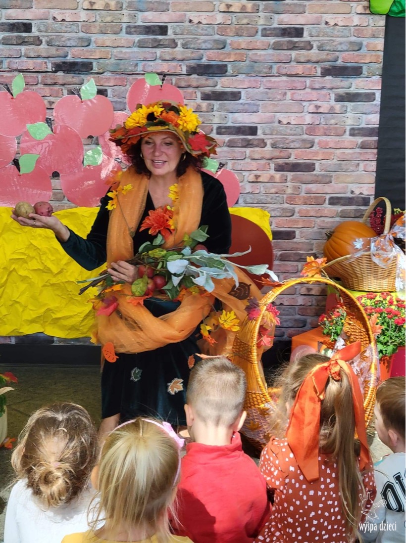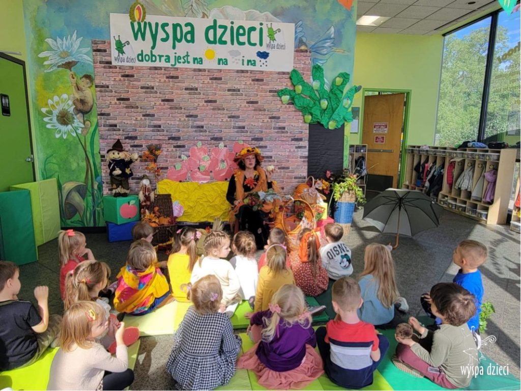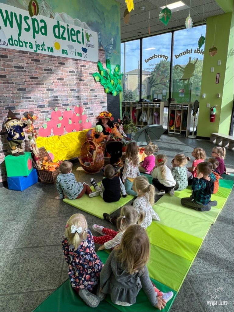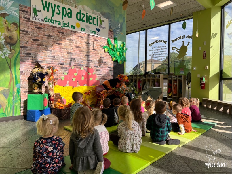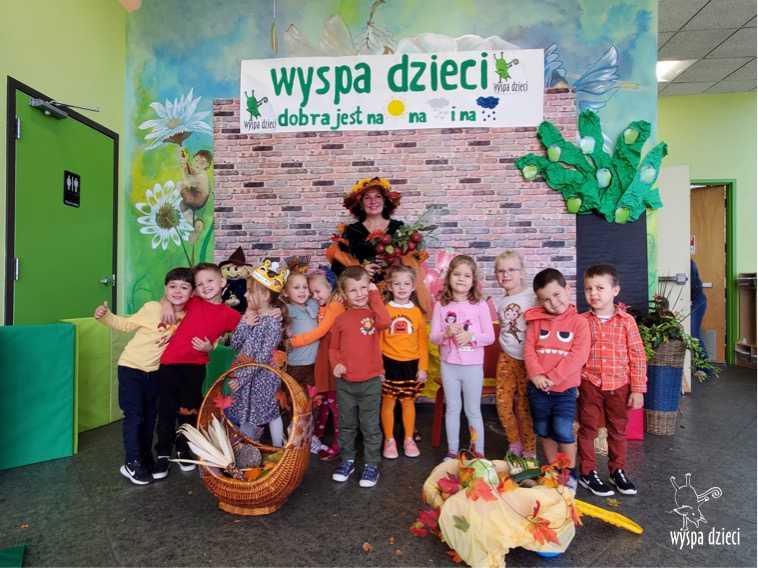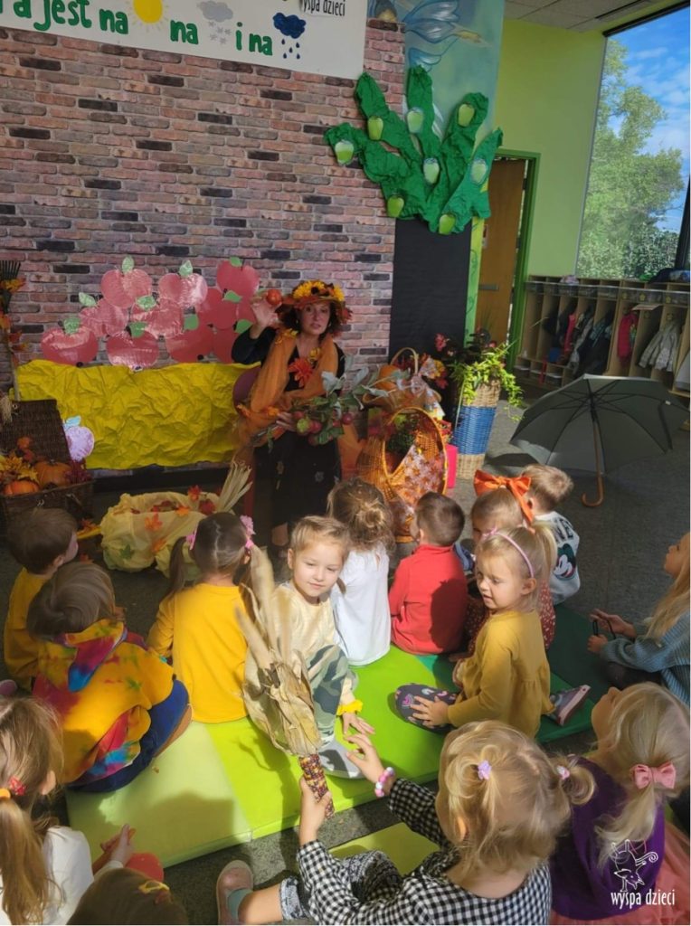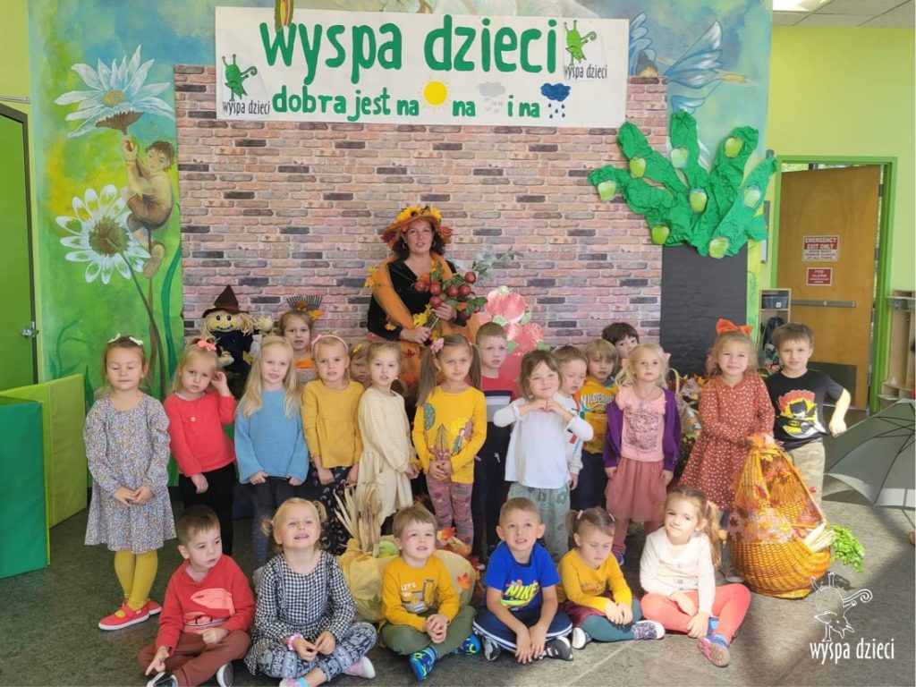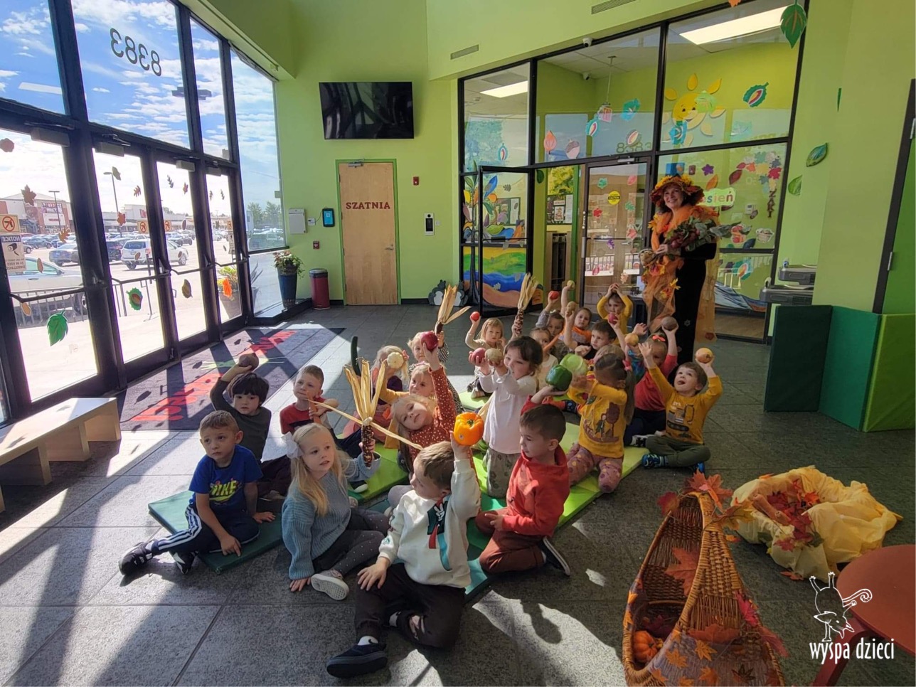 Dnia 23 września w naszej Wyspie Dzieci w River Grove można było spotkać Panią Jesień. Zostala ona powitana przez przedszkolaki z wielkim entuzjazmem, bowiem przybyła do nich w kapeluszu z liscmi w pieknej jesiennej sukni a w koszyczku trzymała ciekawe prezenty. Przyniosła dla dzieci prawdziwe dary jesieni z ogrodu i sadu. Przedszkolaki odgadywaly jesienne zagadki oraz rozpoznawały dary jesieni.