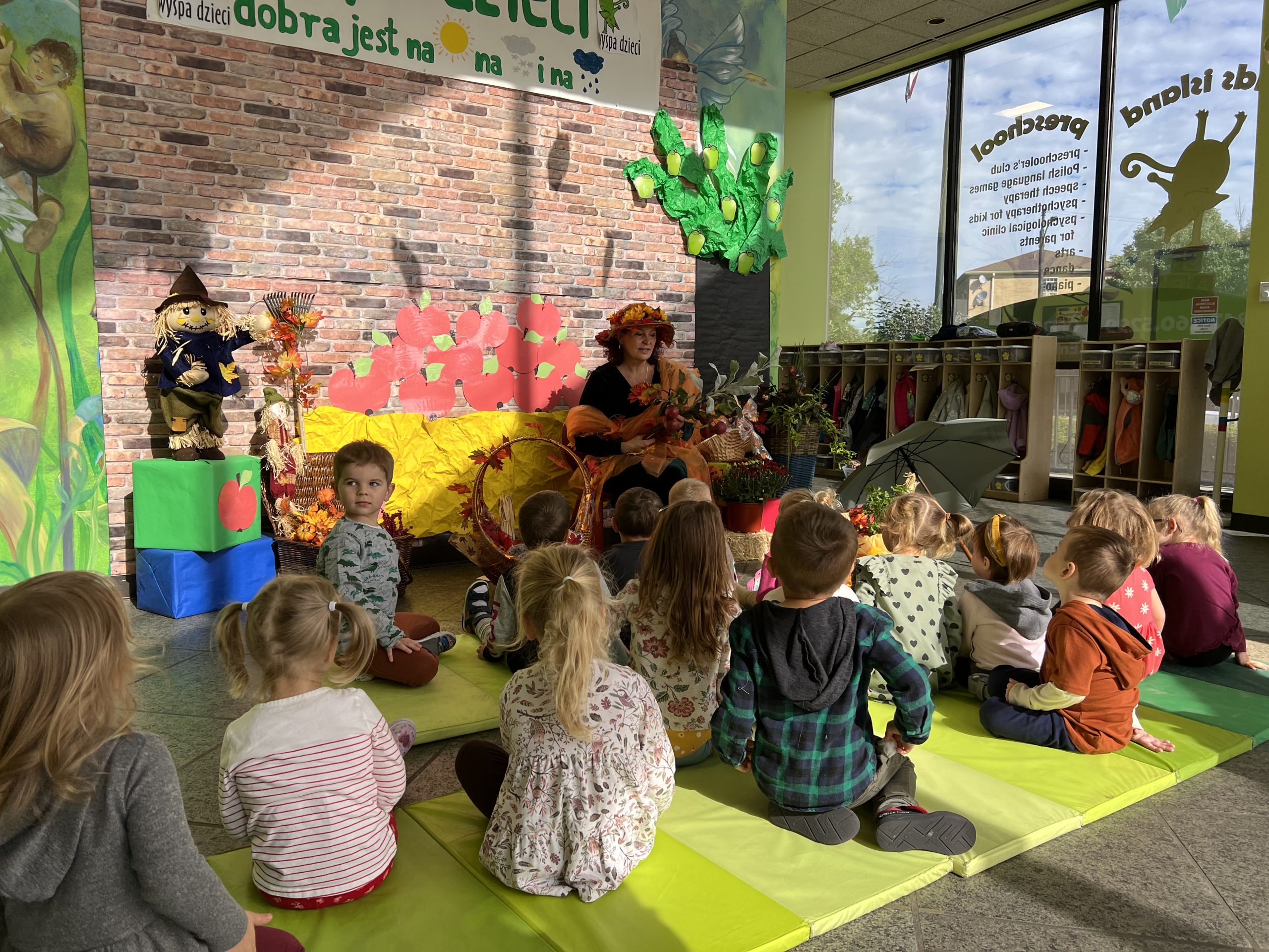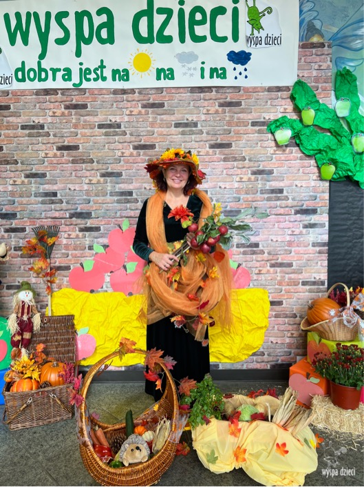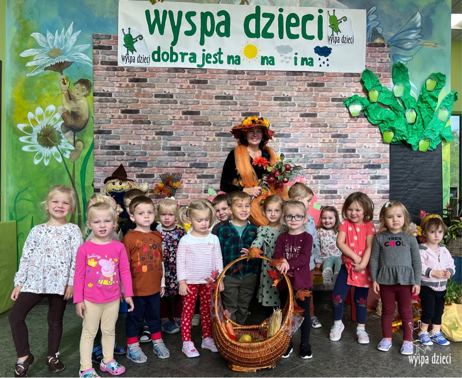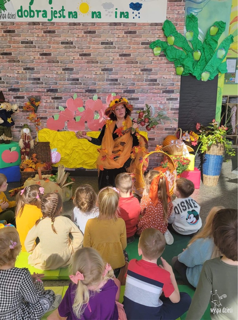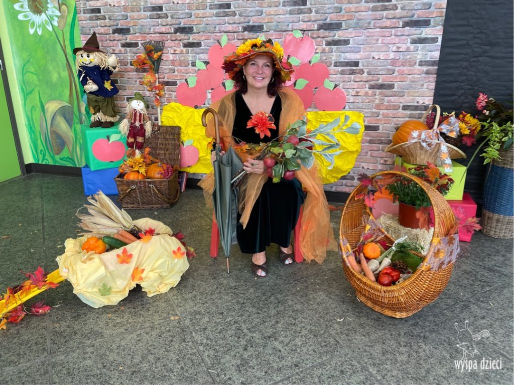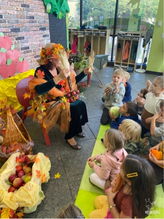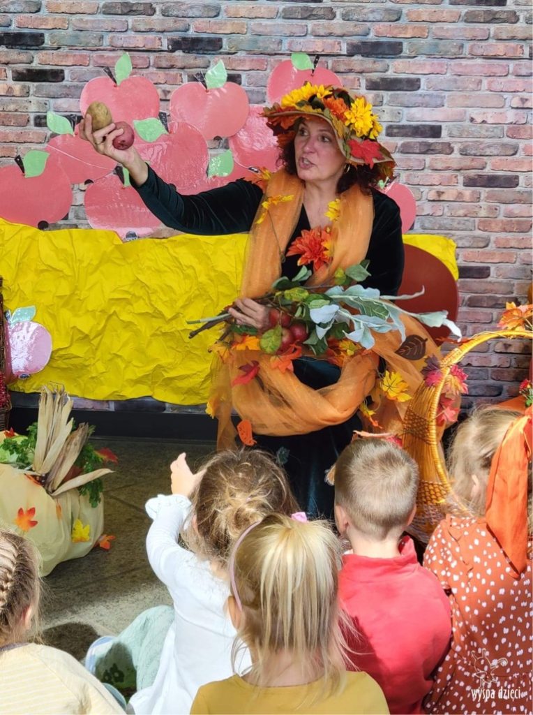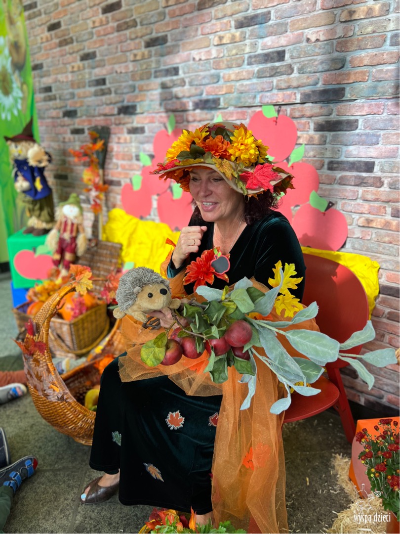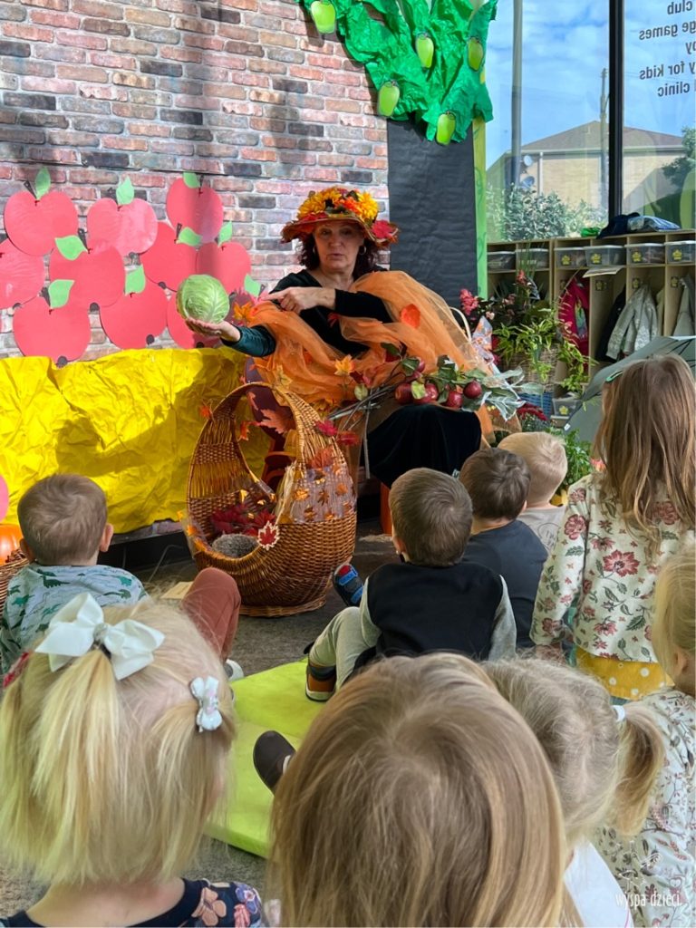 Dnia 23 września w naszej Wyspie Dzieci w River Grove można było spotkać Panią Jesień. Zostala ona powitana przez przedszkolaki z wielkim entuzjazmem, bowiem przybyła do nich w kapeluszu z liscmi w pieknej jesiennej sukni a w koszyczku trzymała ciekawe prezenty. Przyniosła dla dzieci prawdziwe dary jesieni z ogrodu i sadu. Przedszkolaki odgadywaly jesienne zagadki oraz rozpoznawały dary jesieni.