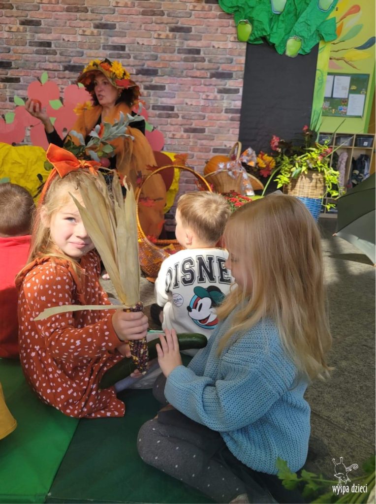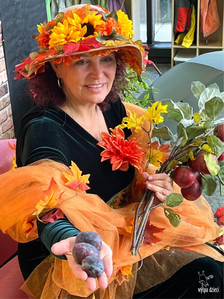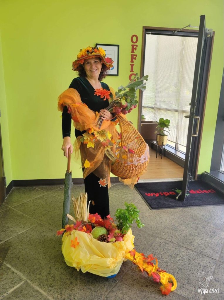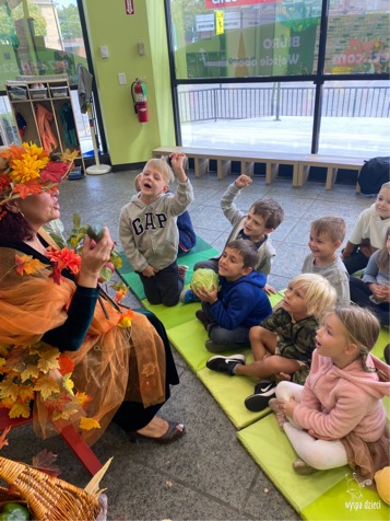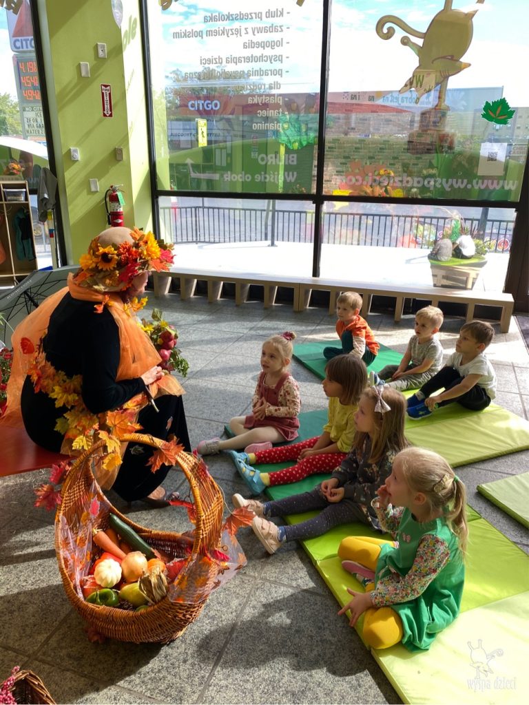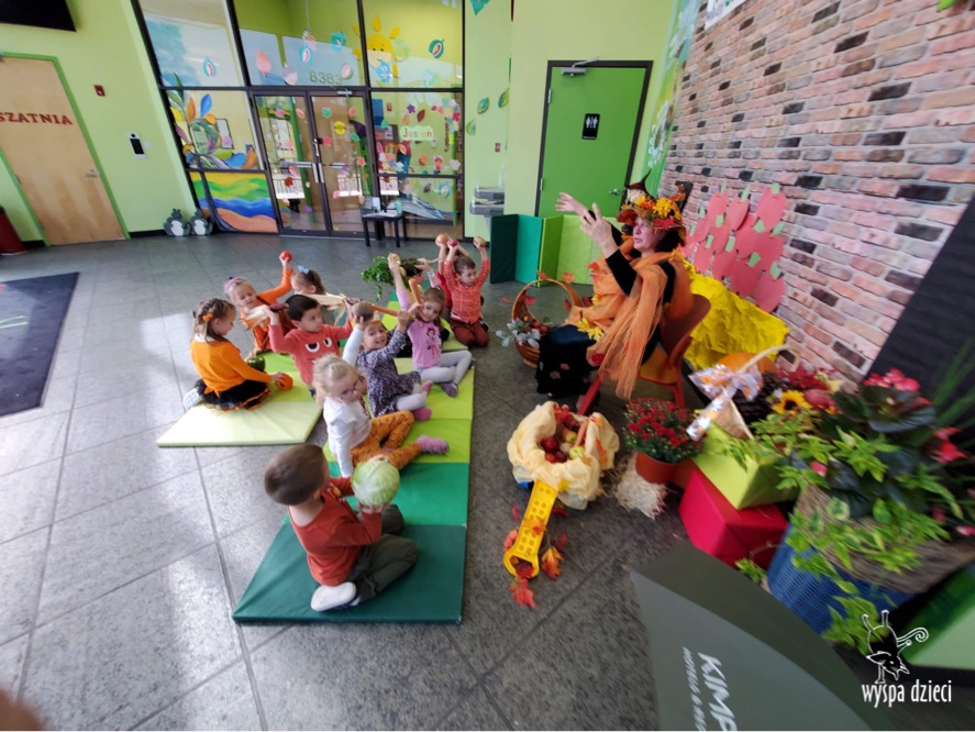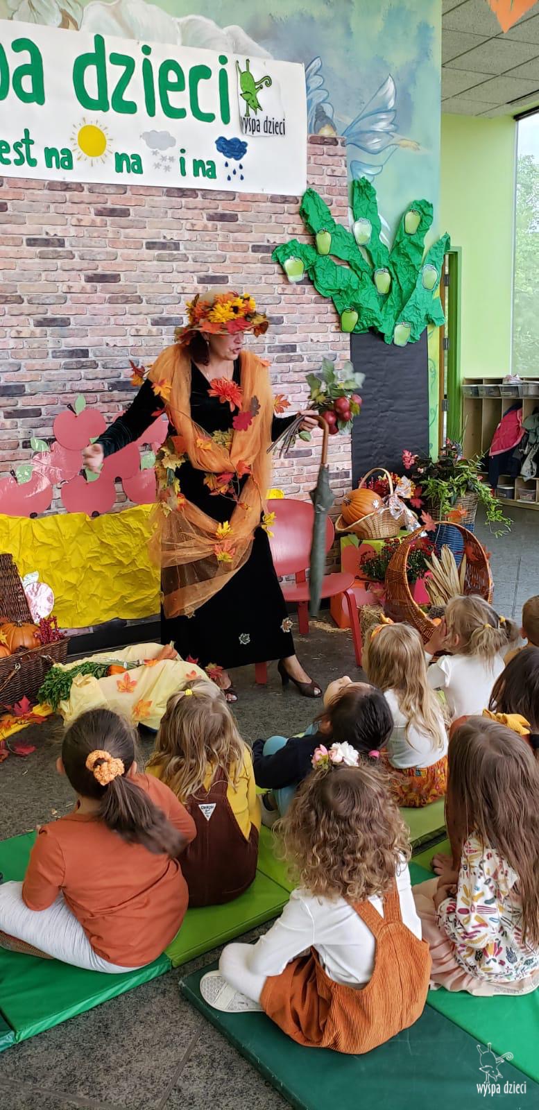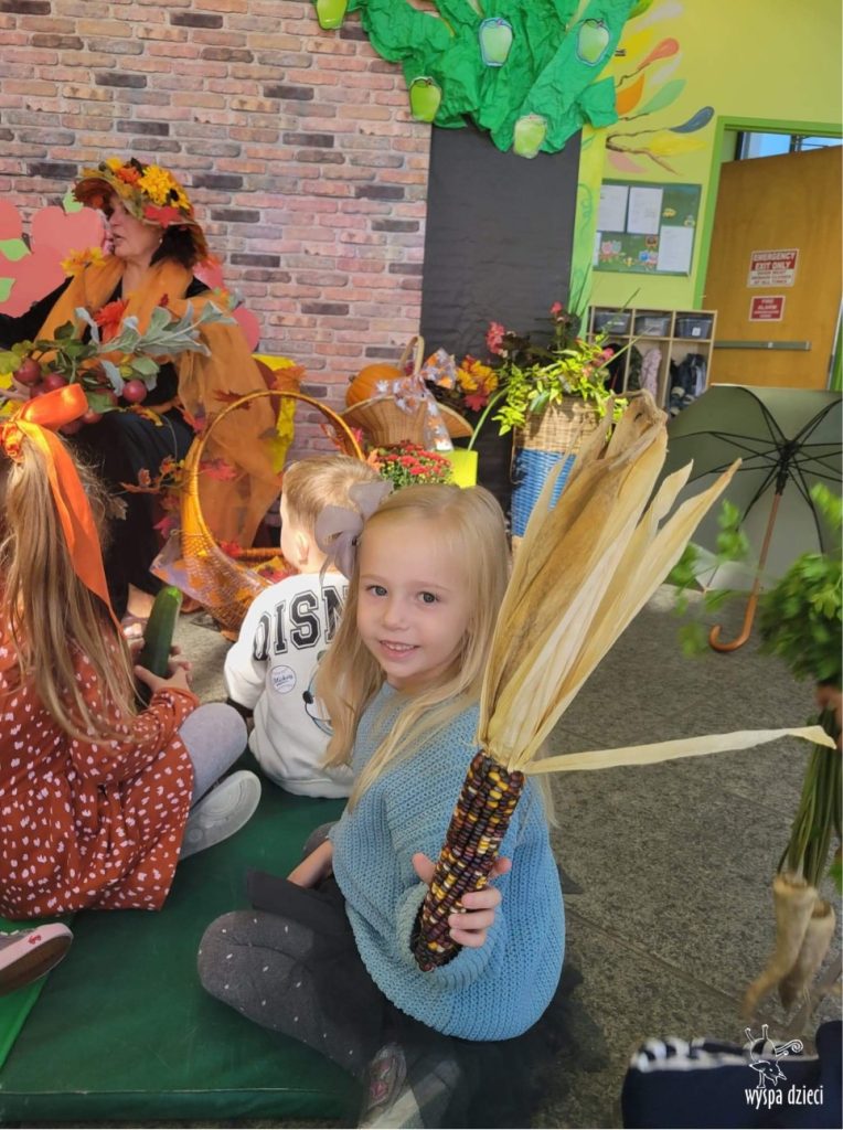 Dnia 23 września w naszej Wyspie Dzieci w River Grove można było spotkać Panią Jesień. Zostala ona powitana przez przedszkolaki z wielkim entuzjazmem, bowiem przybyła do nich w kapeluszu z liscmi w pieknej jesiennej sukni a w koszyczku trzymała ciekawe prezenty. Przyniosła dla dzieci prawdziwe dary jesieni z ogrodu i sadu. Przedszkolaki odgadywaly jesienne zagadki oraz rozpoznawały dary jesieni.