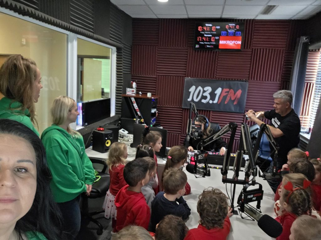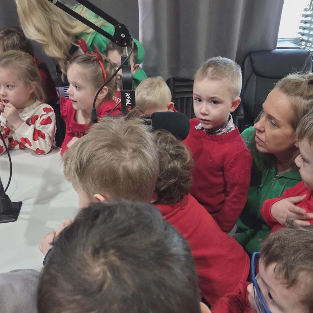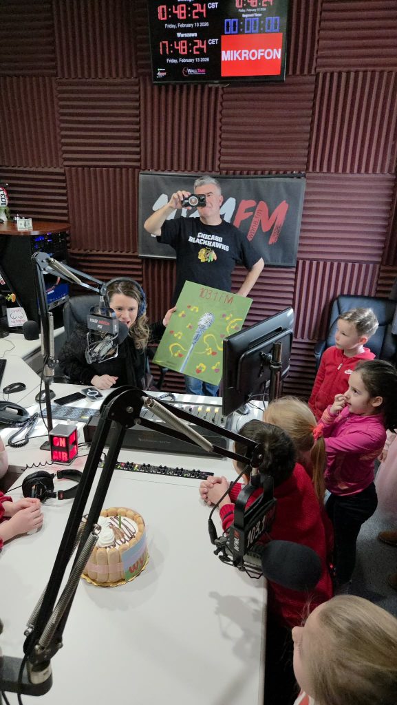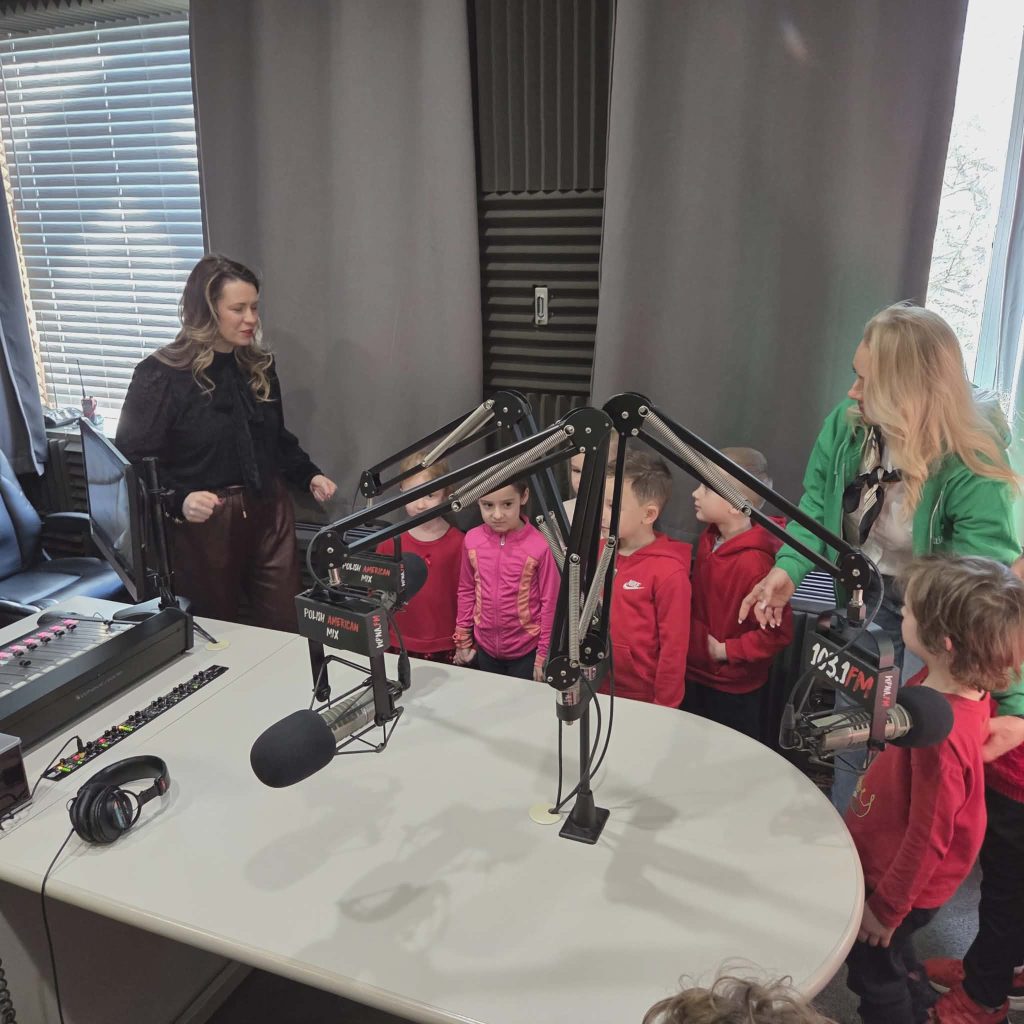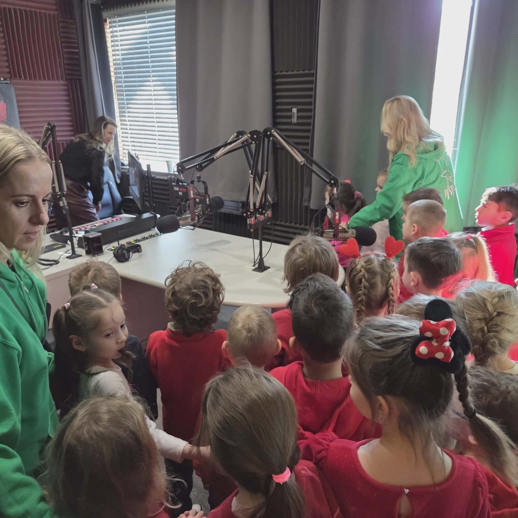 Na początku wizyty dzieci poznały Redaktora Naczelnego Radia – Pana Jacka Niemczyka, który oprowadził wszystkich po siedzibie rozgłośni. Przedszkolaki weszły do studia, w którym audycję na żywo prowadziłą Pani Kasia Popko . Mogły obserwować pracę w radiu i co najważniejsze wziać udział w programie na żywo. Mieliśmy również tort niespodziankę i zaśpiewaliśmy  Sto Lat, ponieważ dokładnie w tym dniu wypada bardzo ważne święto – Światowy Dzień Radia.