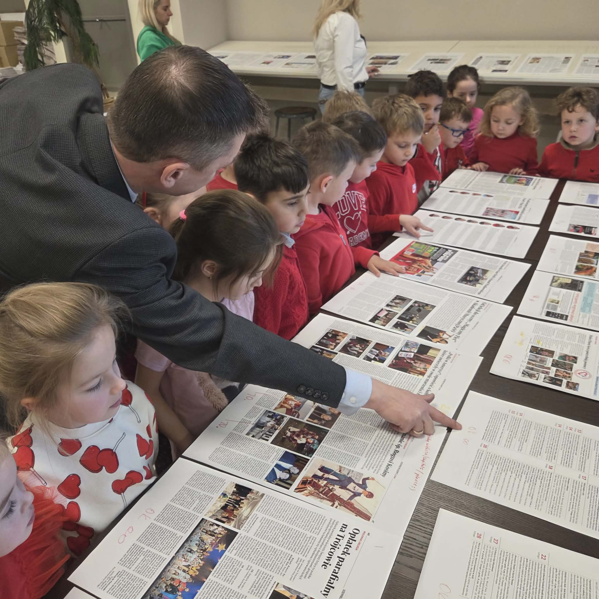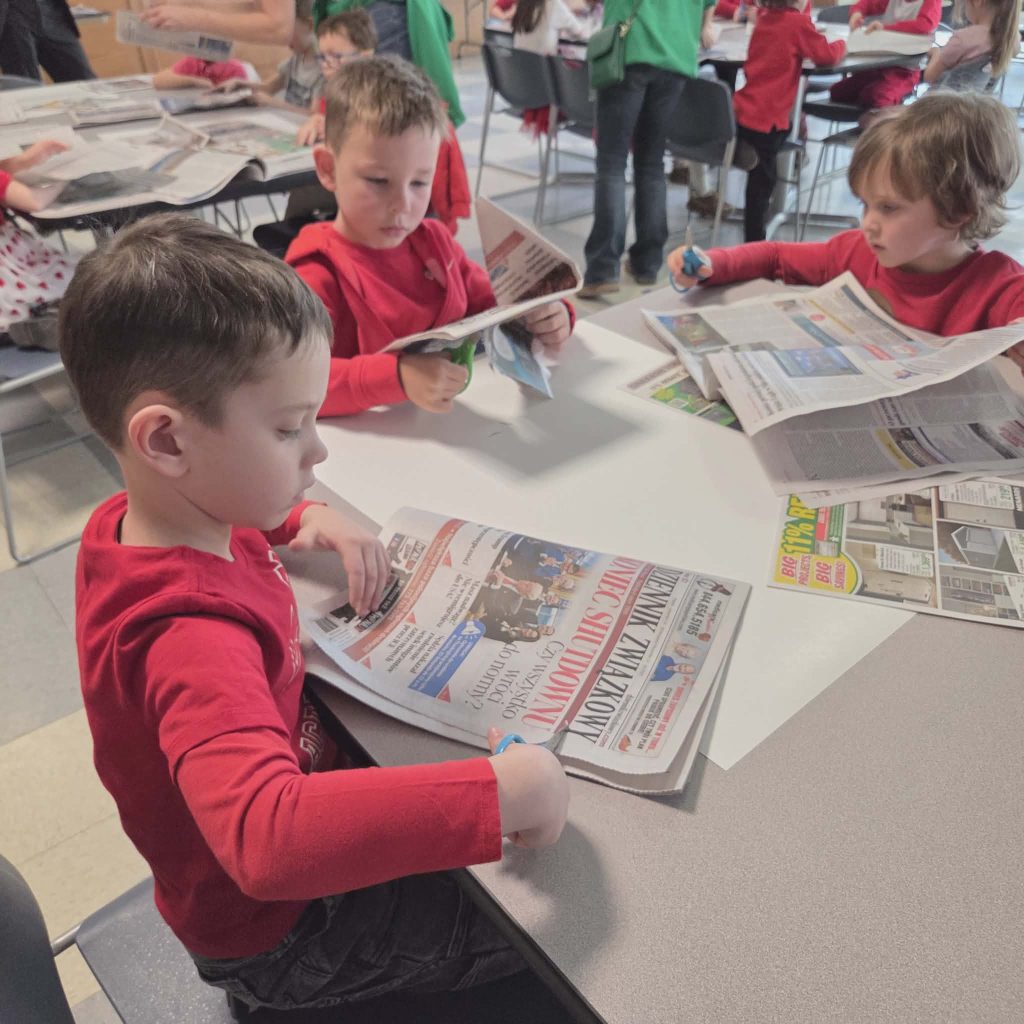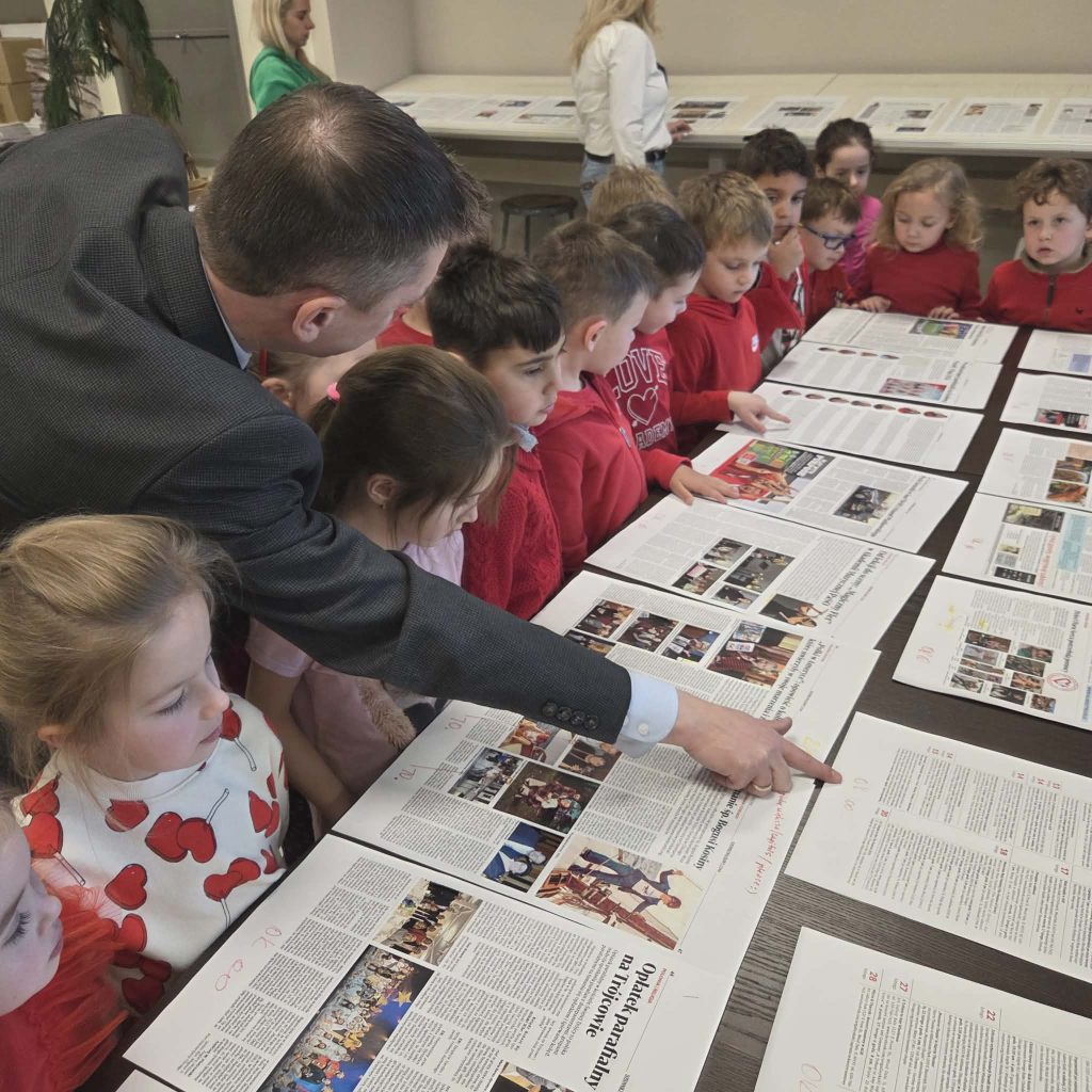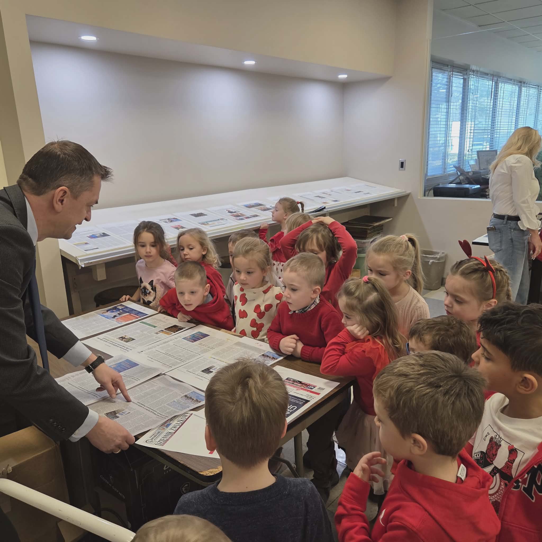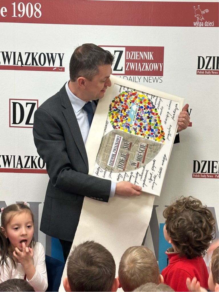 Następnie dzieci przeszły do części gazety „Dziennik Związkowy”. Tam, dyrektor generalny gazety Pan Łukasz Dudka opowiedział dzieciom o pracy w gazecie. Pokazał wiele ciekawych rzeczy oraz podzielił się tajnikami pracy redaktorów. Na koniec naszego pobytu dzieci mogły poczuć się jak prawdziwi redaktorzy , tworząc w małych grupkach swoje gazety.