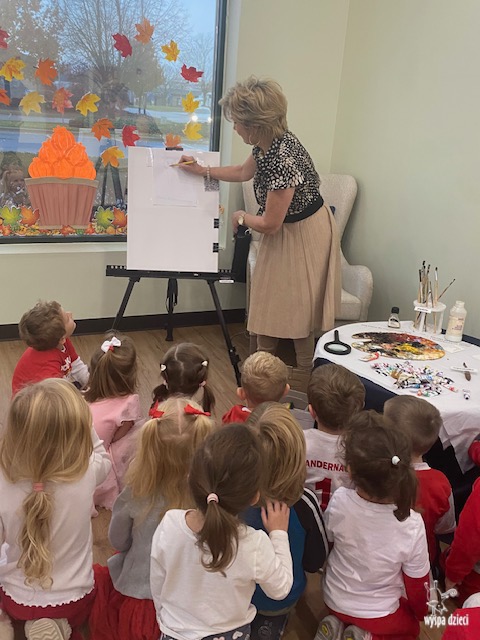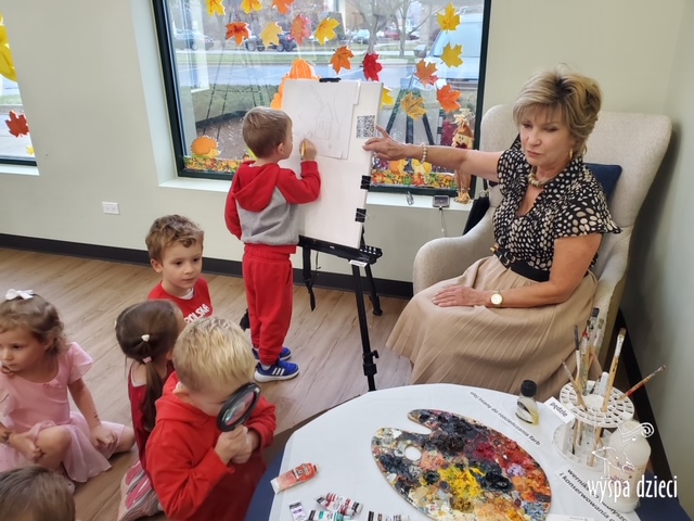 Pani Bożena Żak to urodzona w Polsce profesjonalna artystka specjalizująca się w olejnych kopiach arcydzieł, portretów, pejzaży. Pani Bożena opoweidziała naszym przedszkolakom jak powstaje obraz, dała także naszym maluchom lekcje rysunku, a nasi mali artyści malowali swoje własne obrazy. To było fascynujące przeżycie. Dziękujemy Pani Bożenie za wspaniałą lekcję sztuki.