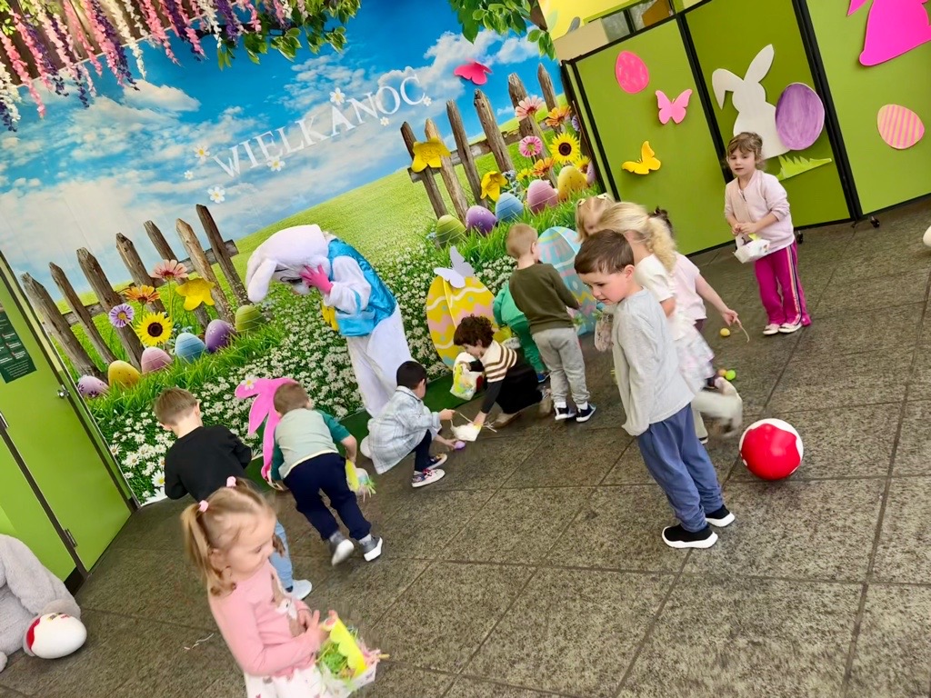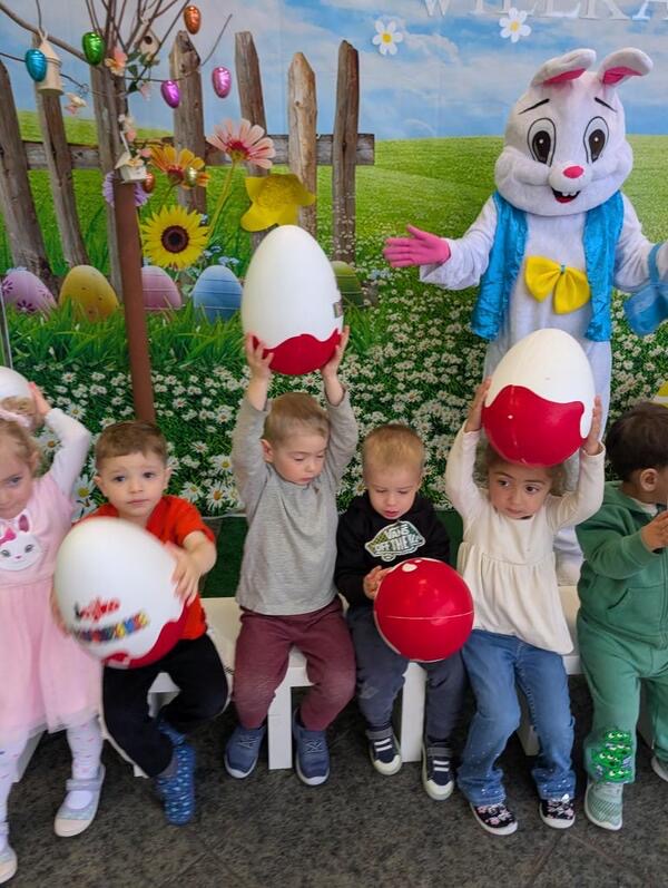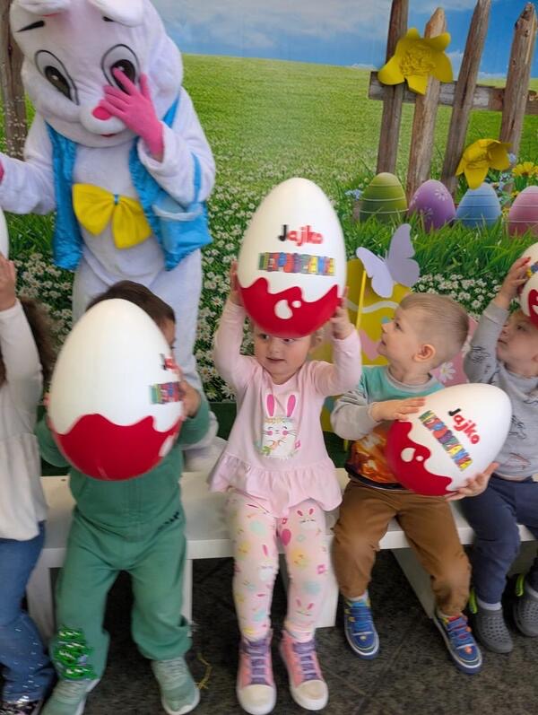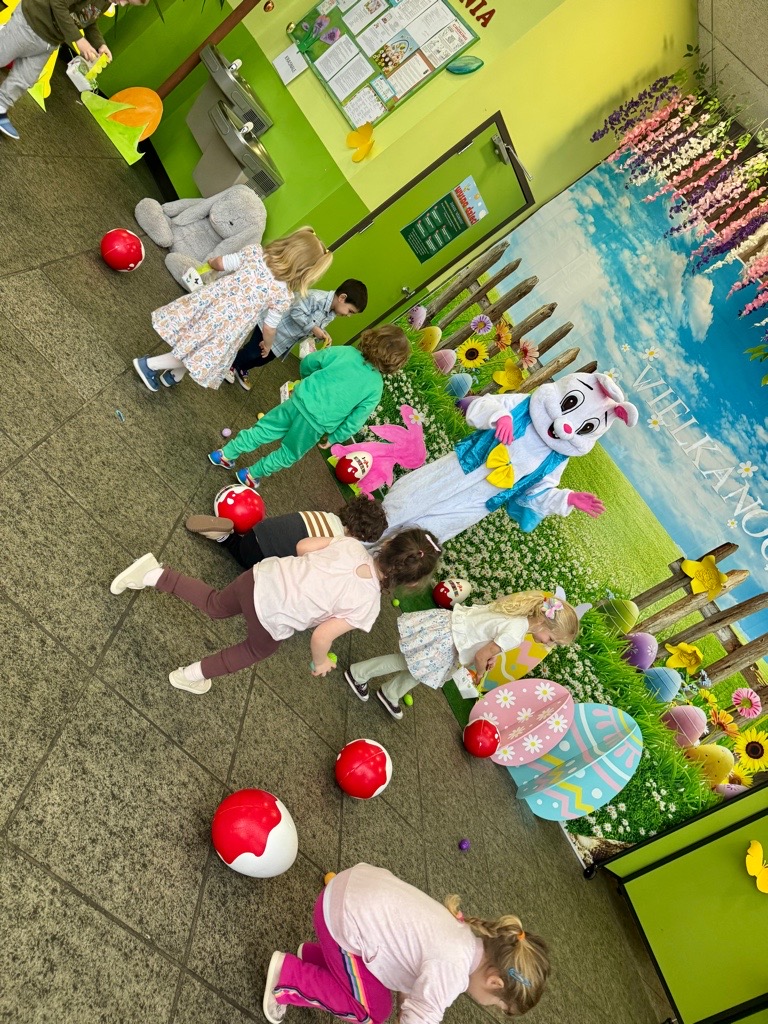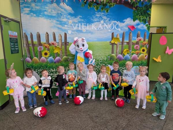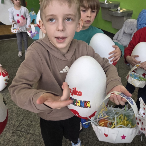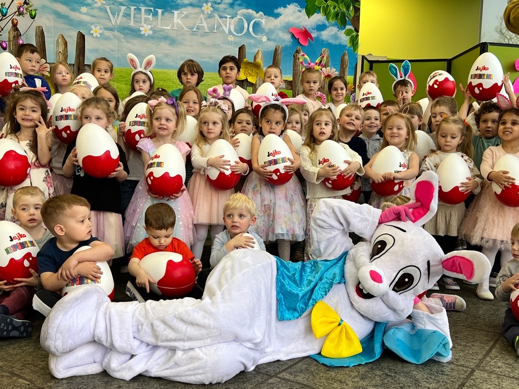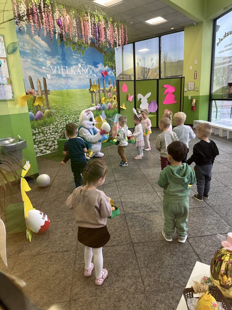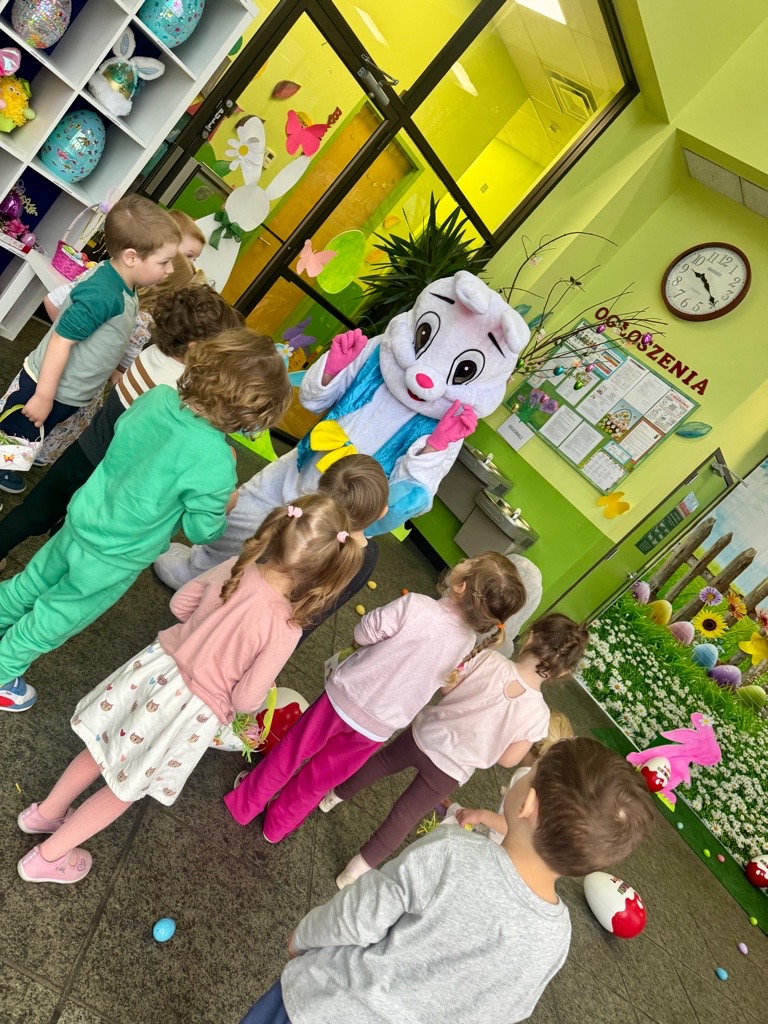 Dla naszych przedszkolaków jedną z najmilszych i najprzyjemniejszych tradycji wielkanocnych jest „Zajączek”. Każdego roku, tuż przed świętami wielkanocnymi nasze przedszkole odwiedza Zajączek. W czwartek 17 kwietnia dzieci z niecierpliwością wypatrywały długo oczekiwanego gościa. Niestety pogoda tego dnia nie była dla nas łaskawa. I z nieba leciały wielkie krople deszczu. Ale dla naszego ZAJĄCA nawet taka pogoda nie jest straszna. Tym razem zrobił naszym przedszkolakom niespodziankę chowając w naszym głównym korytarzu mnóstwo jajeczek wypełnionych niespodziankami. Wszystkie przedszkolaki wcześniej ze swoimi nauczycielami wykonały koszyczki. Dzieci z wypiekami na twarzy zbierały jajeczka do wcześniej przygotowanych koszyczków. Kolejną niespodzianką były dla wszystkich dzieci ogromne jaja, do których dzieci mogły włożyć jajka niespodzianki.