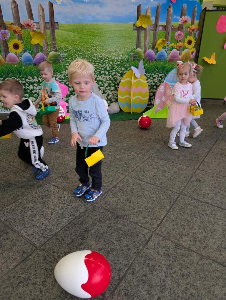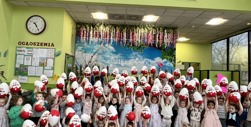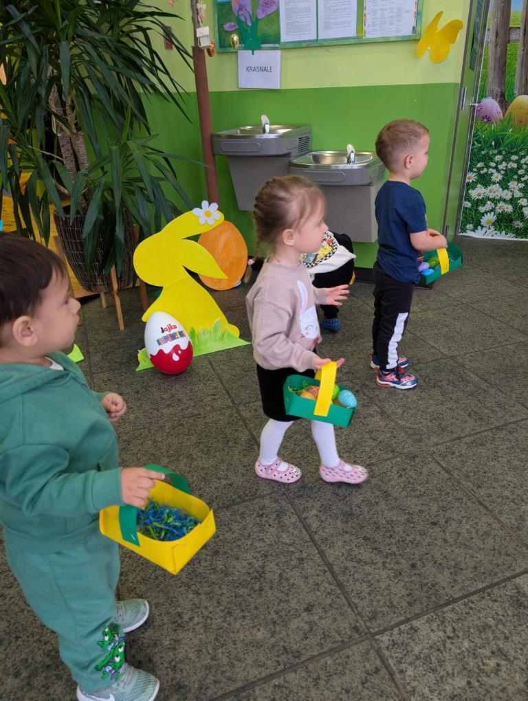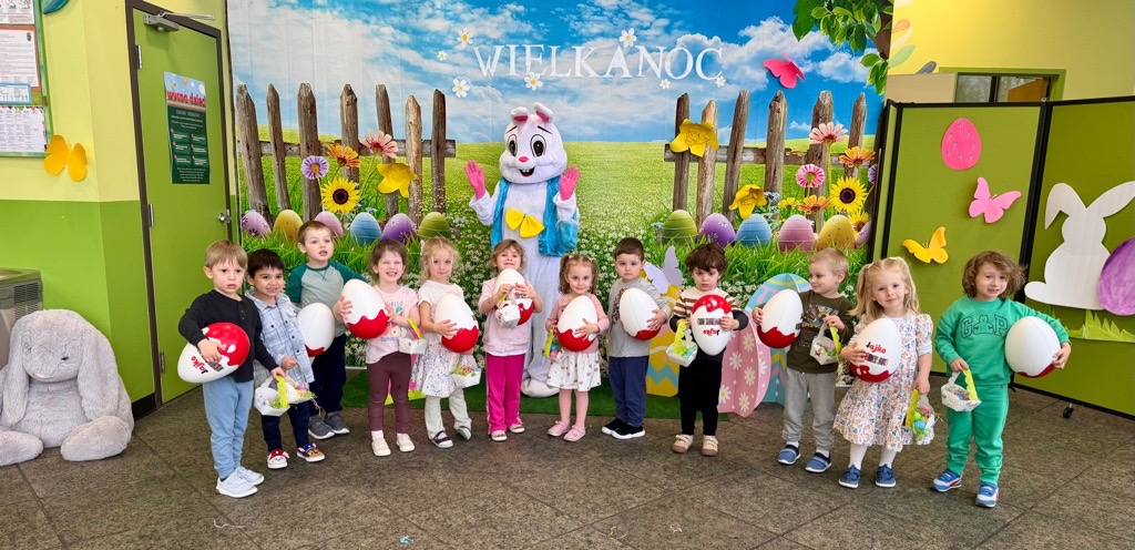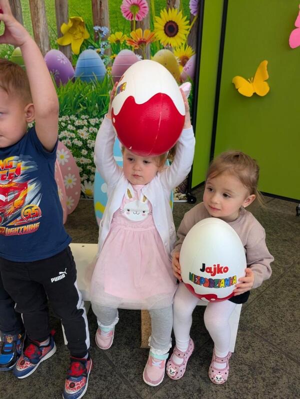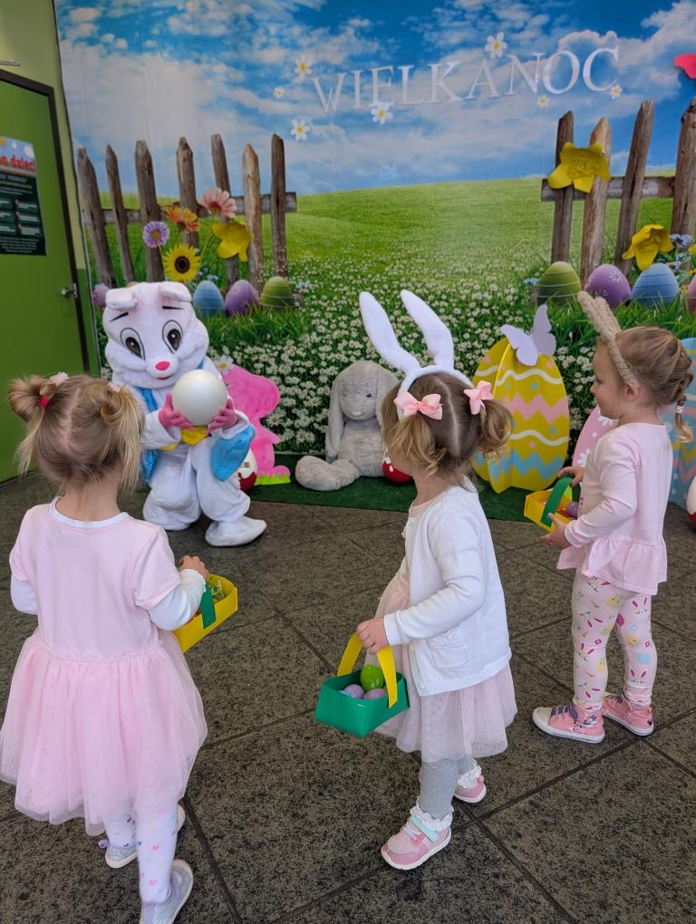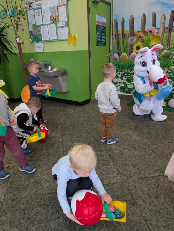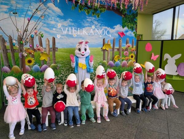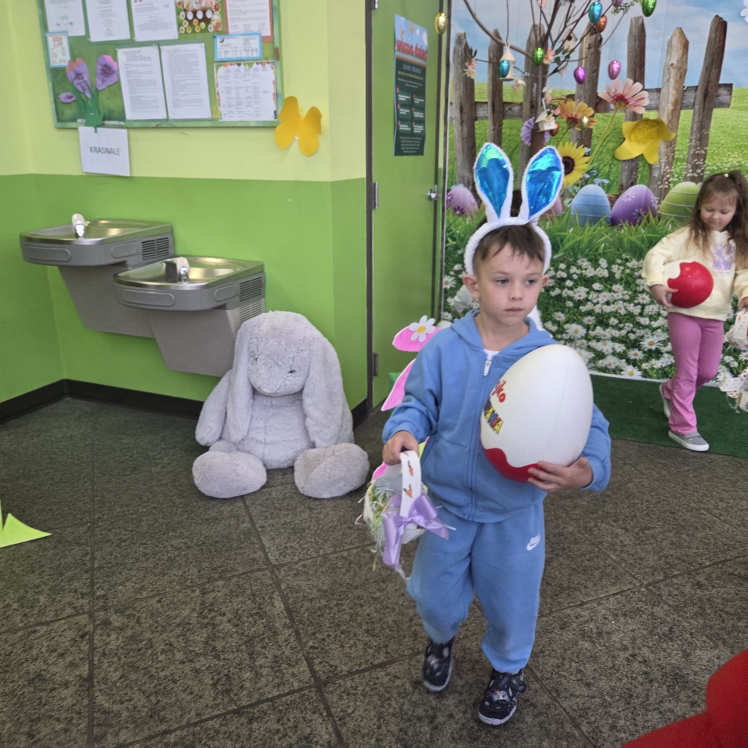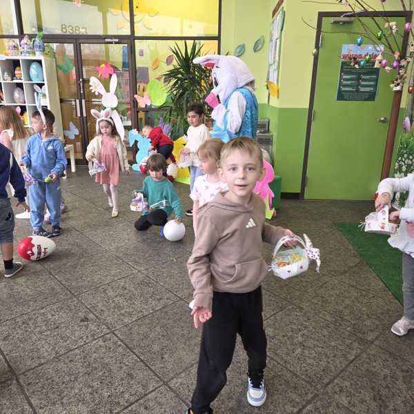 Dla naszych przedszkolaków jedną z najmilszych i najprzyjemniejszych tradycji wielkanocnych jest „Zajączek”. Każdego roku, tuż przed świętami wielkanocnymi nasze przedszkole odwiedza Zajączek. W czwartek 17 kwietnia dzieci z niecierpliwością wypatrywały długo oczekiwanego gościa. Niestety pogoda tego dnia nie była dla nas łaskawa. I z nieba leciały wielkie krople deszczu. Ale dla naszego ZAJĄCA nawet taka pogoda nie jest straszna. Tym razem zrobił naszym przedszkolakom niespodziankę chowając w naszym głównym korytarzu mnóstwo jajeczek wypełnionych niespodziankami. Wszystkie przedszkolaki wcześniej ze swoimi nauczycielami wykonały koszyczki. Dzieci z wypiekami na twarzy zbierały jajeczka do wcześniej przygotowanych koszyczków. Kolejną niespodzianką były dla wszystkich dzieci ogromne jaja, do których dzieci mogły włożyć jajka niespodzianki.