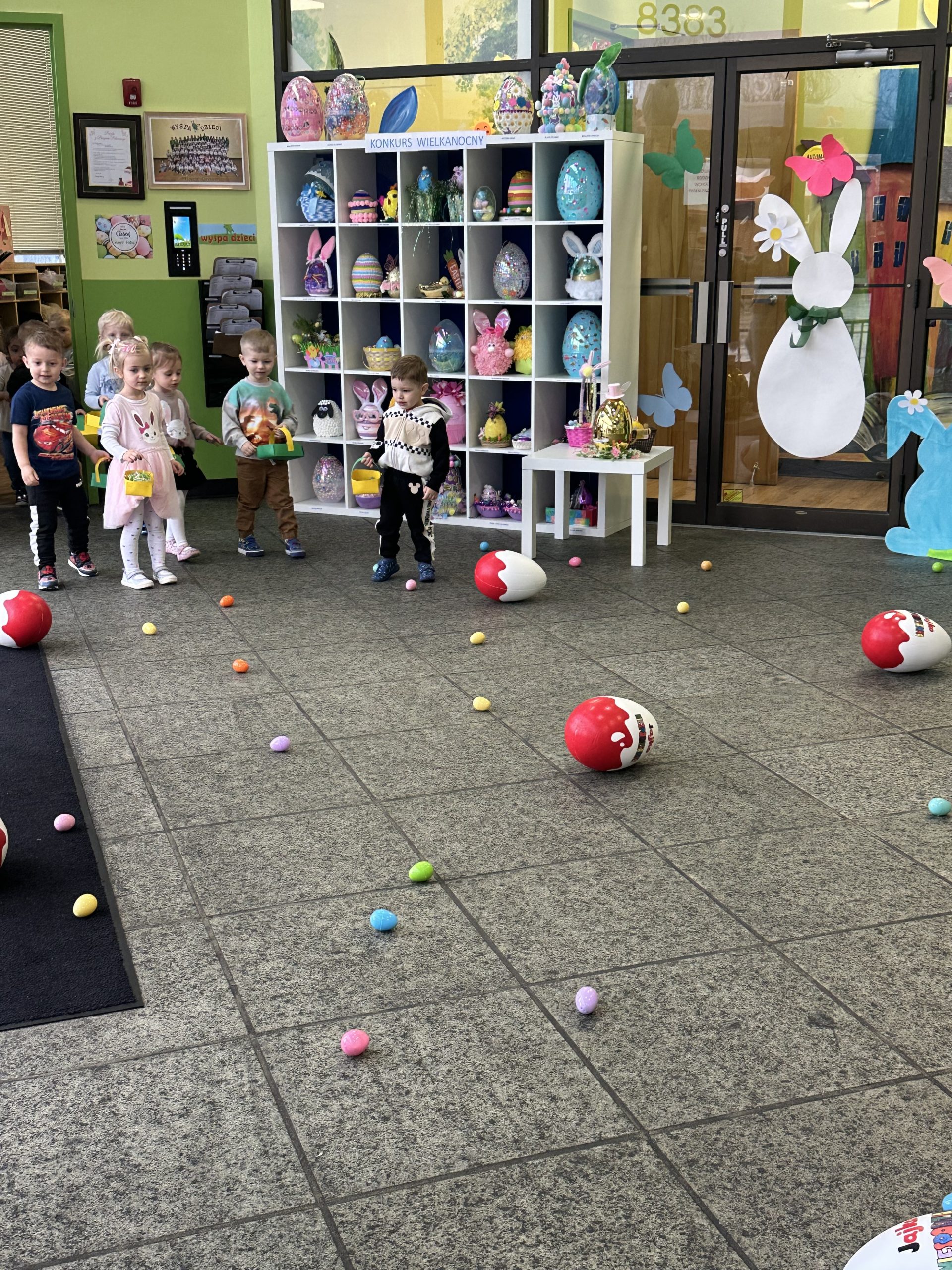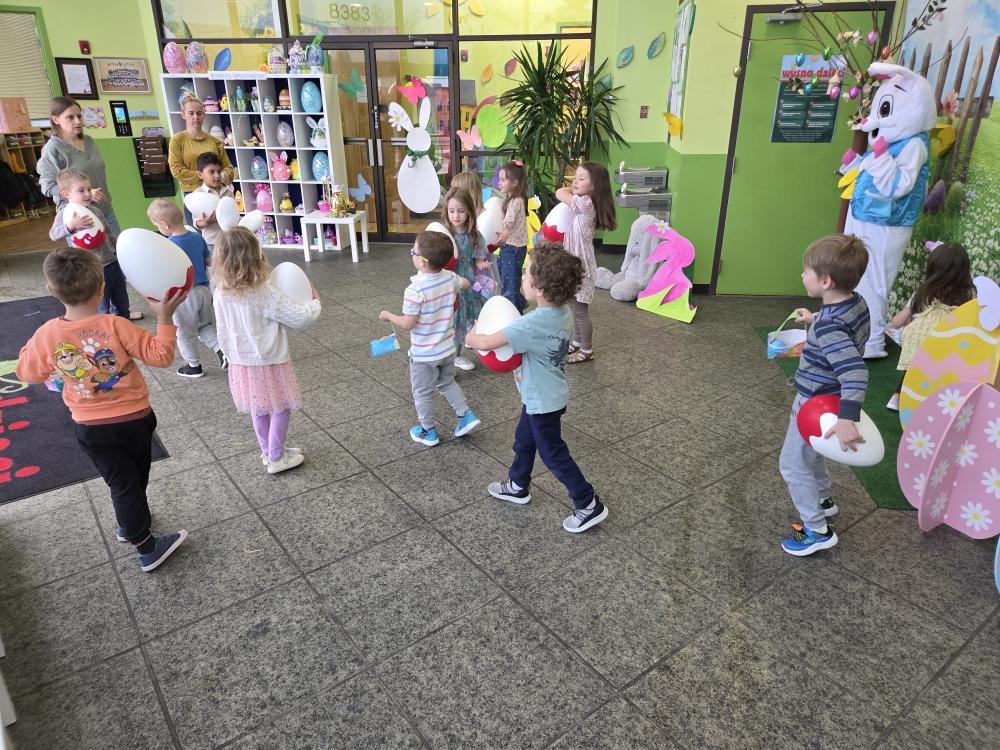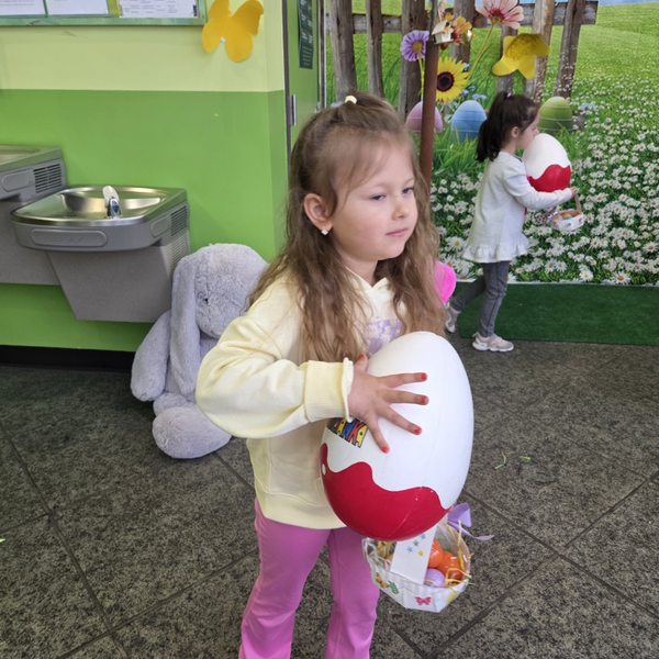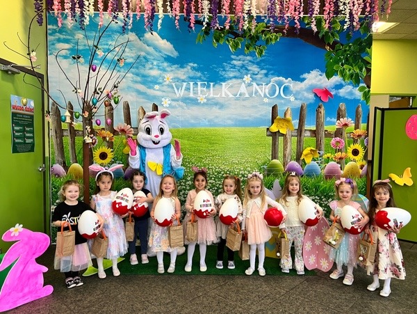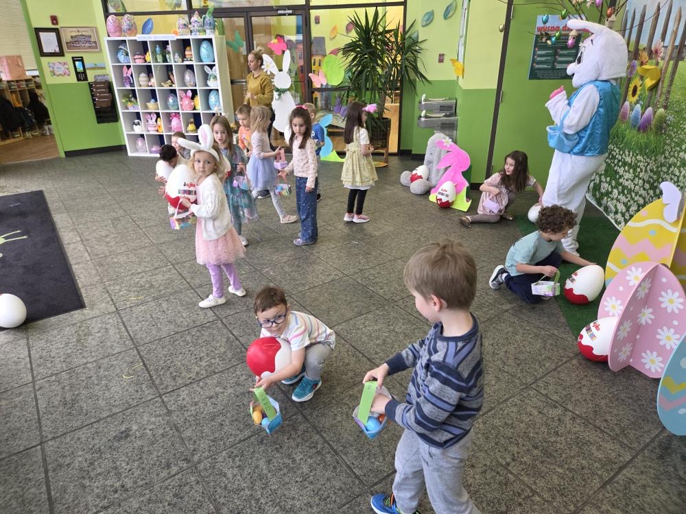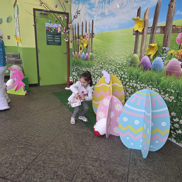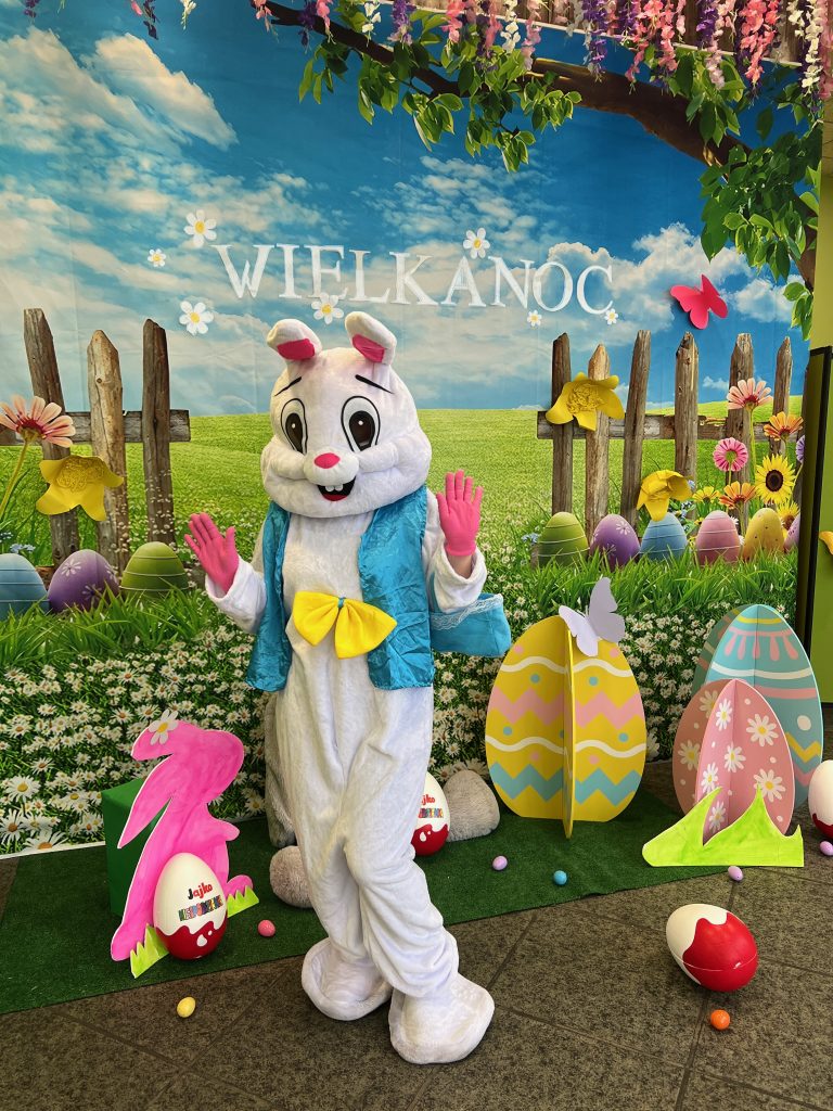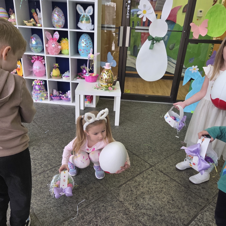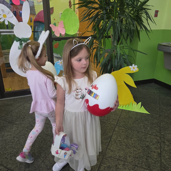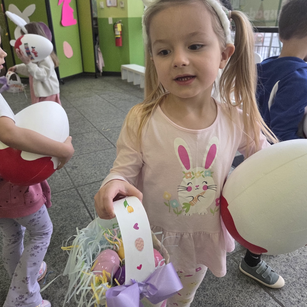 Dla naszych przedszkolaków jedną z najmilszych i najprzyjemniejszych tradycji wielkanocnych jest „Zajączek”. Każdego roku, tuż przed świętami wielkanocnymi nasze przedszkole odwiedza Zajączek. W czwartek 17 kwietnia dzieci z niecierpliwością wypatrywały długo oczekiwanego gościa. Niestety pogoda tego dnia nie była dla nas łaskawa. I z nieba leciały wielkie krople deszczu. Ale dla naszego ZAJĄCA nawet taka pogoda nie jest straszna. Tym razem zrobił naszym przedszkolakom niespodziankę chowając w naszym głównym korytarzu mnóstwo jajeczek wypełnionych niespodziankami. Wszystkie przedszkolaki wcześniej ze swoimi nauczycielami wykonały koszyczki. Dzieci z wypiekami na twarzy zbierały jajeczka do wcześniej przygotowanych koszyczków. Kolejną niespodzianką były dla wszystkich dzieci ogromne jaja, do których dzieci mogły włożyć jajka niespodzianki.