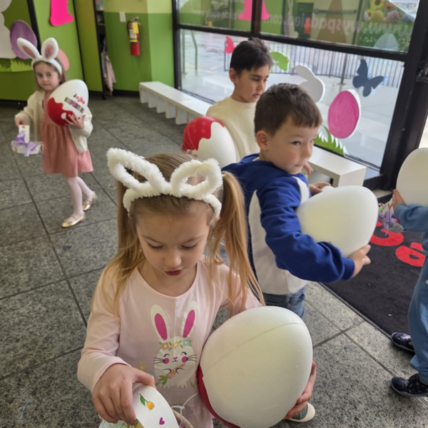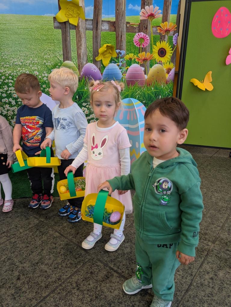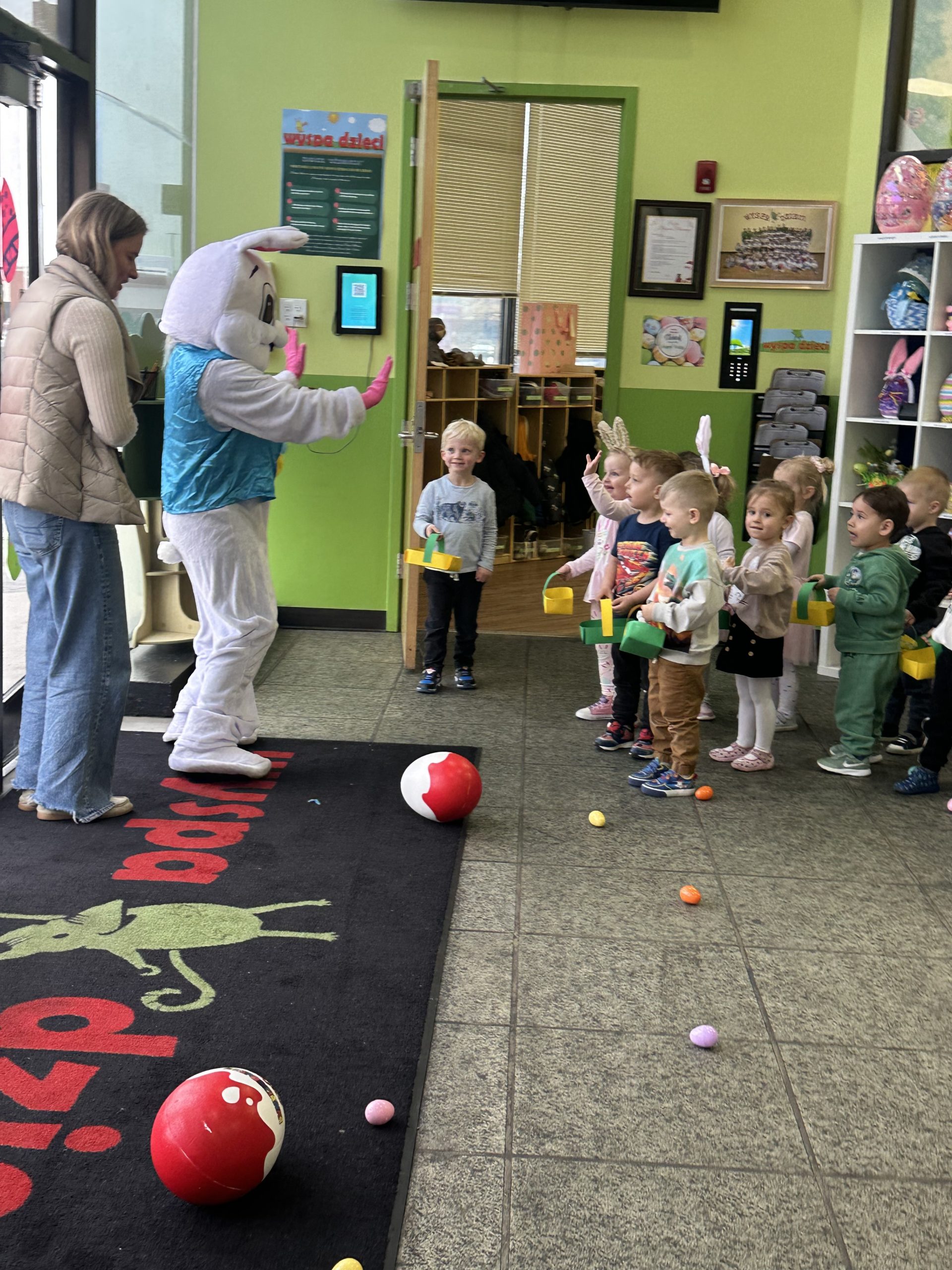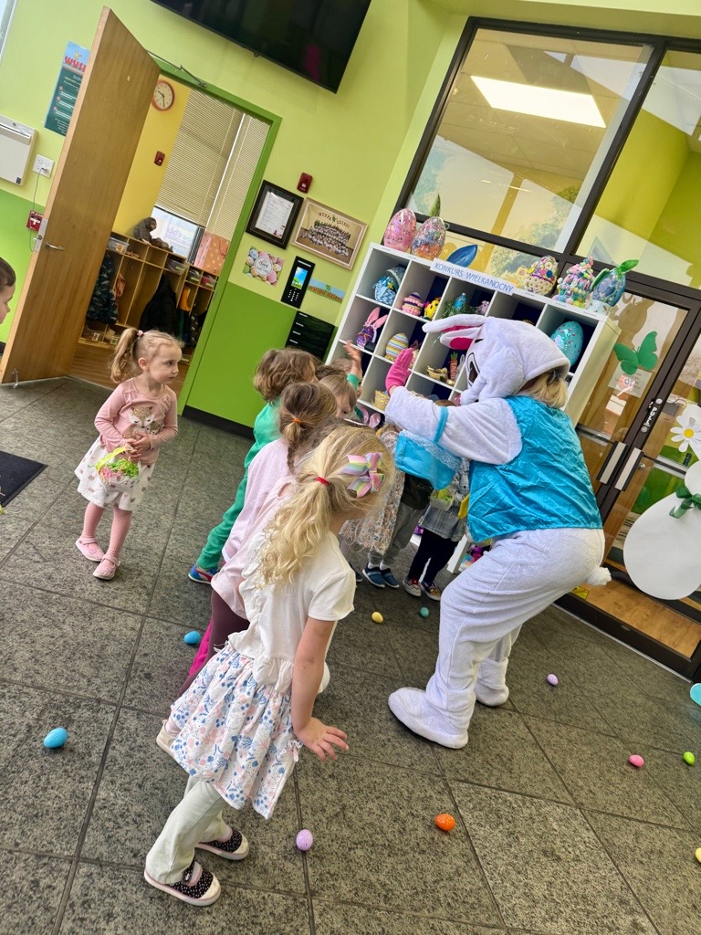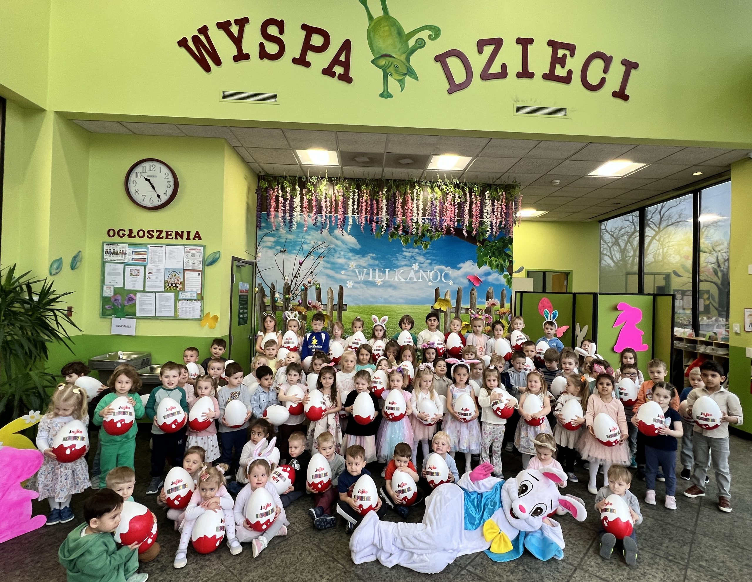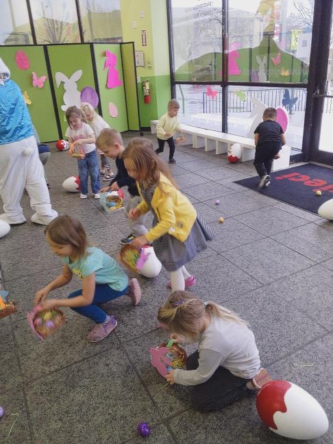 Dla naszych przedszkolaków jedną z najmilszych i najprzyjemniejszych tradycji wielkanocnych jest „Zajączek”. Każdego roku, tuż przed świętami wielkanocnymi nasze przedszkole odwiedza Zajączek. W czwartek 17 kwietnia dzieci z niecierpliwością wypatrywały długo oczekiwanego gościa. Niestety pogoda tego dnia nie była dla nas łaskawa. I z nieba leciały wielkie krople deszczu. Ale dla naszego ZAJĄCA nawet taka pogoda nie jest straszna. Tym razem zrobił naszym przedszkolakom niespodziankę chowając w naszym głównym korytarzu mnóstwo jajeczek wypełnionych niespodziankami. Wszystkie przedszkolaki wcześniej ze swoimi nauczycielami wykonały koszyczki. Dzieci z wypiekami na twarzy zbierały jajeczka do wcześniej przygotowanych koszyczków. Kolejną niespodzianką były dla wszystkich dzieci ogromne jaja, do których dzieci mogły włożyć jajka niespodzianki.