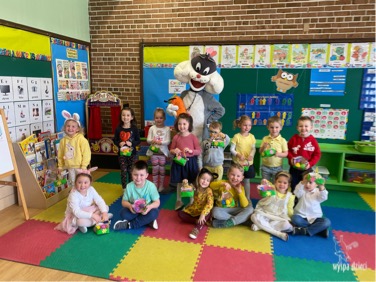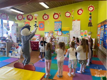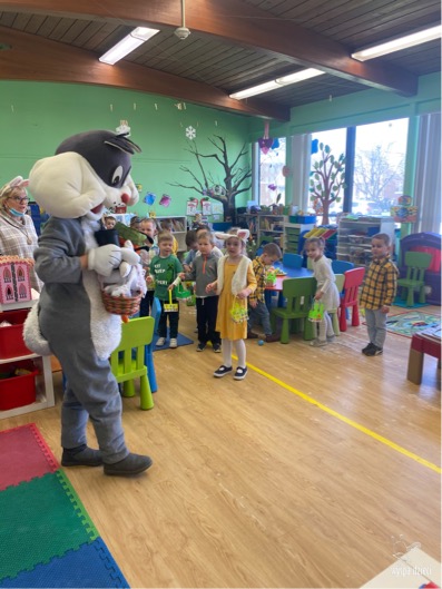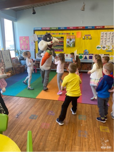W naszym przedszkolu bardzo starannie przygotowywaliśmy się do przyjścia Zajączka Wielkanocnego. Wszystkie grupy wykonywały projekt – koszyczek wielkanocny. Wreszcie nadszedł ten wyjątkowy dzień, środa 31 marca. Już od rana dzieci czekały na Zajączka. I pojawił się… Radosny, uśmiechnięty, pełen świątecznego humoru. Zaprosił on przedszkolaków do wspólnego tańca. A potem …. pochował on w klasach jajeczka. Wszyscy mieli ogromna frajdę . Ile przy tym było radości i śmiechu. Był to dzień pełen wrażeń i radości.
