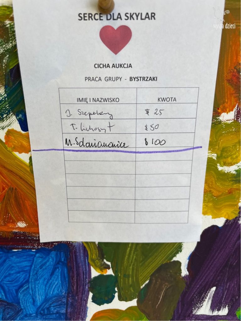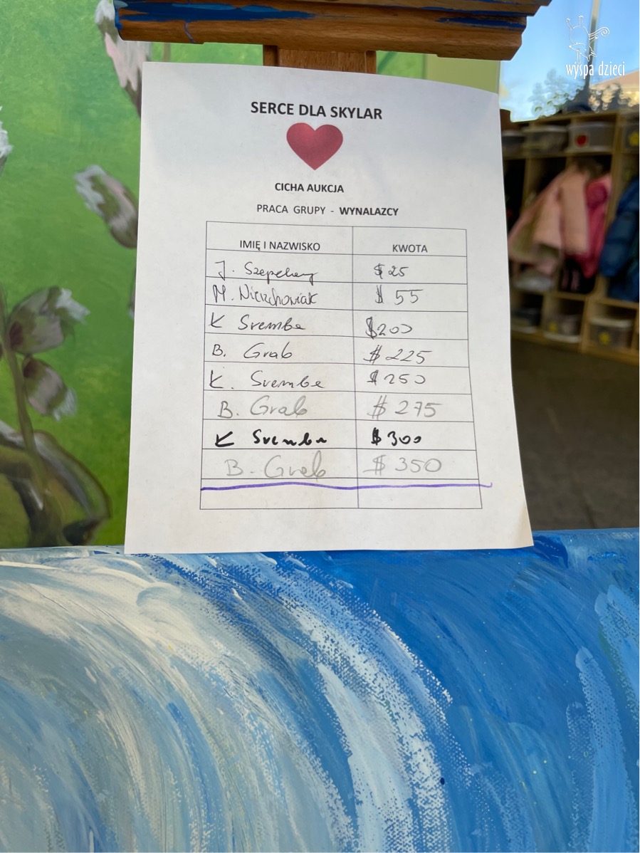 Drodzy Rodzice i przyjaciele Wyspy Dzieci w River Grove. W piątek zakonczylismy nasza akcje – SERCE DLA SKYLAR. Dziękujemy Wam pięknie za ogromne Wasze serce, za wszystkie datki i wsparcie naszej Akcji. Dziękujemy osobom, które wzięły udział w naszej loterii oraz w naszej licytacji pięknych prac przedszkolaków i nauczycieli, dziękujemy za wzięcie udziału w rodzinnym konkursie na najpiękniejszą dynie oraz za zakup tych cudnych dyni. Duże podziękowania składamy również babci Gabrysi Solowianowicz, która przygotowała własnoręcznie przepiękne bombki, jak również Pani Iwonie Tom która wykonała skrzydła na cichą aukcje. Dziękujemy również rodzicom za wszystkie pyszne ciasta i słodkości które przynosiliście w tym tygodniu. Oczywiście loteria absolutnie nie odbyłaby się gdyby nie pomoc firmy Lowell Food i rodziców naszej Atheny z grupy Poszukiwaczy. To dzięki Państwu Zyzynski otrzymaliśmy z Lowell Food wszystkie rzeczy na loterie włącznie z rowerami.