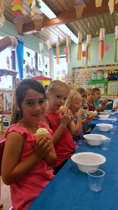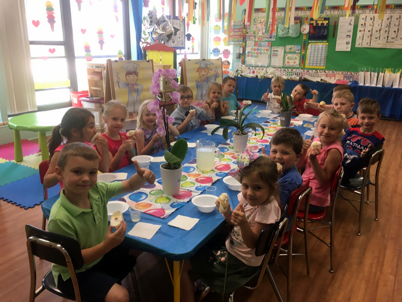 Następnie nasi milusińscy otrzymali dyplomy, foldery oraz pamiątkowe zdjęcia. Wisienką na torcie było przyjęcie zorganizowane przez wychowawczynie Odkrywców, p. Sylwię Wilk i p. Sare Sieminski. Przy pięknie nakrytym stole, Odkrywcy wraz ze swoimi nauczycielkami wspominali wspólnie przeżyte chwile, zajadając się przepysznymi, domowej roboty babeczkami z bitą śmietaną i popijając orzeźwiającą lemoniadę. Okrzykom radości oraz wybuchom śmiechu nie było końca.