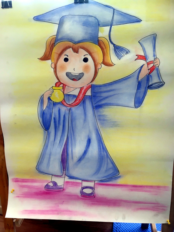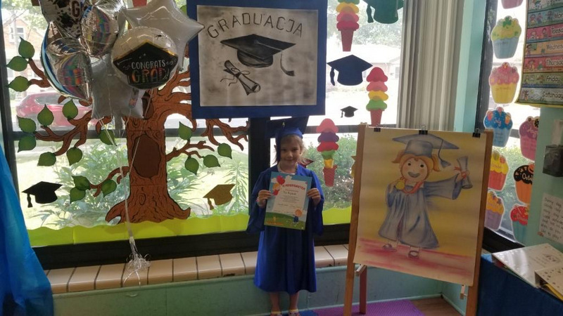Nietypowe zakończenie roku odbyło się w pięknie udekorowanej klasie Odkrywców. Nasi wspaniali, elegancko ubrani uczniowie rozpoczęli świętowanie swego ostatniego dnia w kindergarten od wykonania tradycyjnej rozgrzewki, obejrzeli filmik- niespodziankę oraz przepięknie odśpiewali wzruszająca, pożegnalną piosenkę.