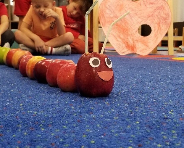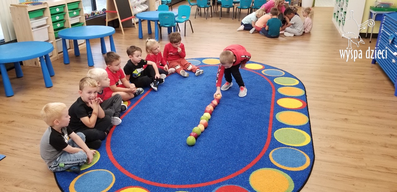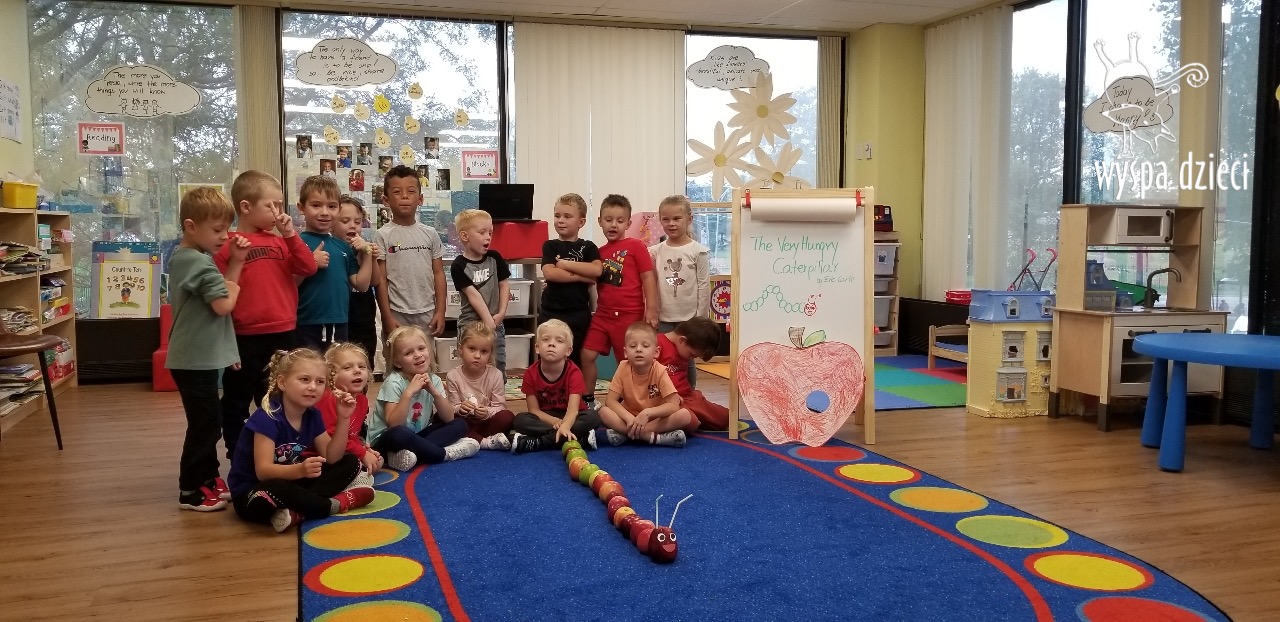 Grupa PreK – WYNALAZCY- z Wyspy Dzieci River Grove w bardzo kreatywny sposób obchodziły ŚWIATOWY DZIEŃ JABŁKA. Wszystkie dzieci w tym dniu przyniosły do przedszkola jabłka z których powstała GĄSIENICĄ. Ten pomysł zrodził się po zaprezentowaniu przez nauczycielki panią Ewę oraz panią Joanne książki pt. „ The Very Hungry Caterpillar”