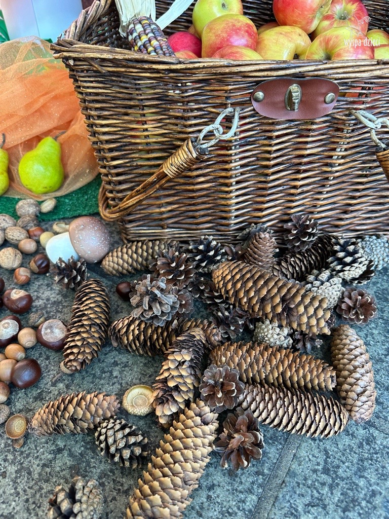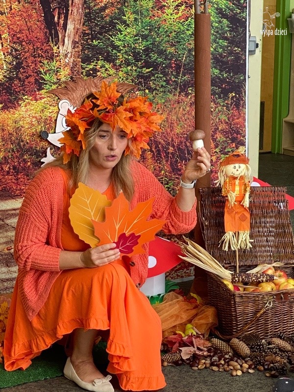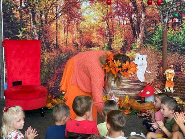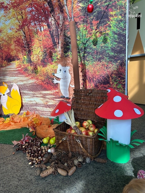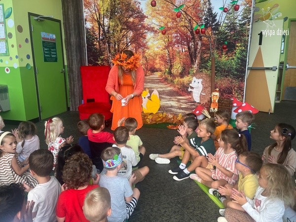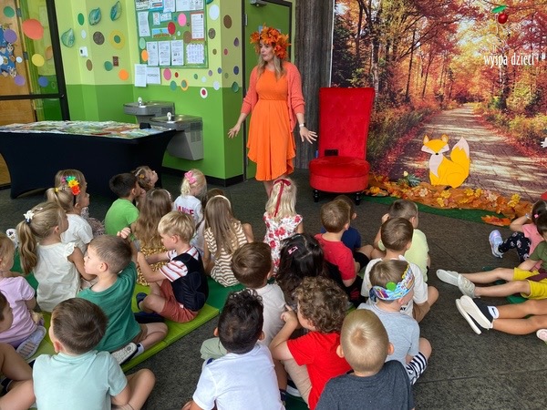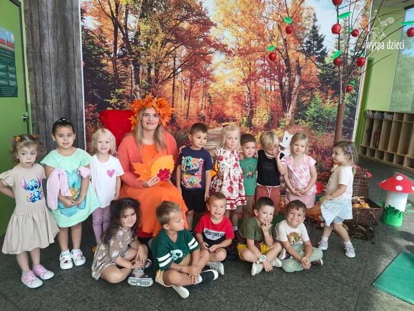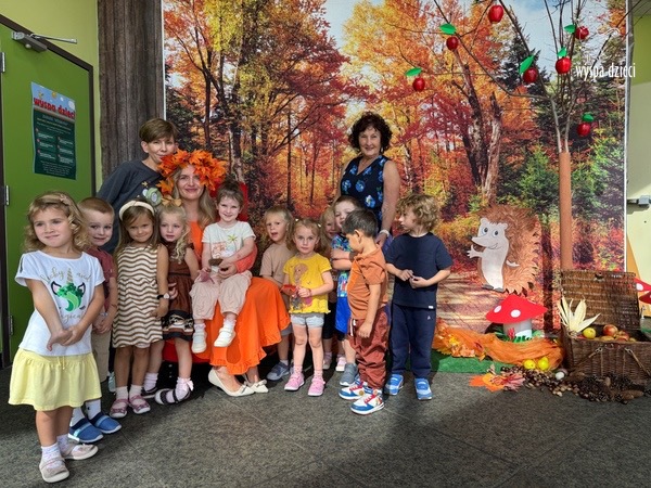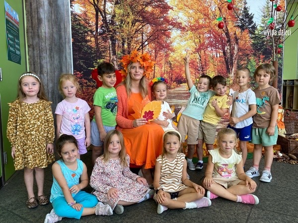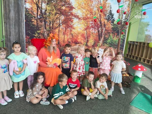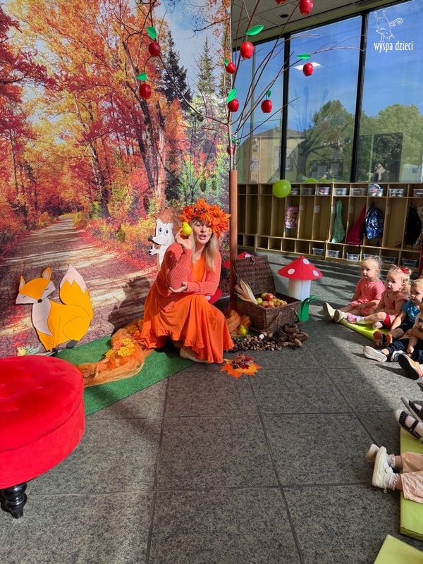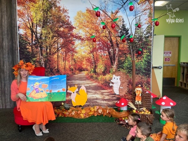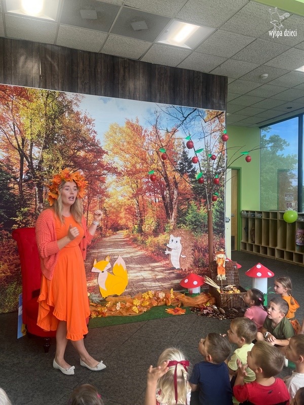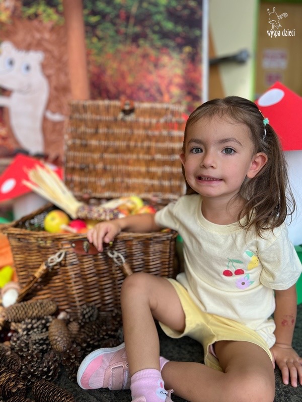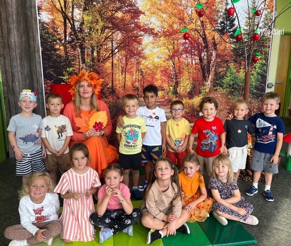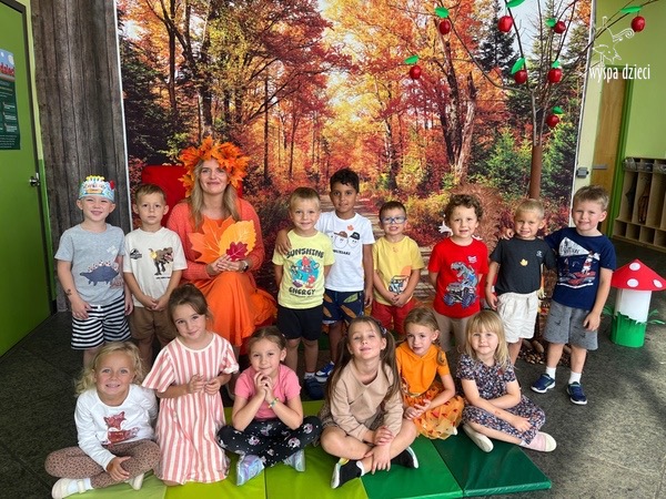 Dzisiaj, czyli w poniedziałek 22 września zawitała do Wyspy Dzieci River Grove  Pani Jesień. Przyniosła ona naszym przedszkolakom wiele jesiennych darów: owoce, warzywa, kasztany, żołędzie, jesienne kwiaty. Dzieci odgadywały jesienne zagadki i zapoznawały się z cechami aktualnej pory roku. Tego dnia królowały barwy jesieni: żółty, czerwony, brązowy oraz pomarańczowy.