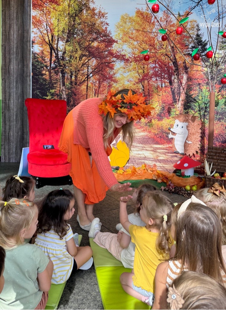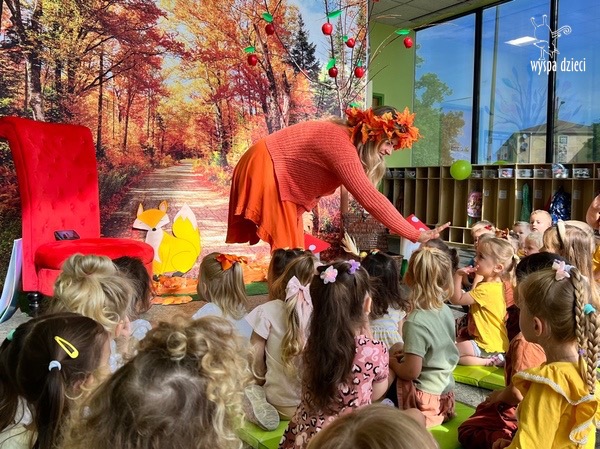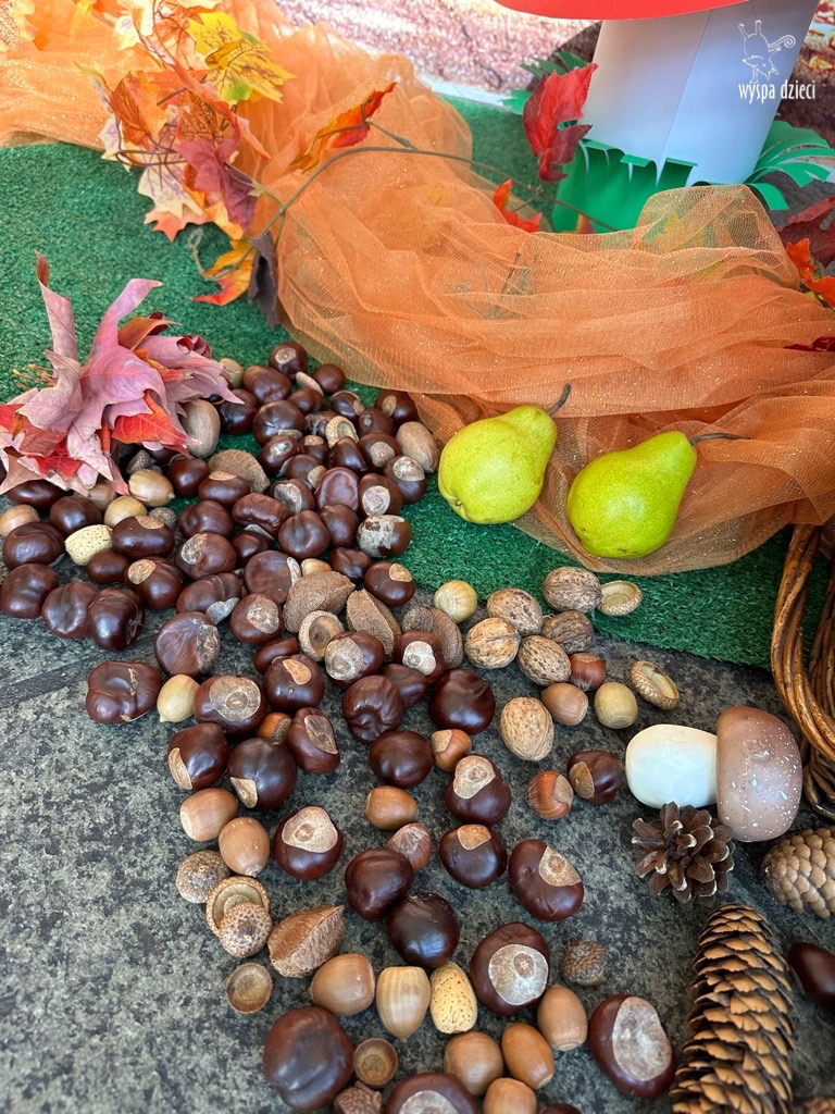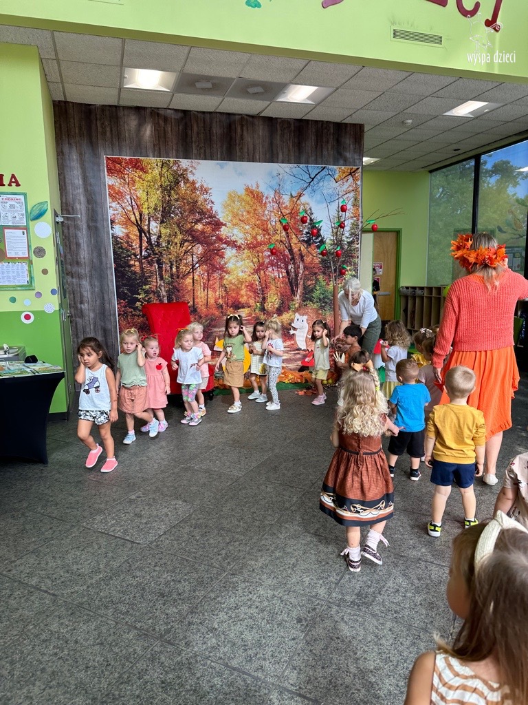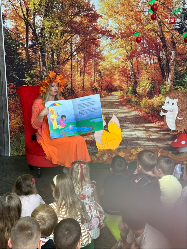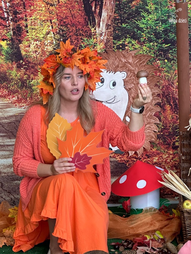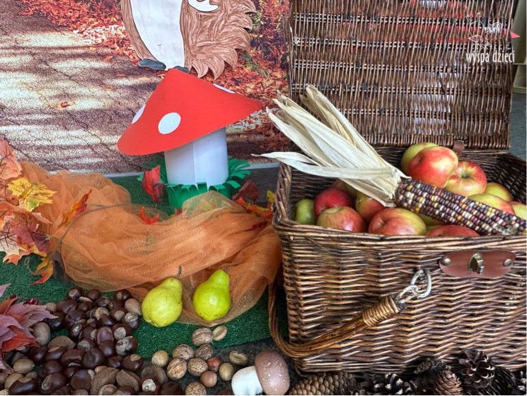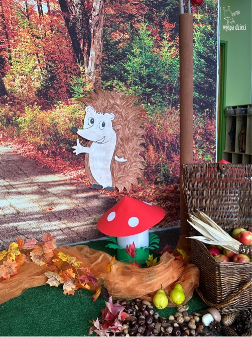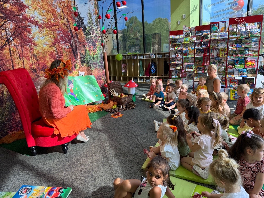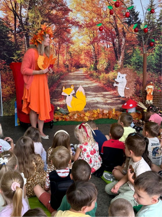 Dzisiaj, czyli w poniedziałek 22 września zawitała do Wyspy Dzieci River Grove  Pani Jesień. Przyniosła ona naszym przedszkolakom wiele jesiennych darów: owoce, warzywa, kasztany, żołędzie, jesienne kwiaty. Dzieci odgadywały jesienne zagadki i zapoznawały się z cechami aktualnej pory roku. Tego dnia królowały barwy jesieni: żółty, czerwony, brązowy oraz pomarańczowy.